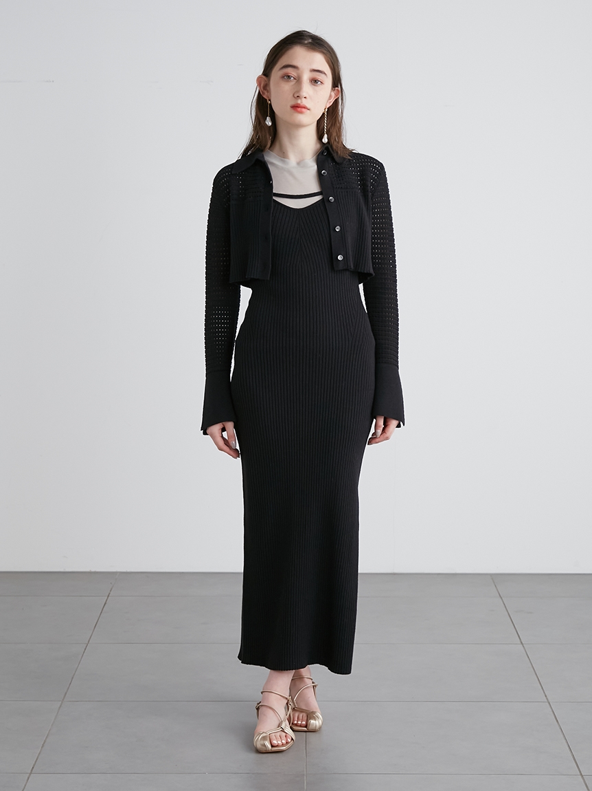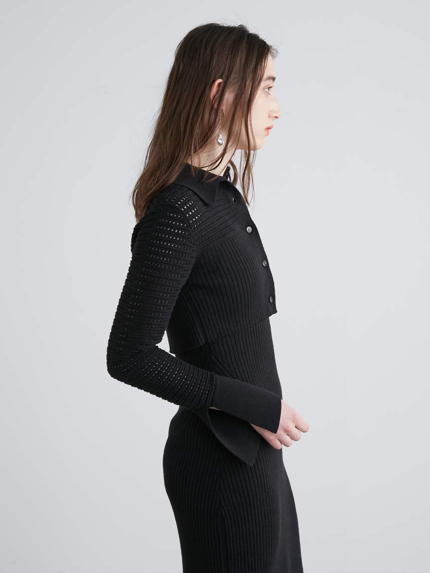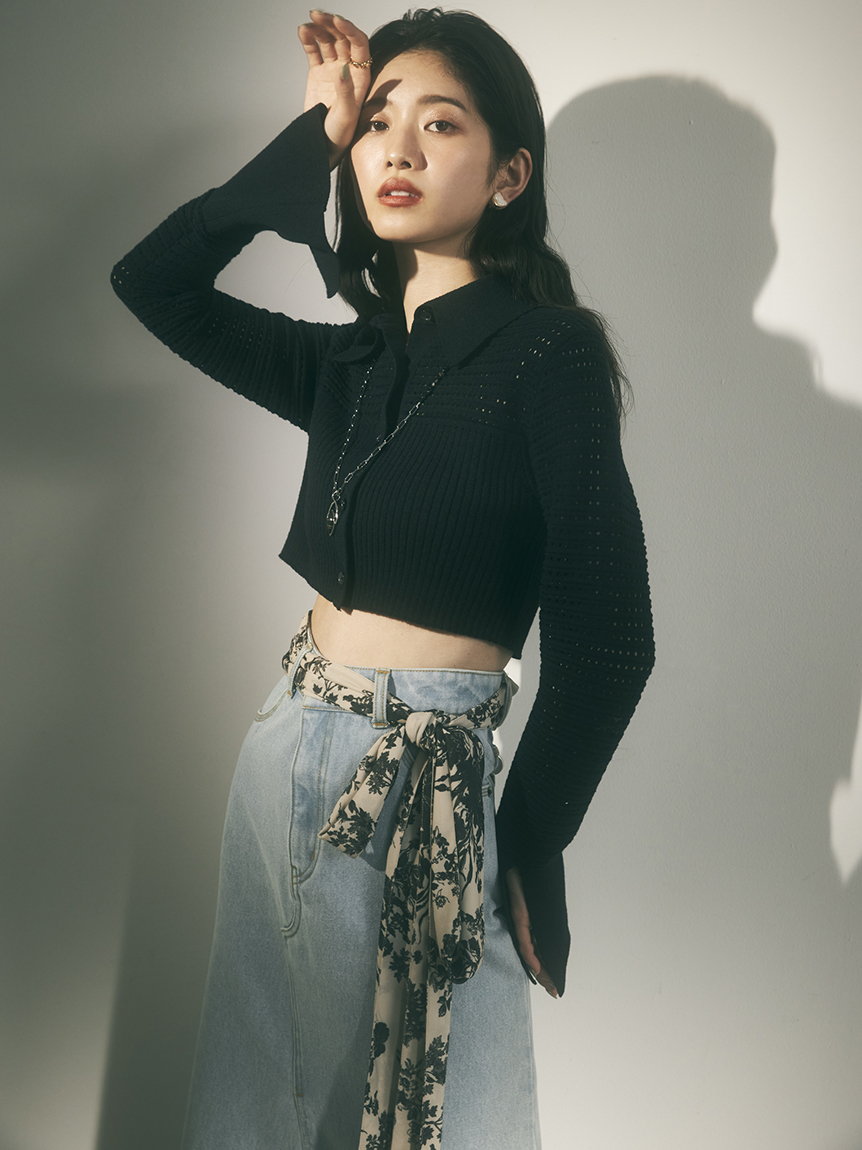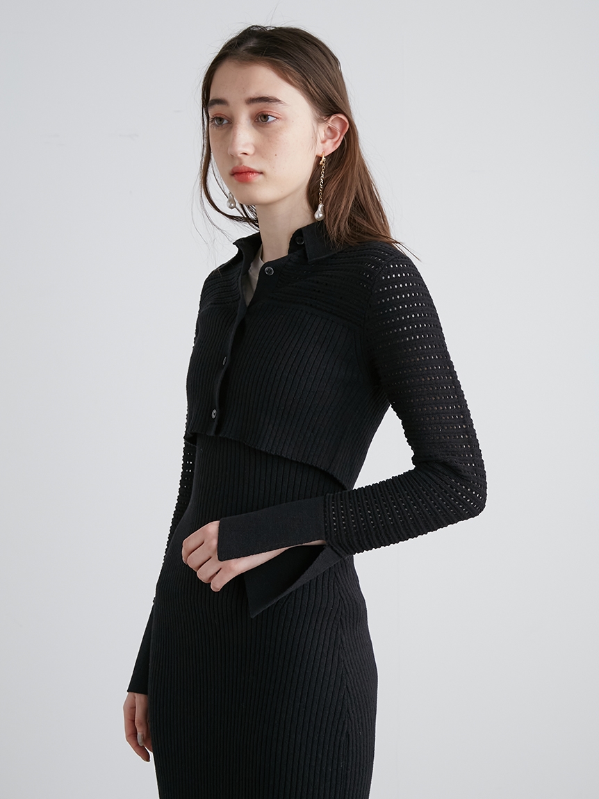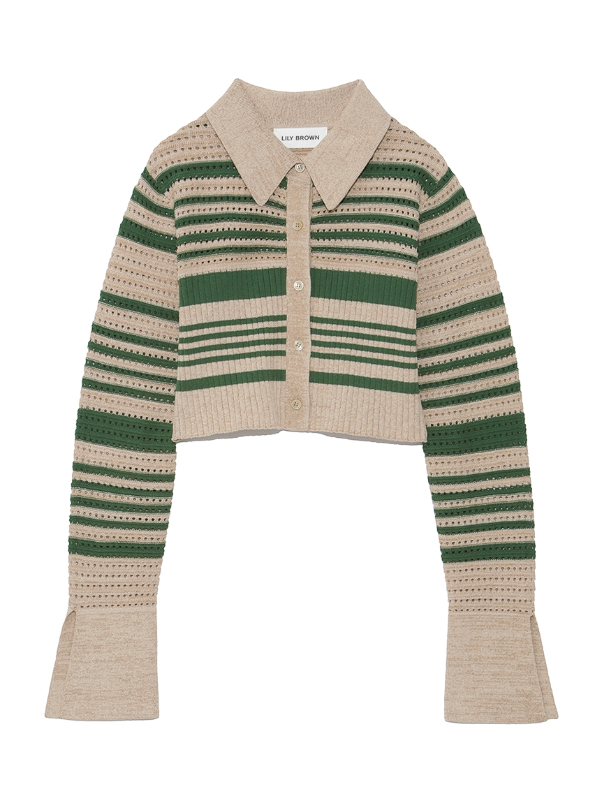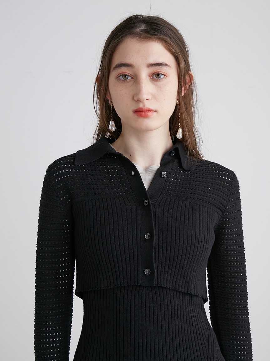 ポロニットカーデイガンをショート丈に仕立てトレンドライクに仕上げました。バスト上とスリーブの編み地は透かし柄にし表情にアクセントをプラスしています。カフスは総針でスリットを入れ、今年らしい抜け感を演出。コンパクトなシルエットなので様々なボトムと合わせやすく、同シリーズのワンピース(LWNO224003)とセットで合わせるコーディネートもおすすめです。