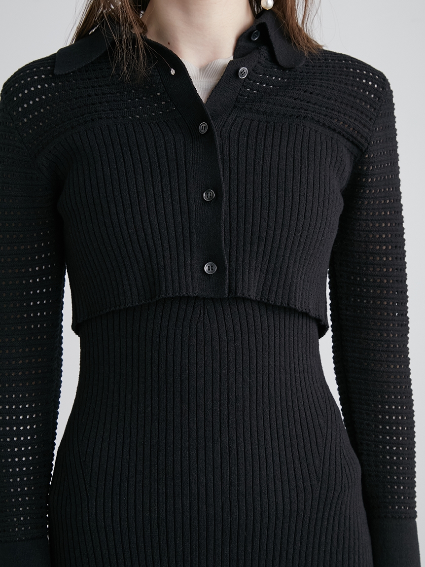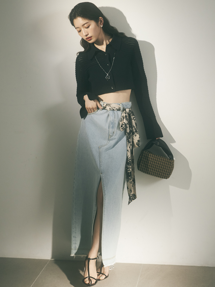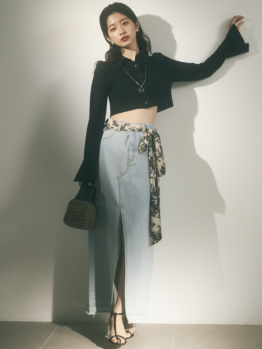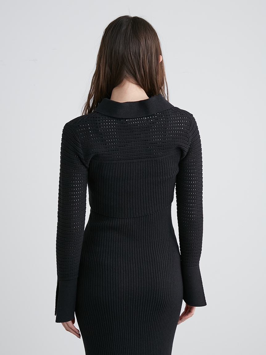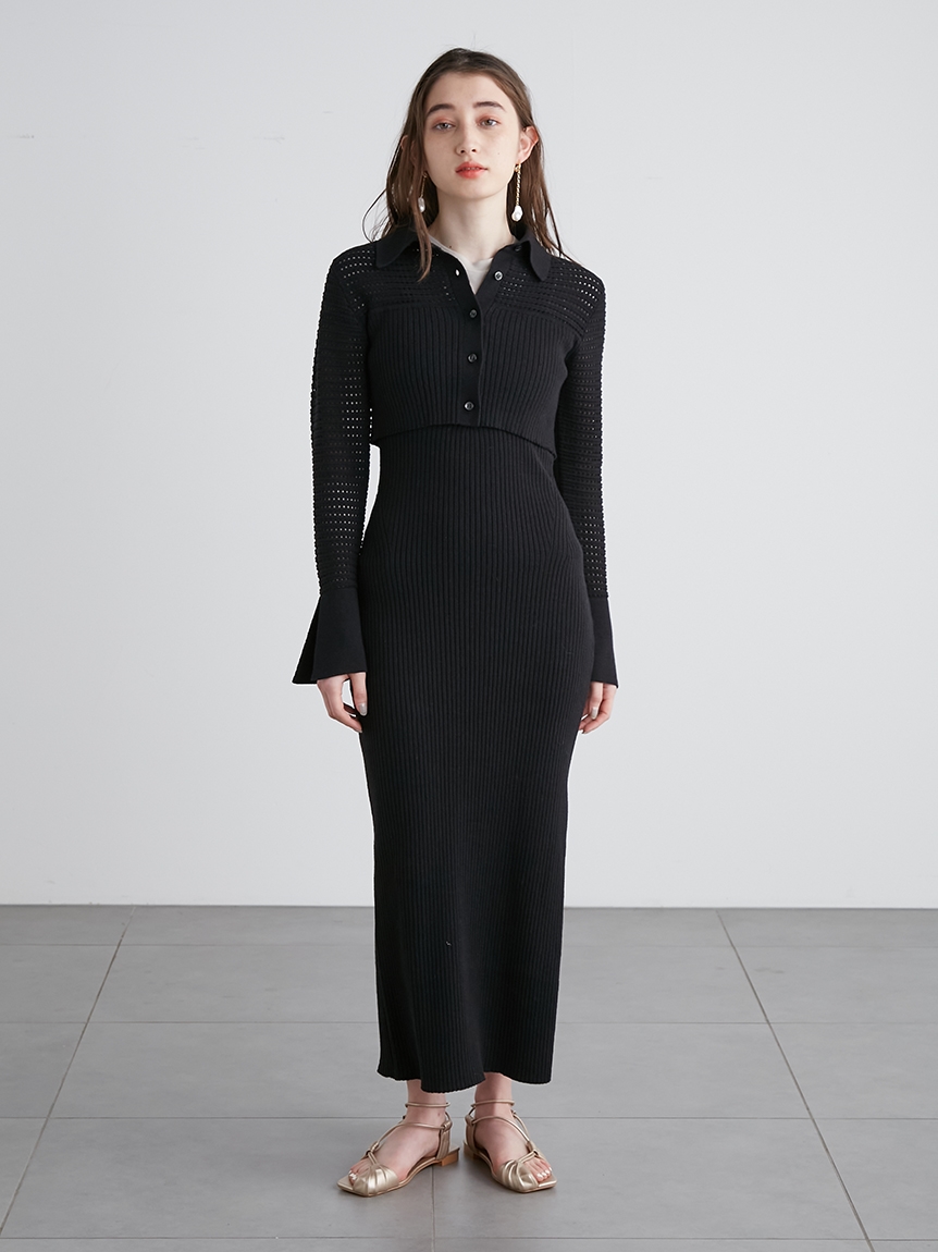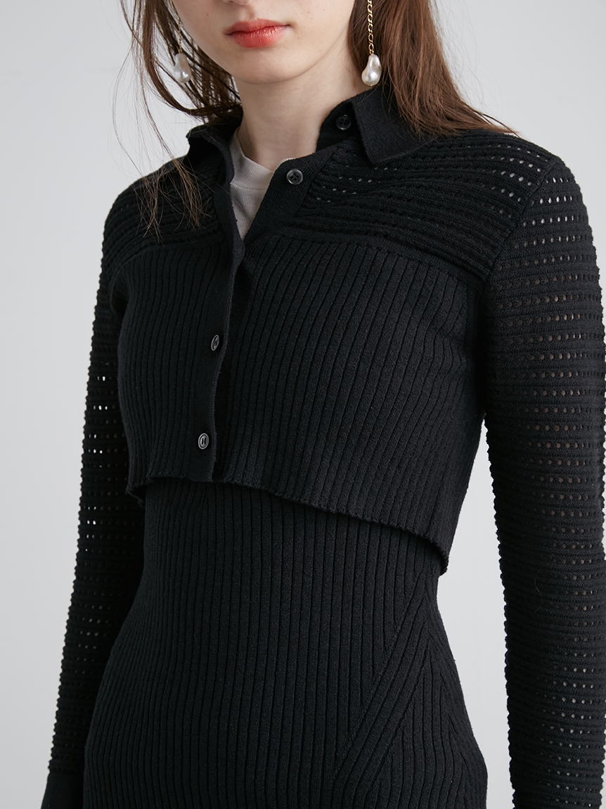 ポロニットカーデイガンをショート丈に仕立てトレンドライクに仕上げました。バスト上とスリーブの編み地は透かし柄にし表情にアクセントをプラスしています。カフスは総針でスリットを入れ、今年らしい抜け感を演出。コンパクトなシルエットなので様々なボトムと合わせやすく、同シリーズのワンピース(LWNO224003)とセットで合わせるコーディネートもおすすめです。