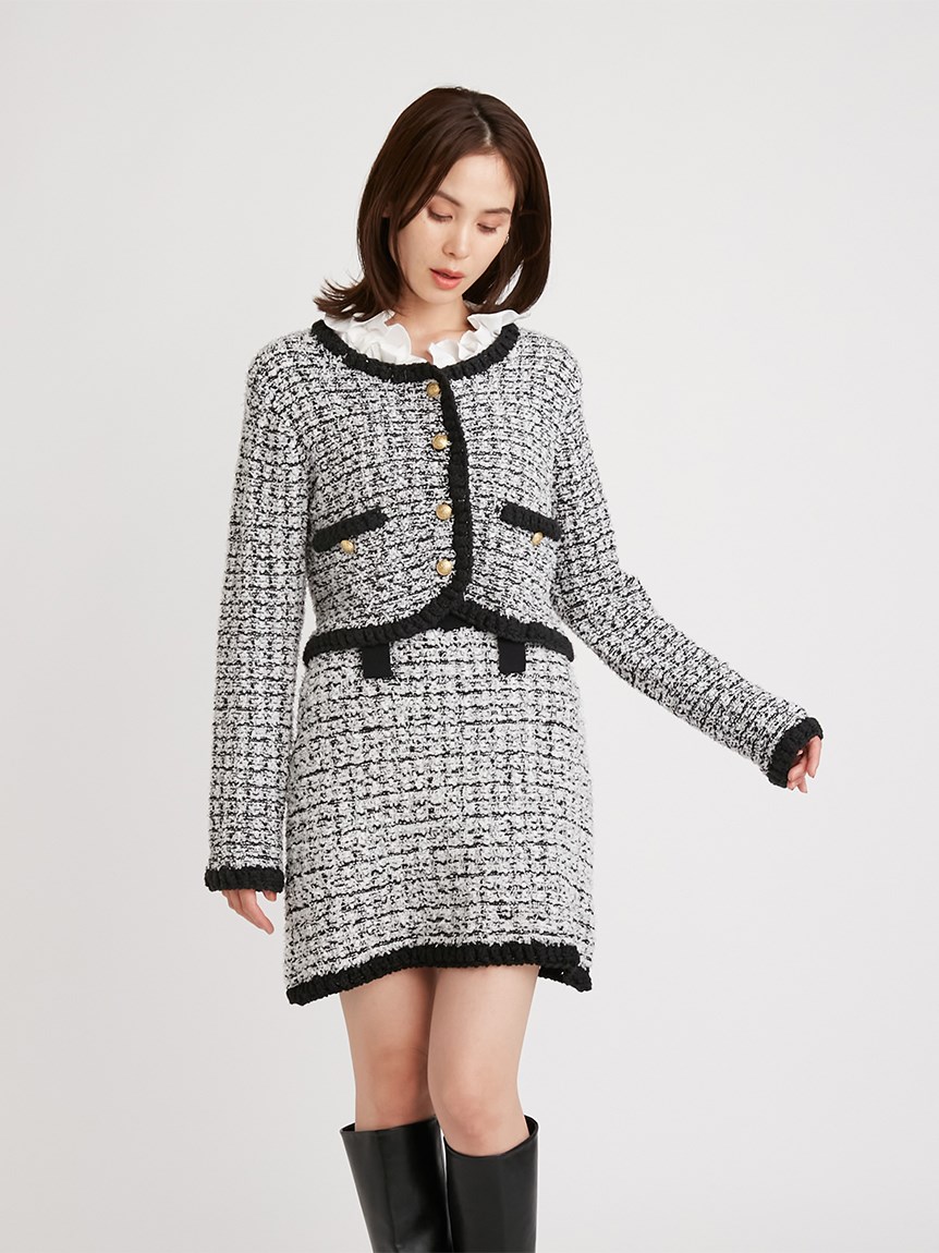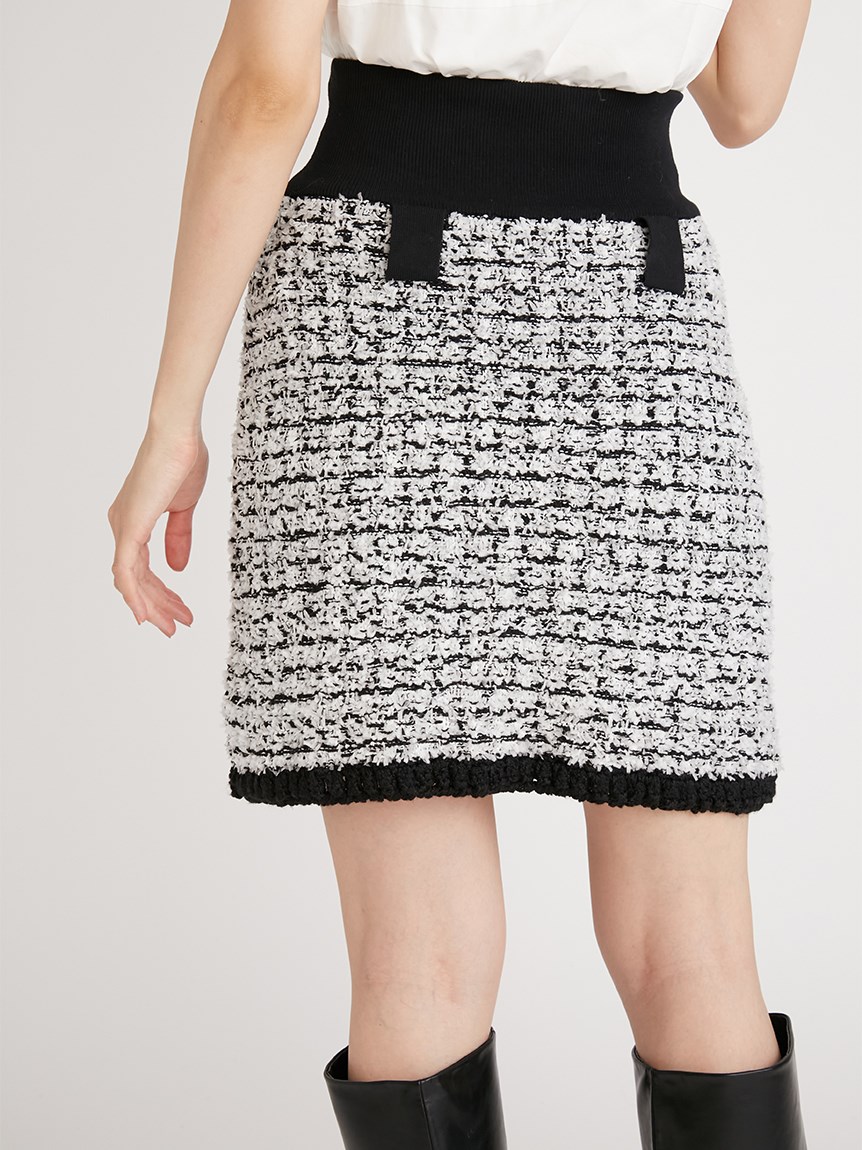 ボディラインにフィットするタイトシルエットが印象的な、女性らしい着こなしを叶えるミニスカート。ややローウエストの位置にあしらわれたベルトループがトレンド感を高めるキーポイント。お手持ちのベルトでマークすれば、スタイリングの完成度が一気に高まります。ブラウスやニットなど様々なトップスと合わせやすく、同素材を用いたニットジャケット(SWNT224112)とセットでスタイリングするのもオススメです。