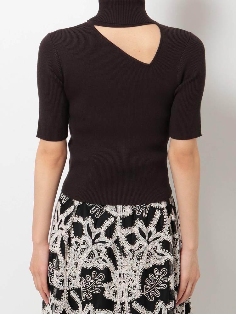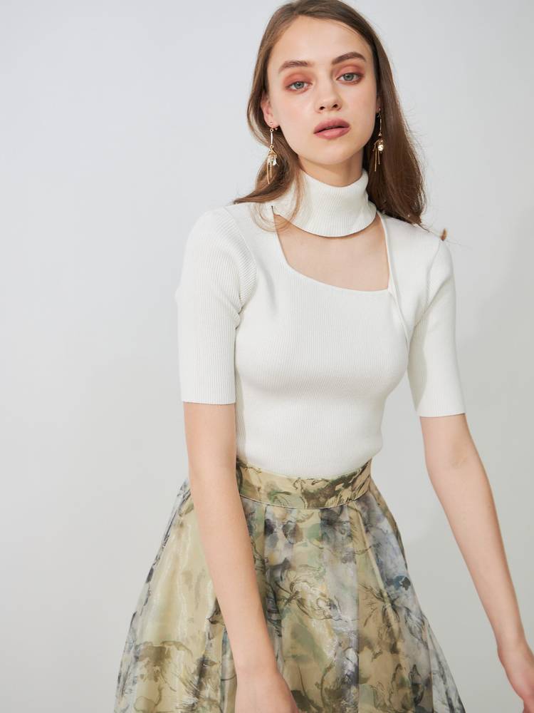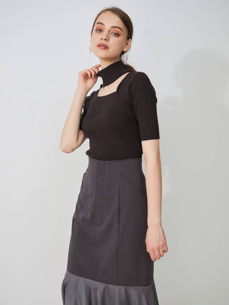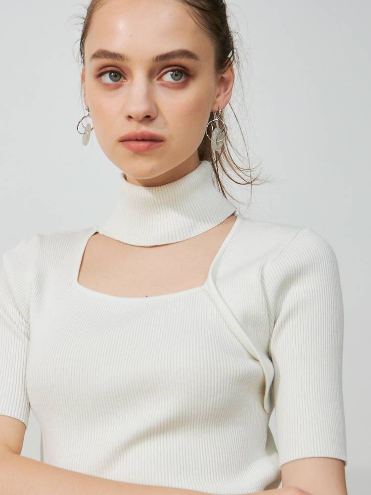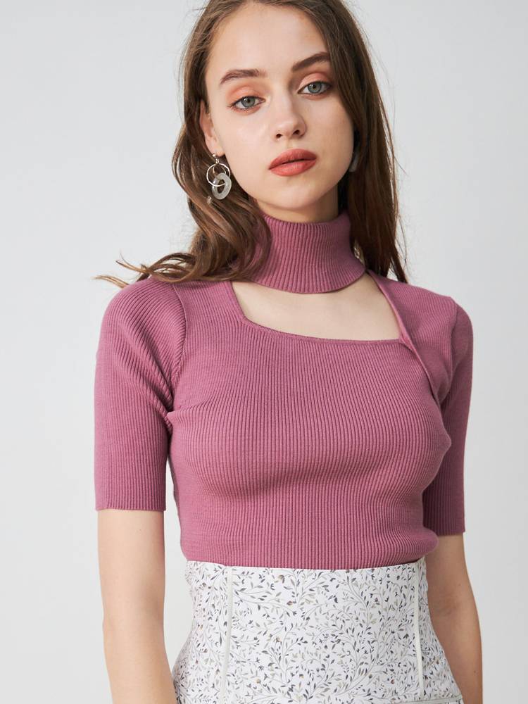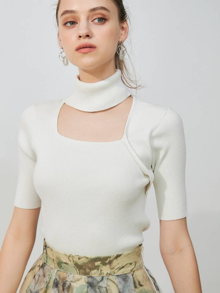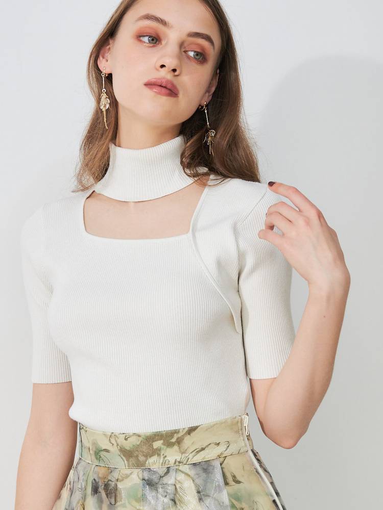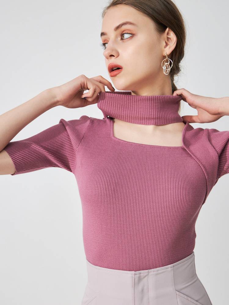 デコルテを綺麗に見せる開きと、折り返しのハイネックが大人っぽい印象です。
