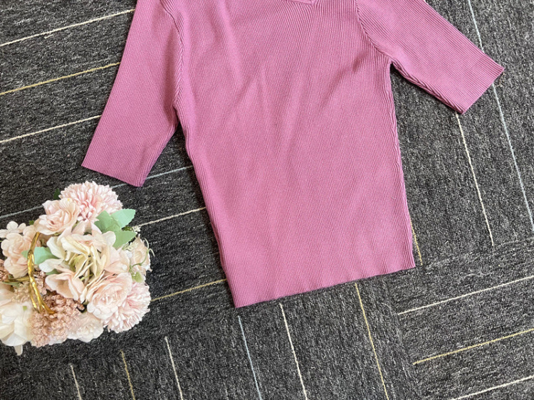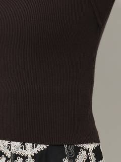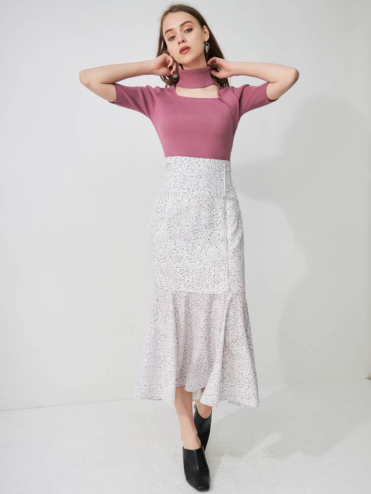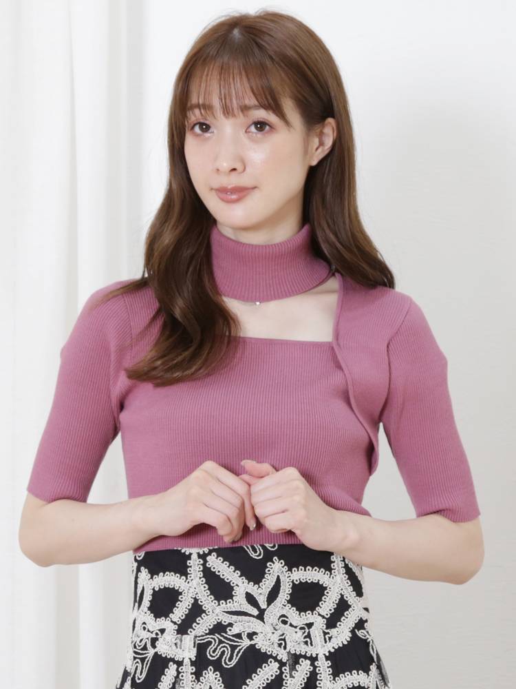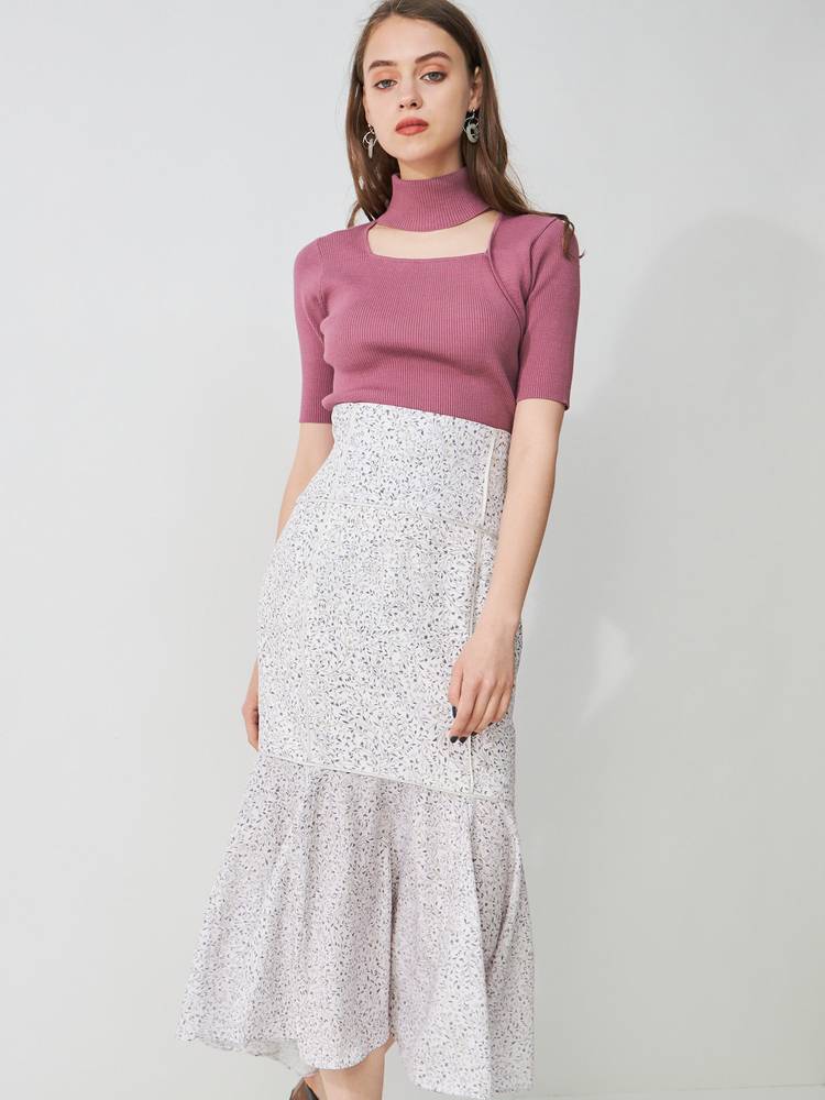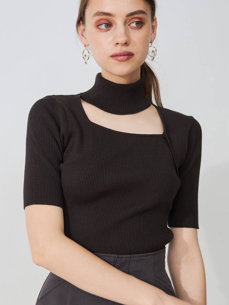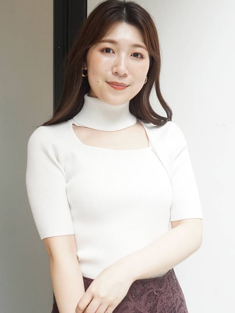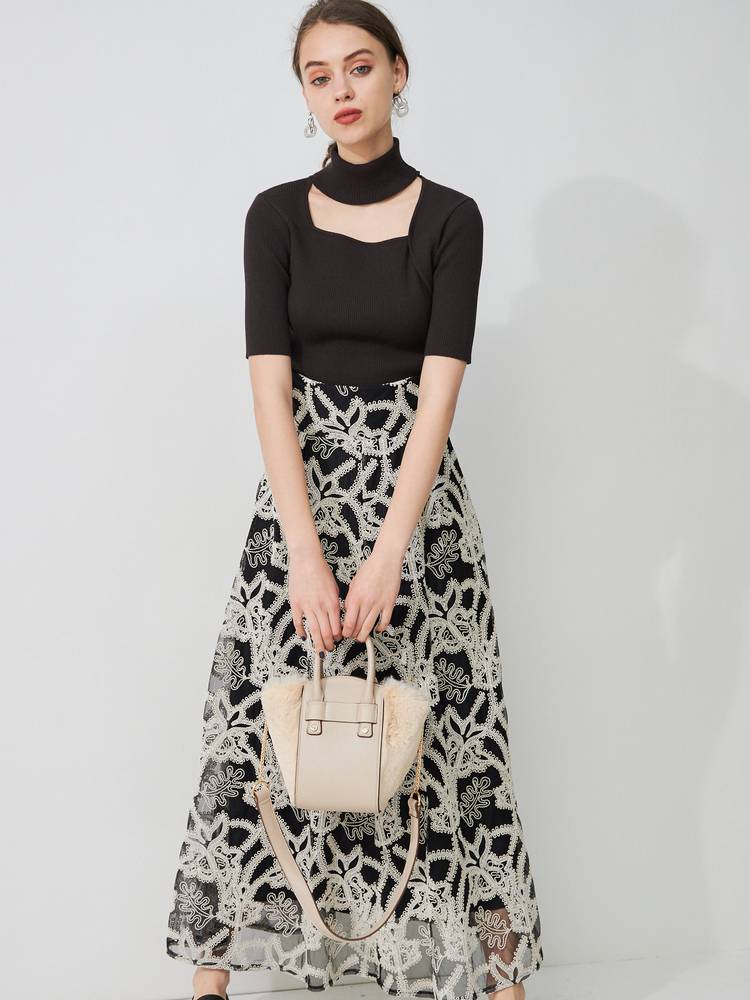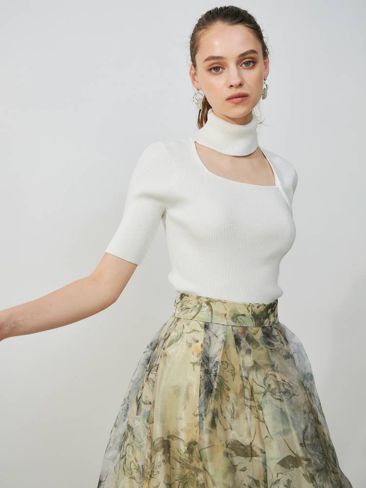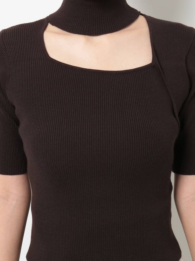 デコルテを綺麗に見せる開きと、折り返しのハイネックが大人っぽい印象です。