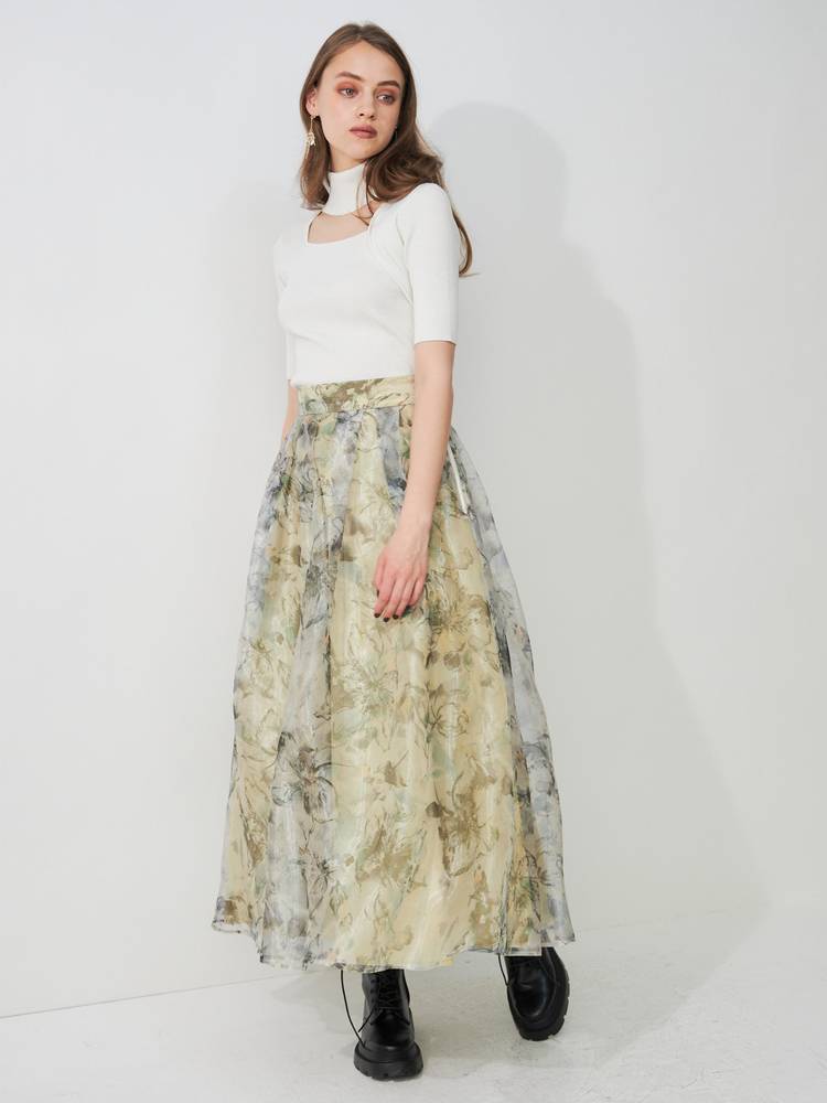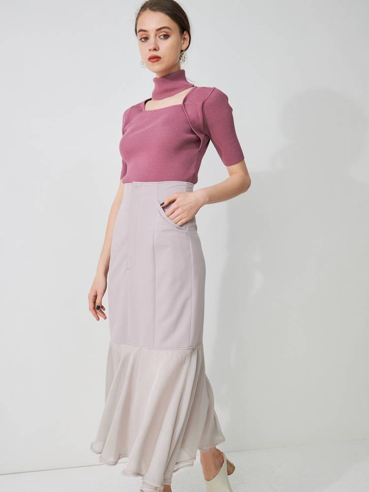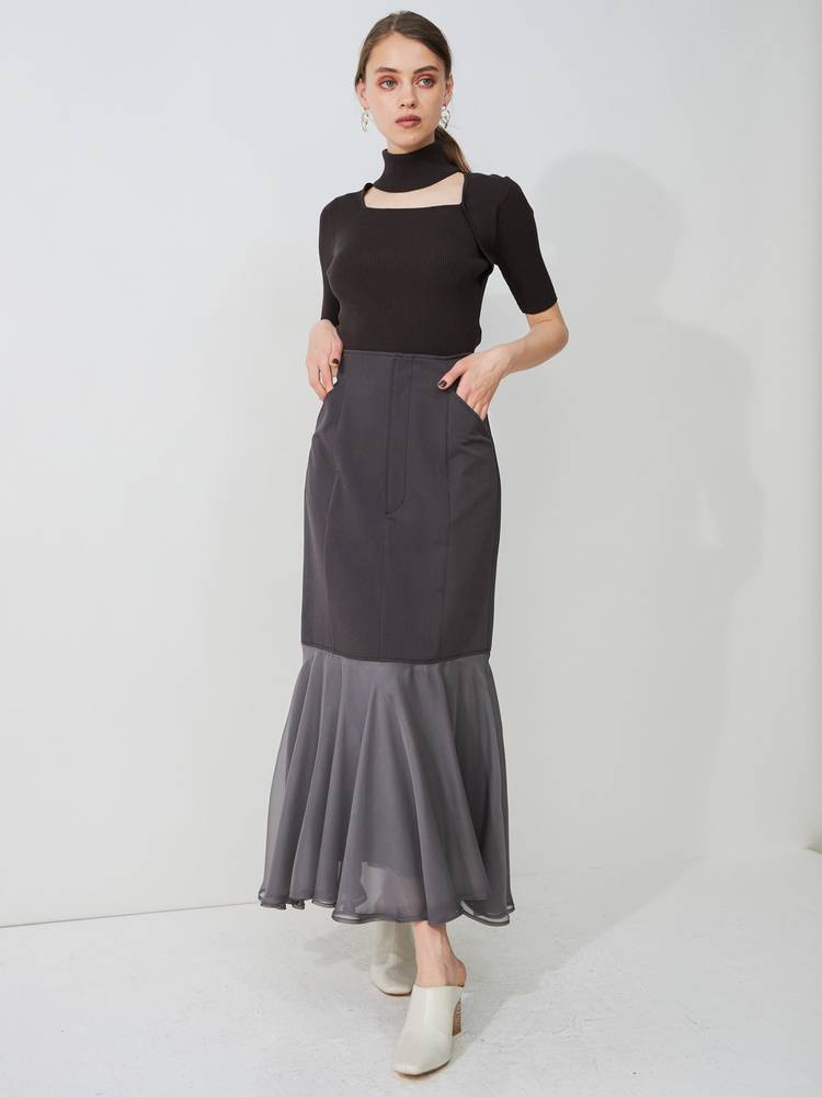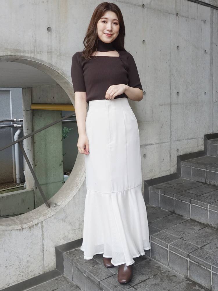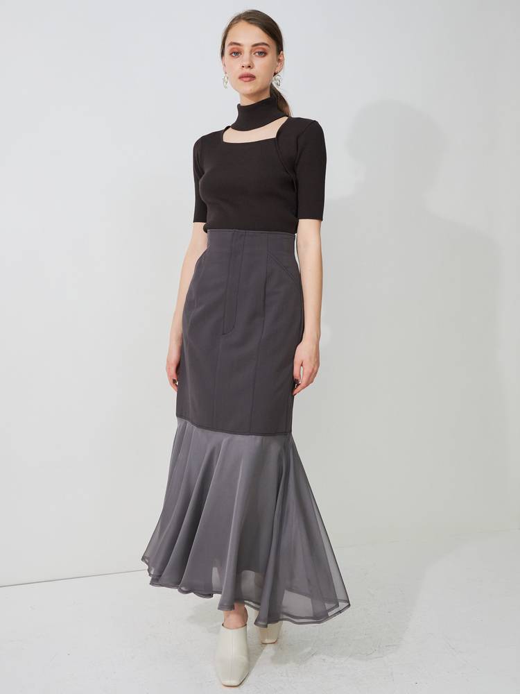 レースや刺繍スカートとの甘辛なスタイリングから、デニムやパンツスタイルでカジュアルなスタイルまで、着回し抜群のアイテム◎ドッキングツイルマーメイドフレアスカートと、トーン×トーンのカラースタイリングもお勧めです。