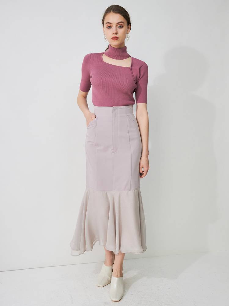 アシンメトリーのカッティングがトレンドライクなデザインのニット。
