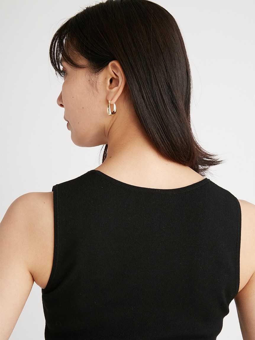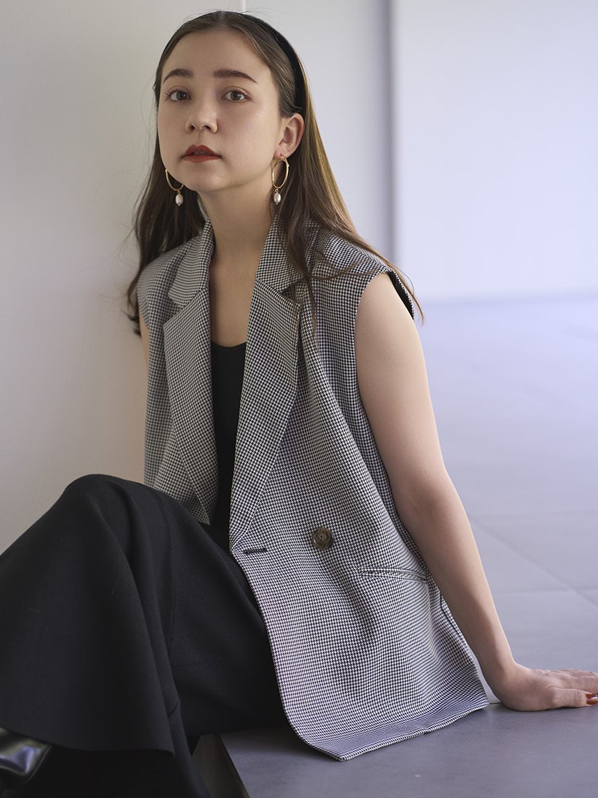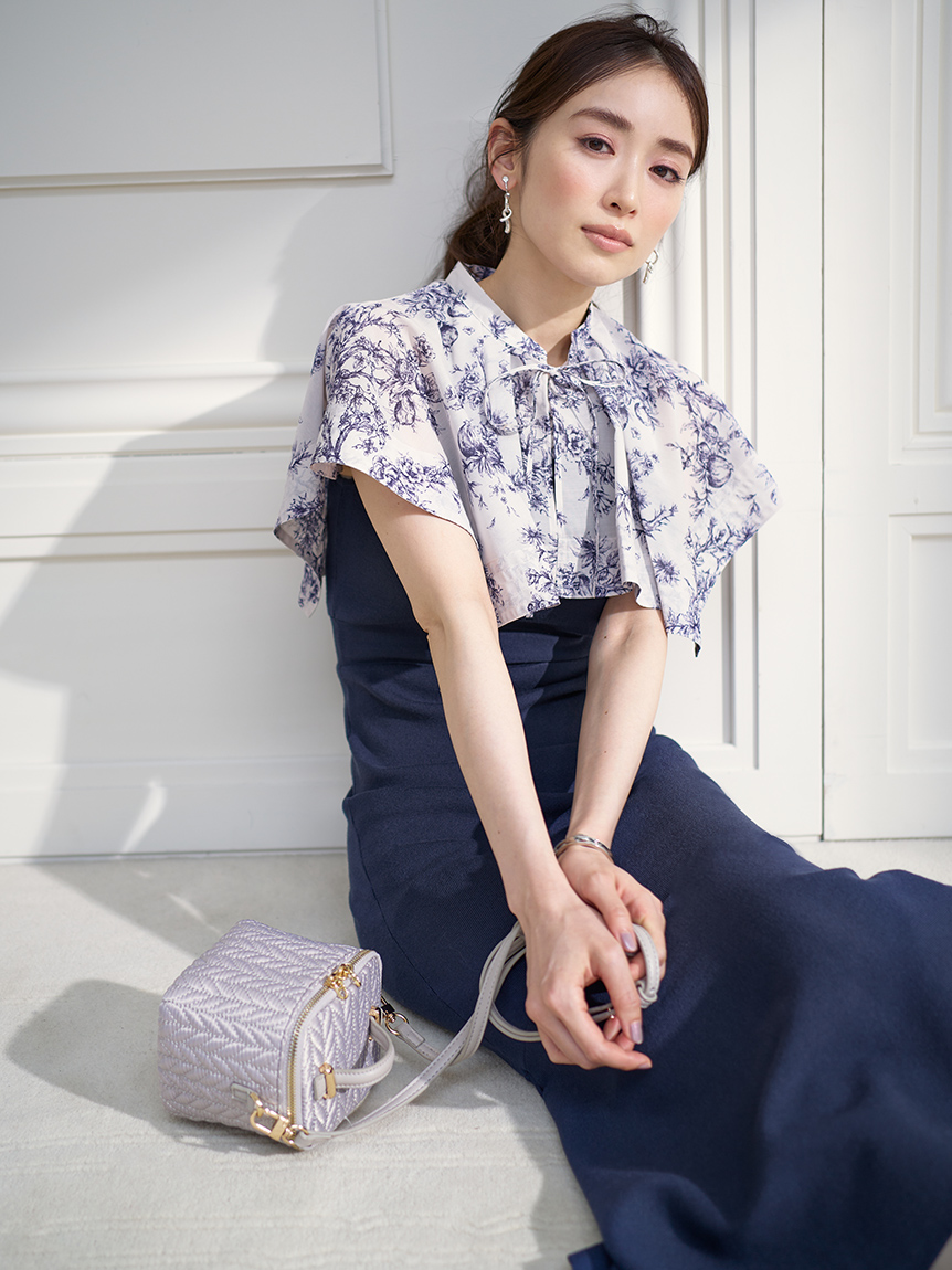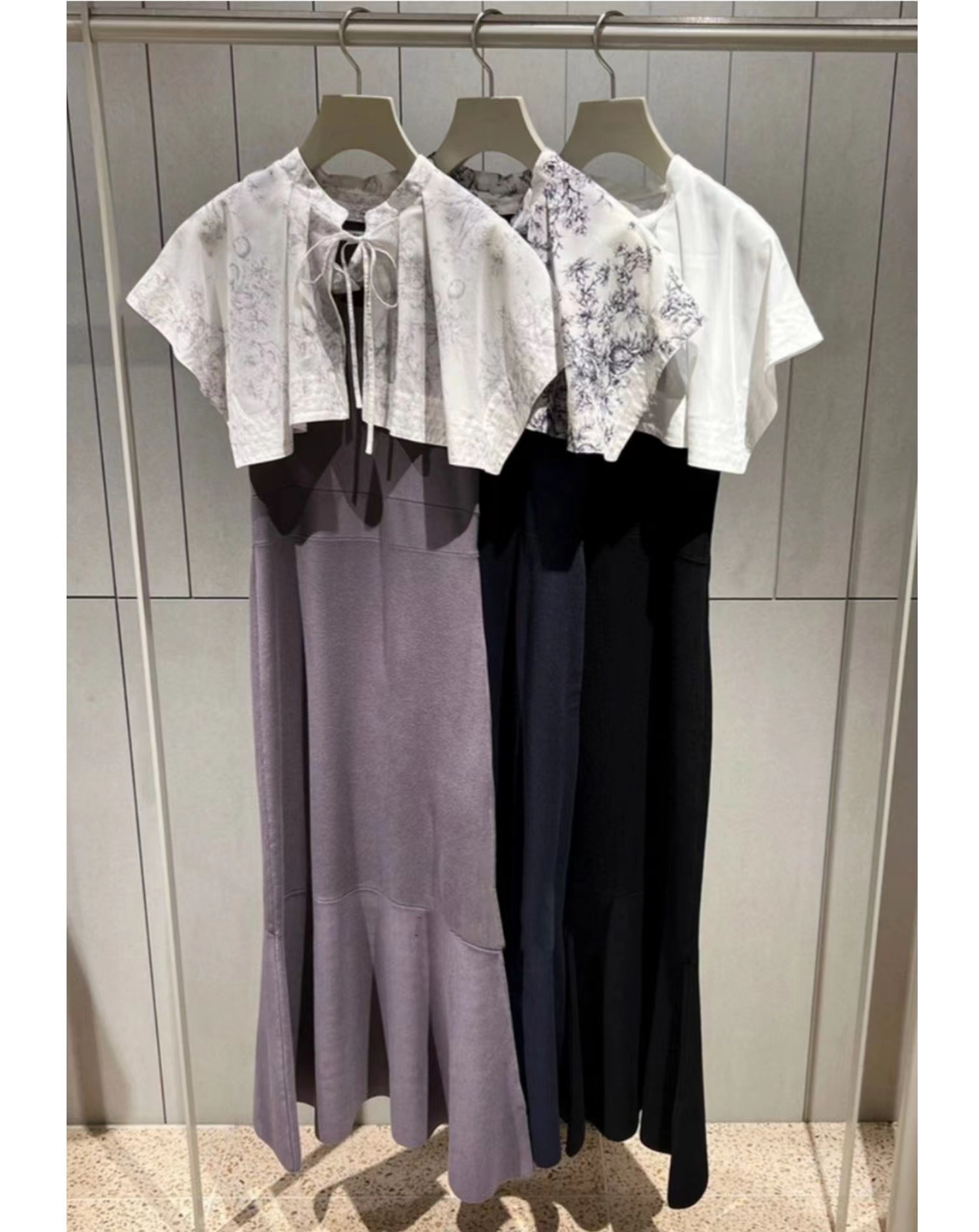 軽やかな風合いの布帛と肉厚のニットを組み合わせました。ニュアンスのある色合いのグレー、モノトーンでまとめたブラック、クラシカルなプリントが目を引くネイビーの3色展開です。