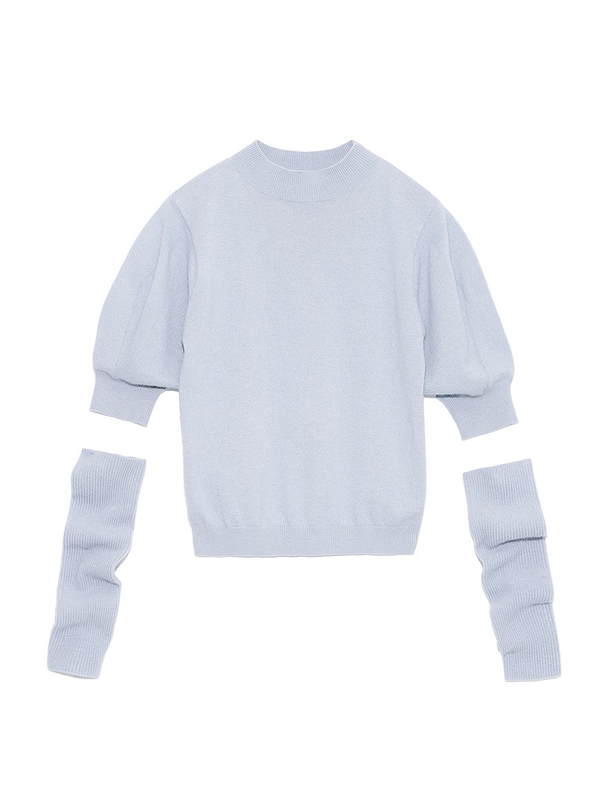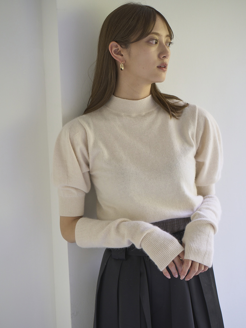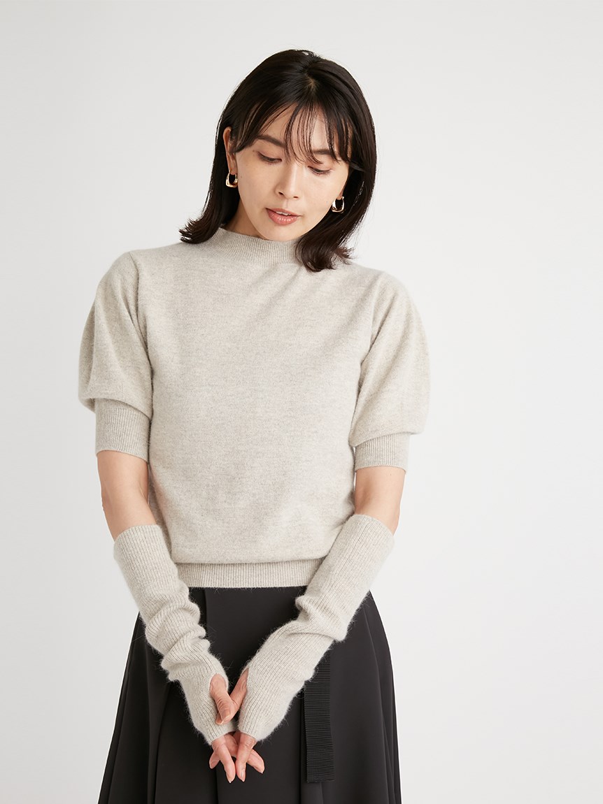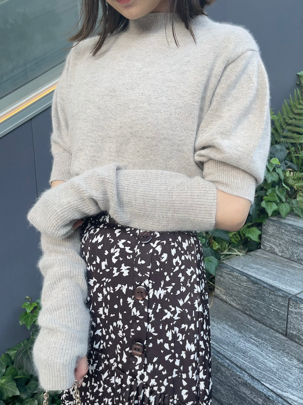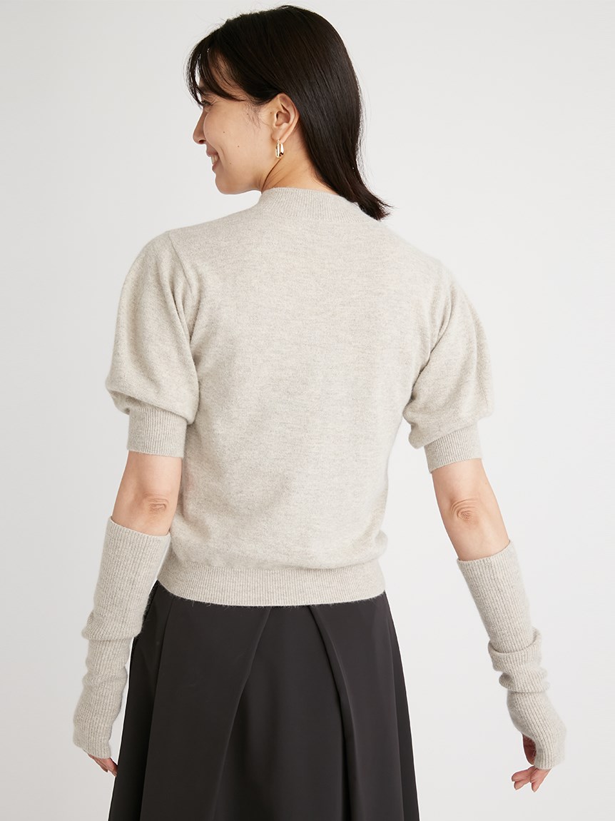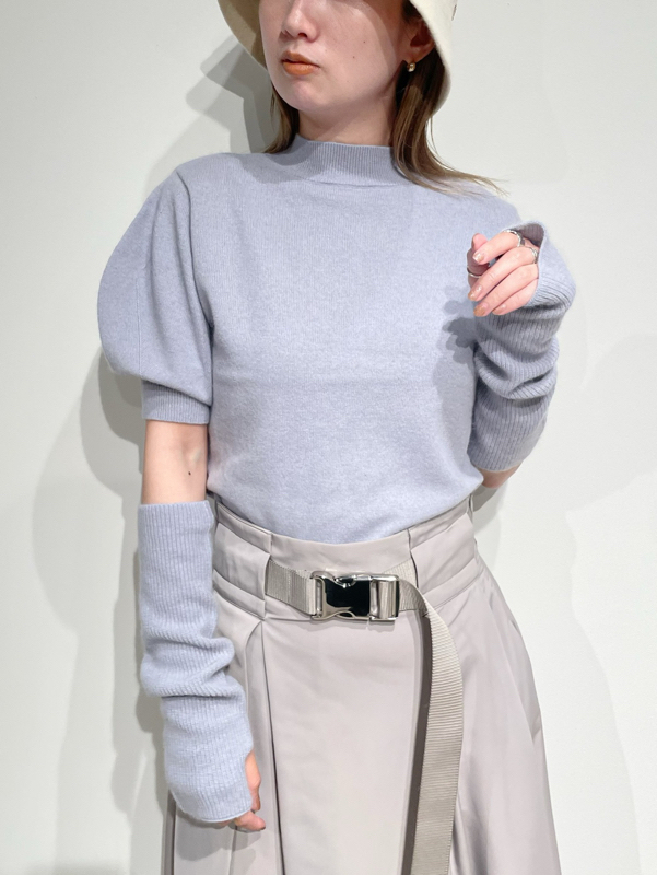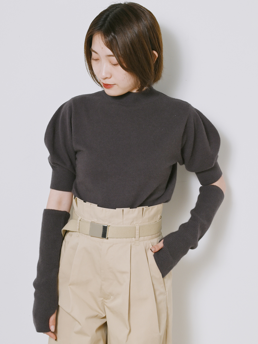 女性らしいボリュームスリーブのニットプルオーバーとアームウォーマーのセットアイテム。五分袖なので夏から秋の季節の変わり目から着られ、アームウォーマーをプラスすれば寒い季節もカバーできる優秀な1着です。アームウォーマーは長めに仕立てているので少しクシュっとさせてニュアンスたっぷりに。フィンガーレスで携帯の操作などもしやすく、実用性もしっかりと押さえています。