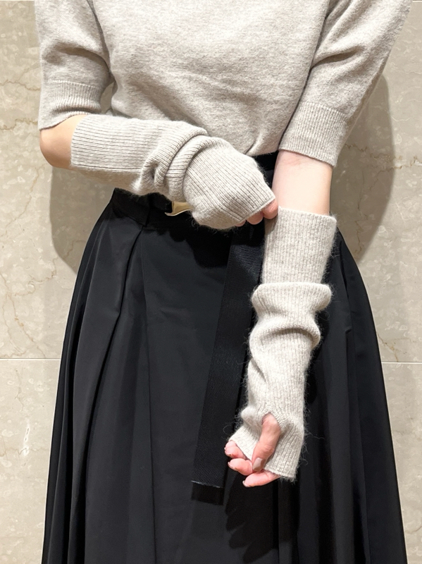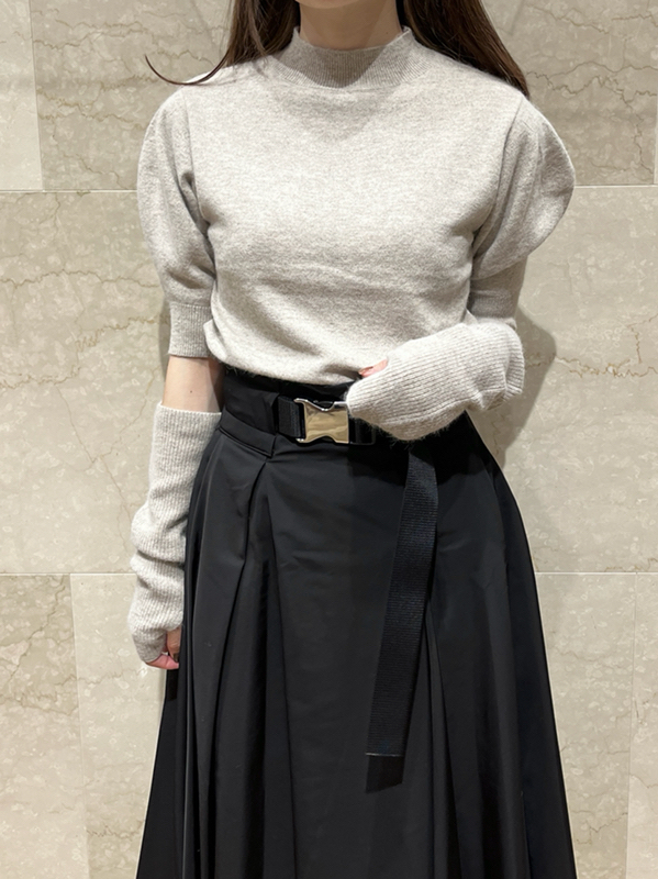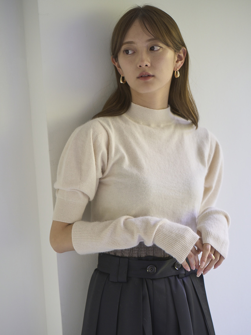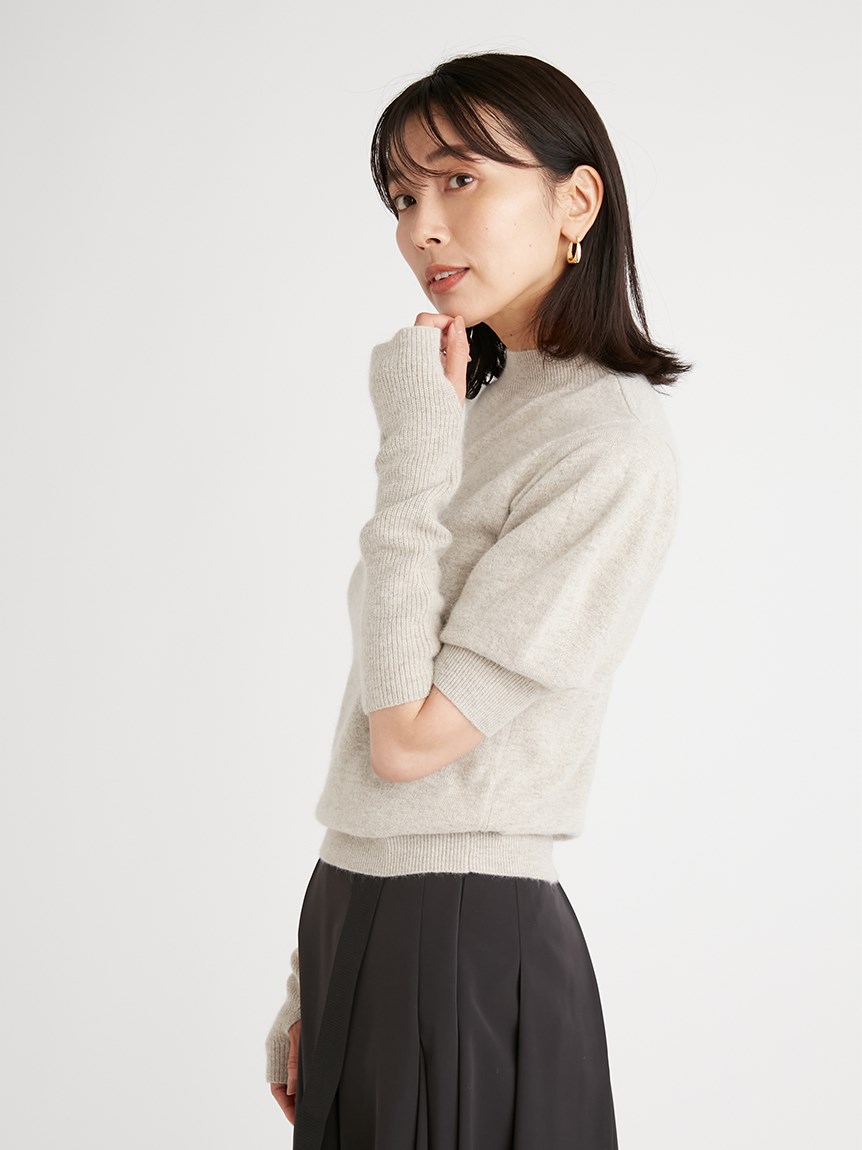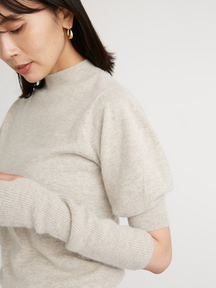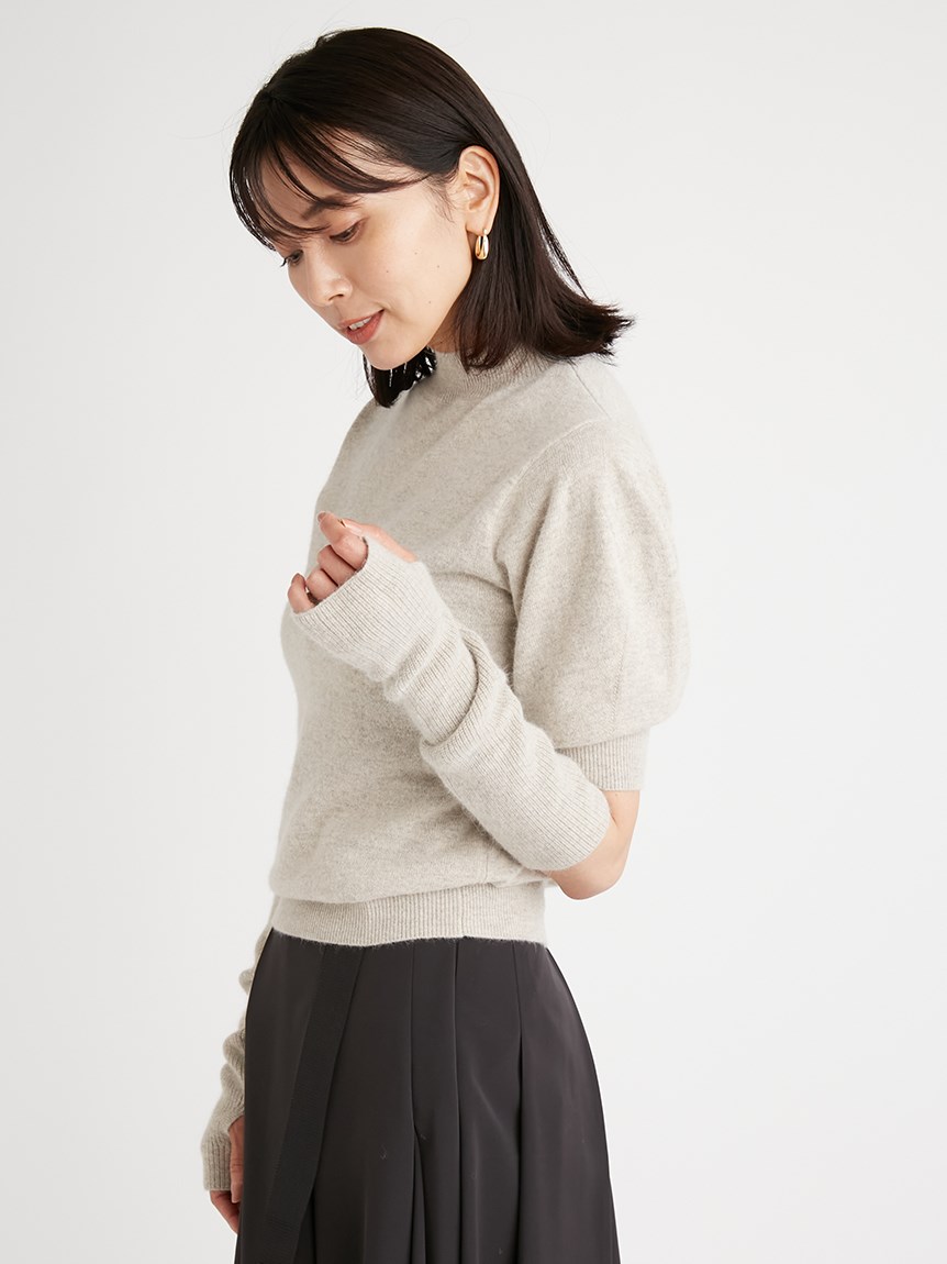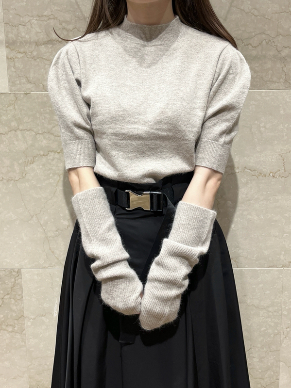 女性らしいボリュームスリーブのニットプルオーバーとアームウォーマーのセットアイテム。五分袖なので夏から秋の季節の変わり目から着られ、アームウォーマーをプラスすれば寒い季節もカバーできる優秀な1着です。アームウォーマーは長めに仕立てているので少しクシュっとさせてニュアンスたっぷりに。フィンガーレスで携帯の操作などもしやすく、実用性もしっかりと押さえています。