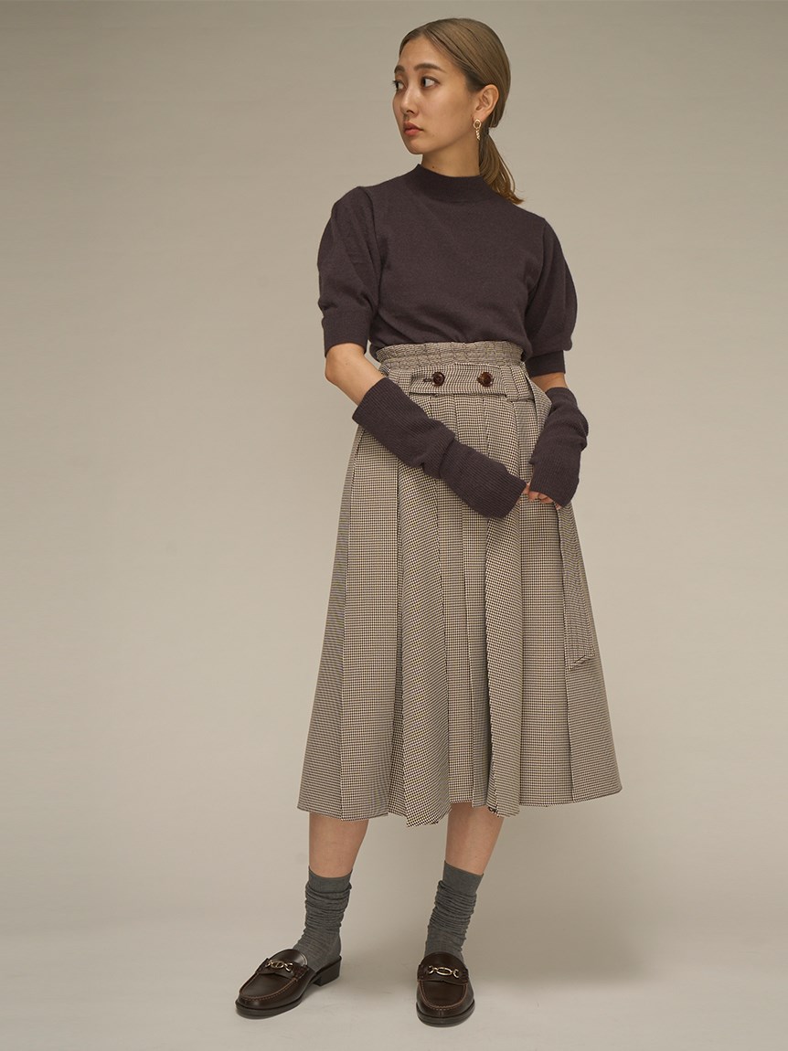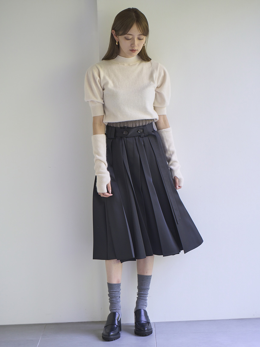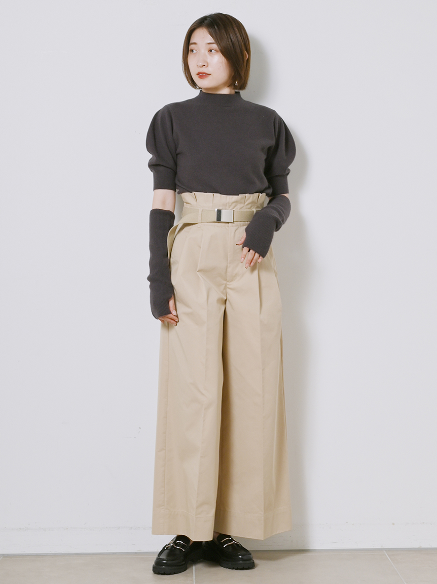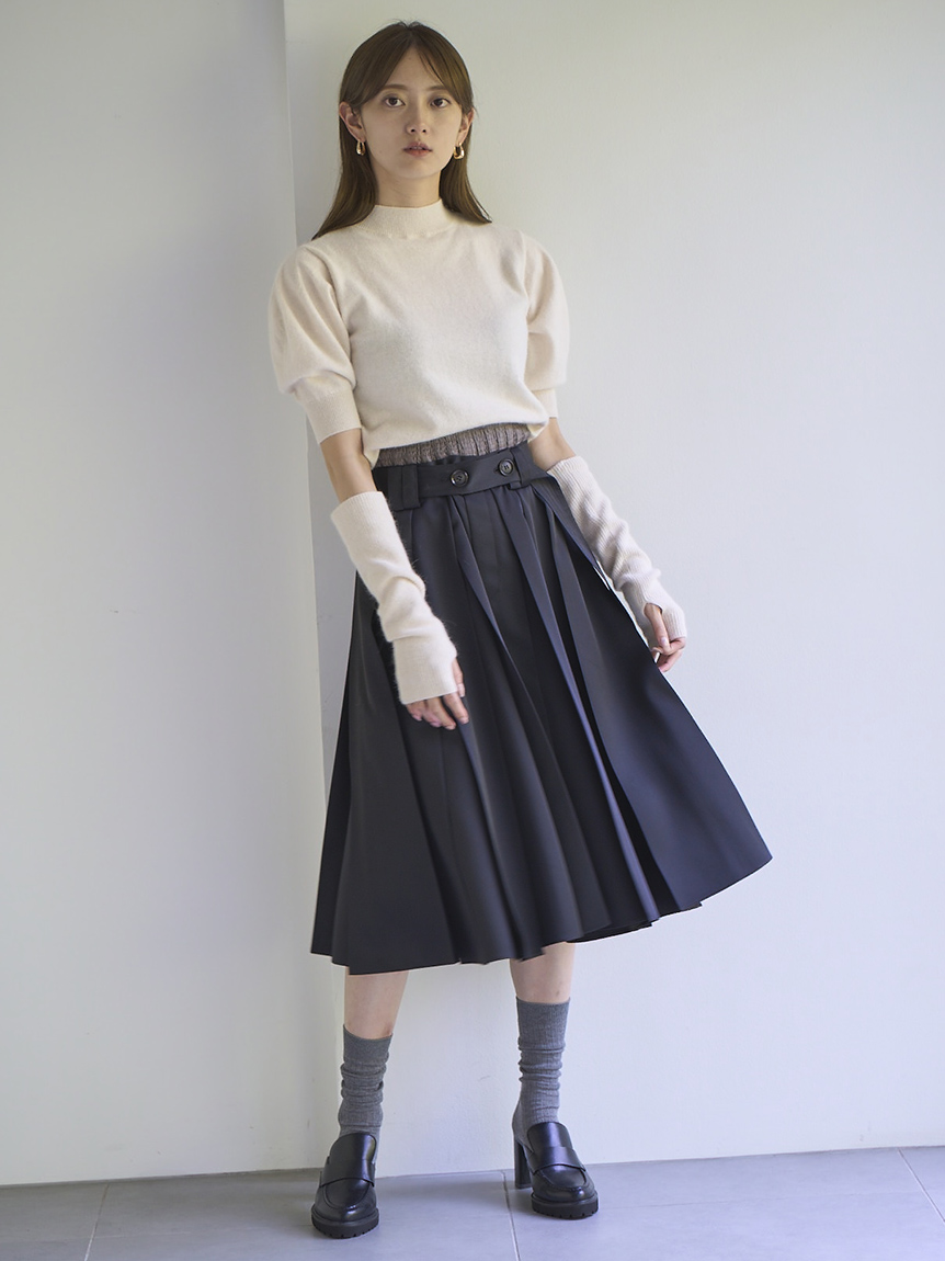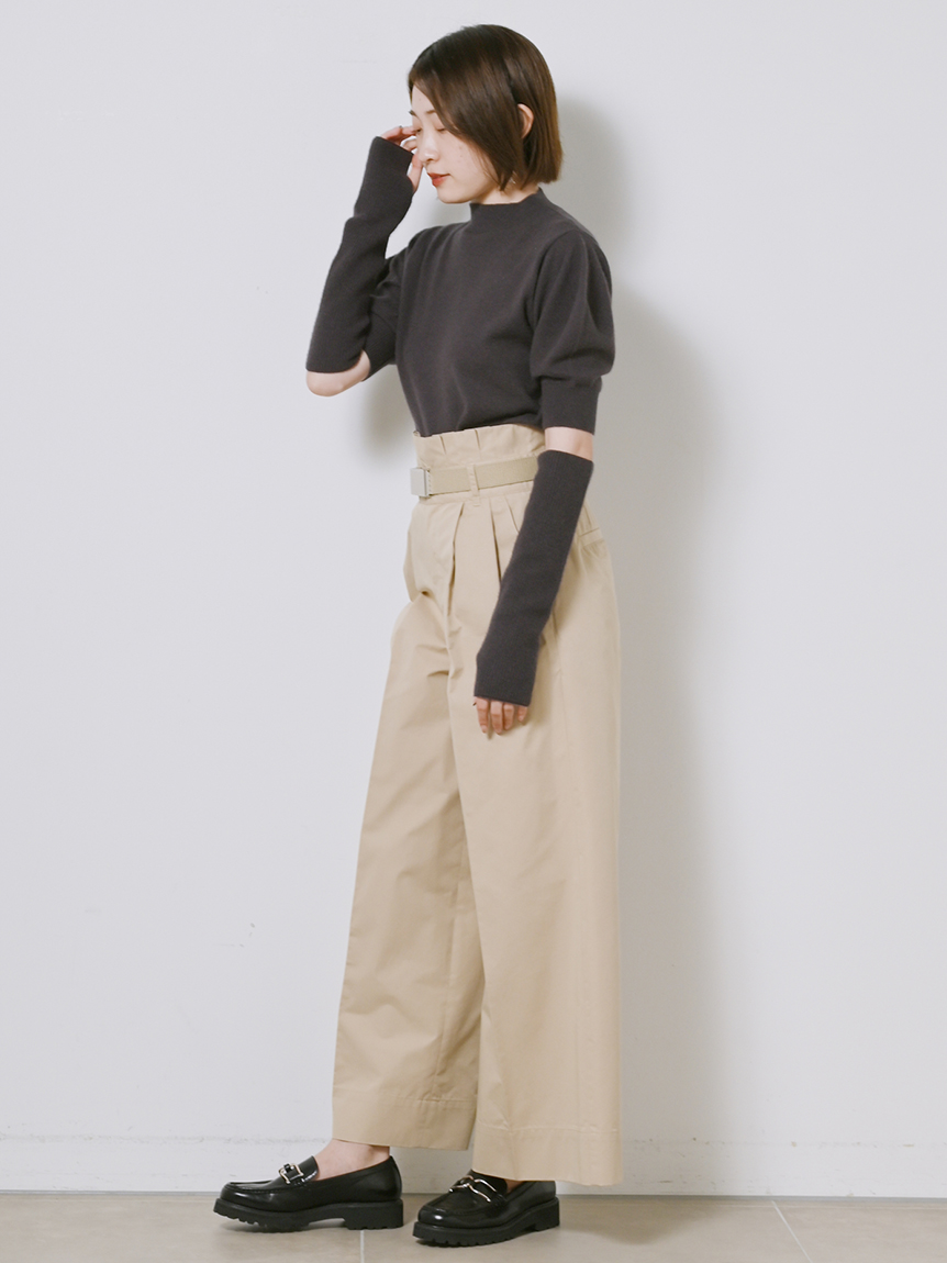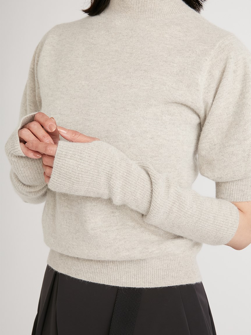 女性らしいボリュームスリーブのニットプルオーバーとアームウォーマーのセットアイテム。五分袖なので夏から秋の季節の変わり目から着られ、アームウォーマーをプラスすれば寒い季節もカバーできる優秀な1着です。アームウォーマーは長めに仕立てているので少しクシュっとさせてニュアンスたっぷりに。フィンガーレスで携帯の操作などもしやすく、実用性もしっかりと押さえています。