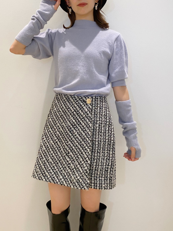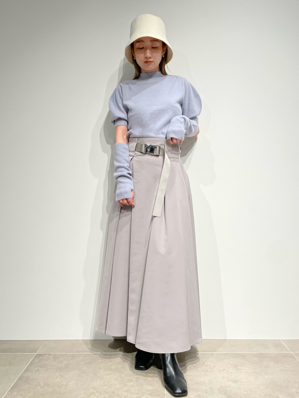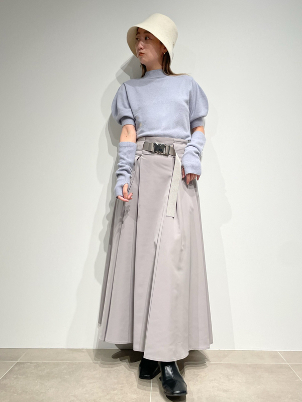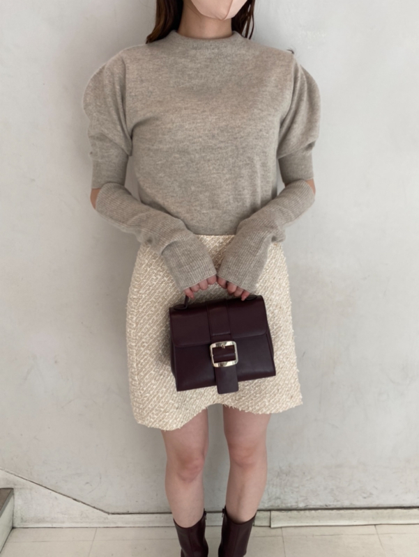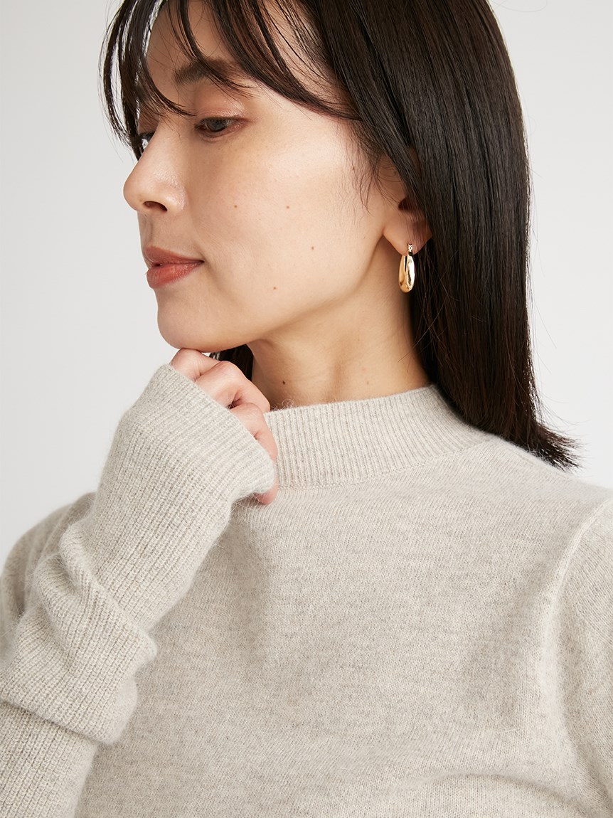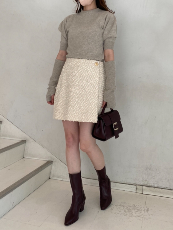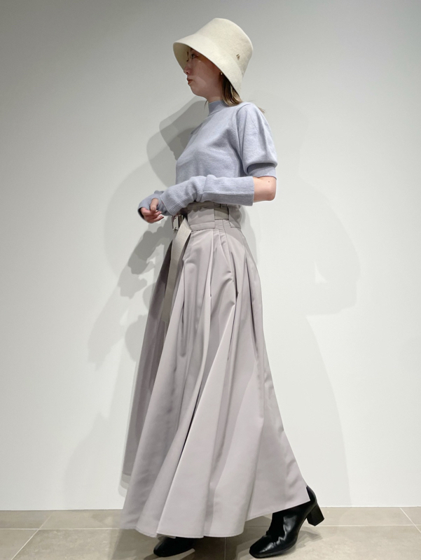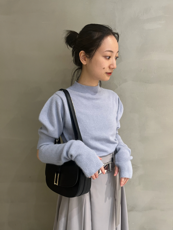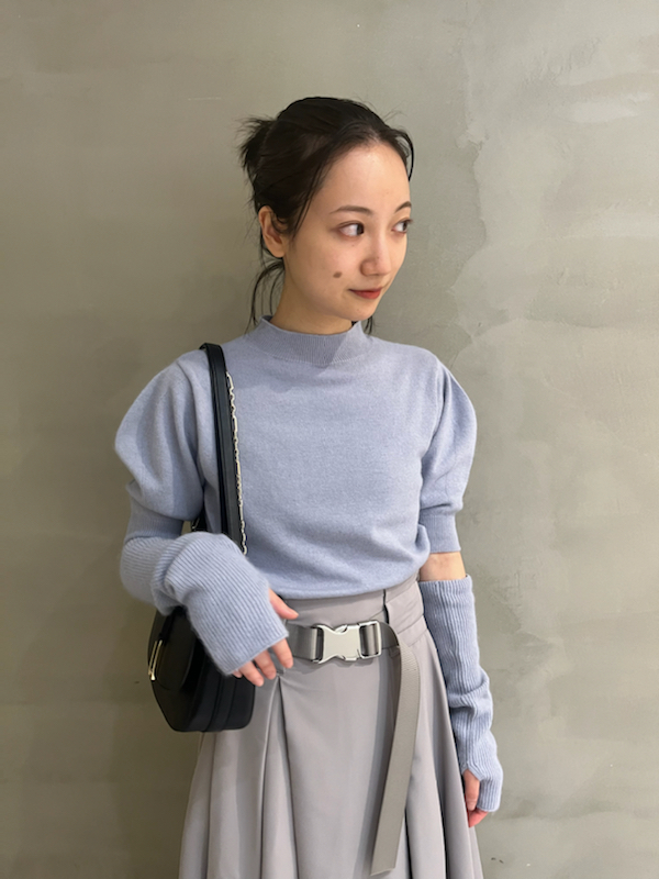 起毛感のあるフェミニンなニット素材を使用しました。深みのあるカラートーンのチャコールグレー、着まわしやすいグレーベージュ、ペールトーンでニュアンスのあるライトブルーの3色に加え、WEB限定で、フェミニンにも合わせやすいアイボリーを作りました。