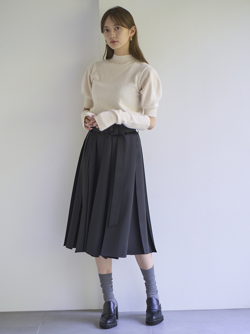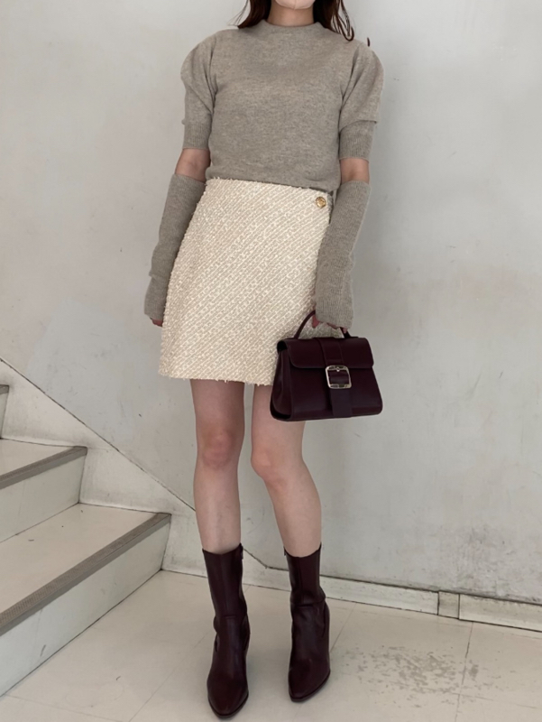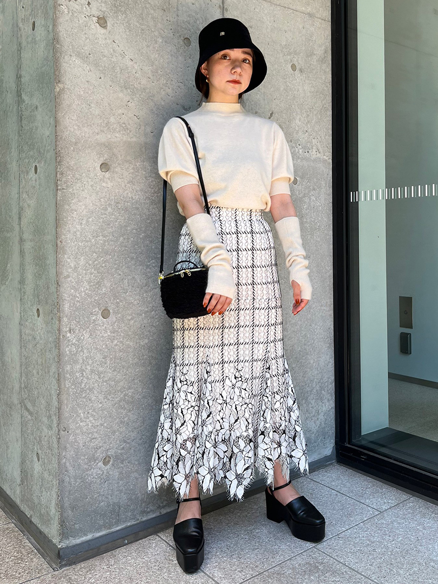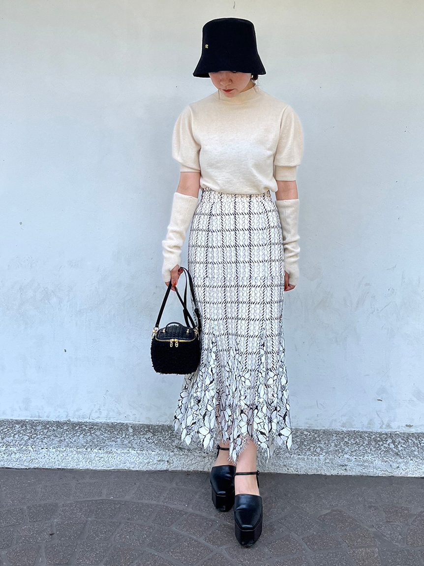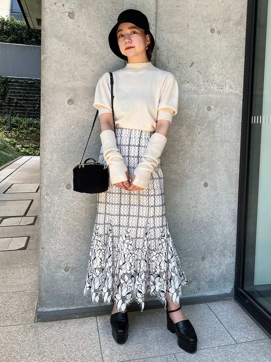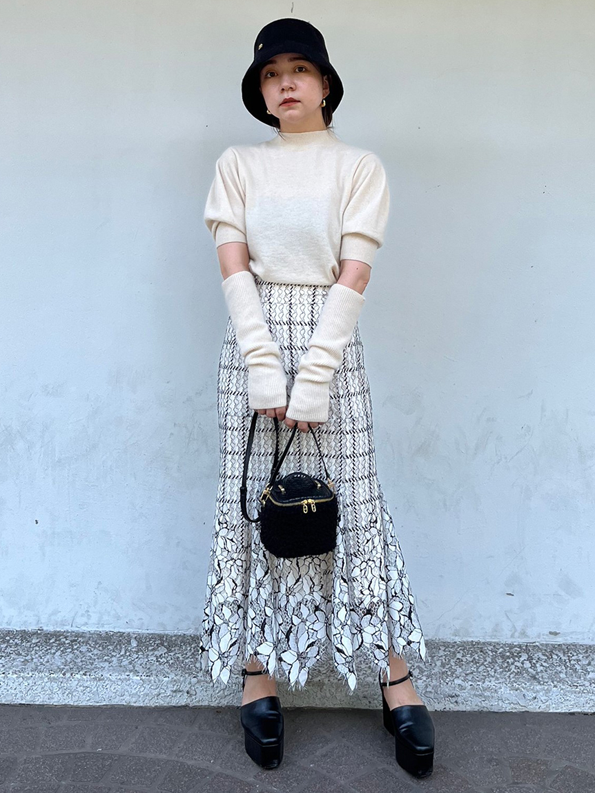 起毛感のあるフェミニンなニット素材を使用しました。深みのあるカラートーンのチャコールグレー、着まわしやすいグレーベージュ、ペールトーンでニュアンスのあるライトブルーの3色に加え、WEB限定で、フェミニンにも合わせやすいアイボリーを作りました。