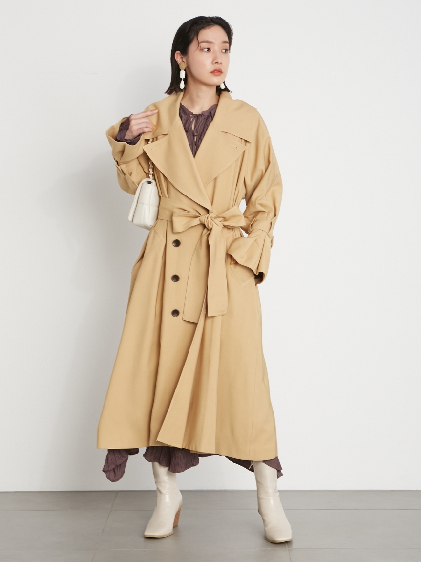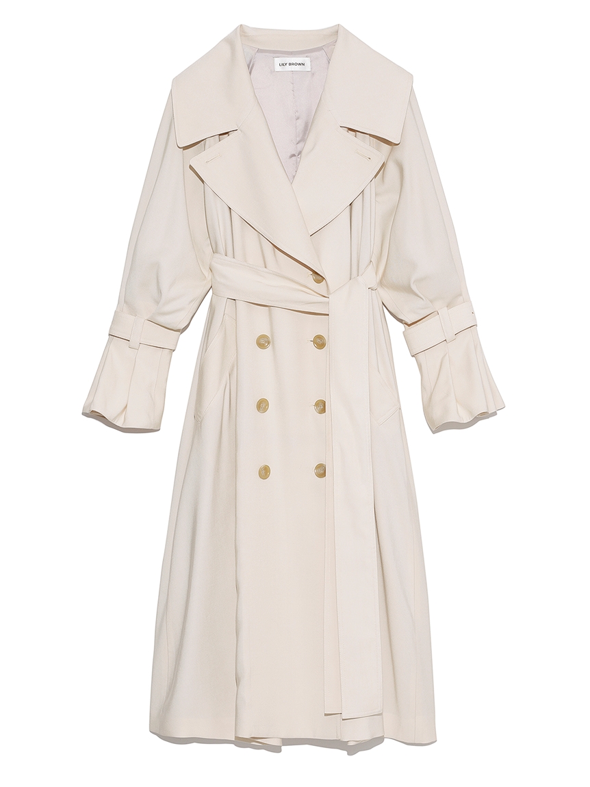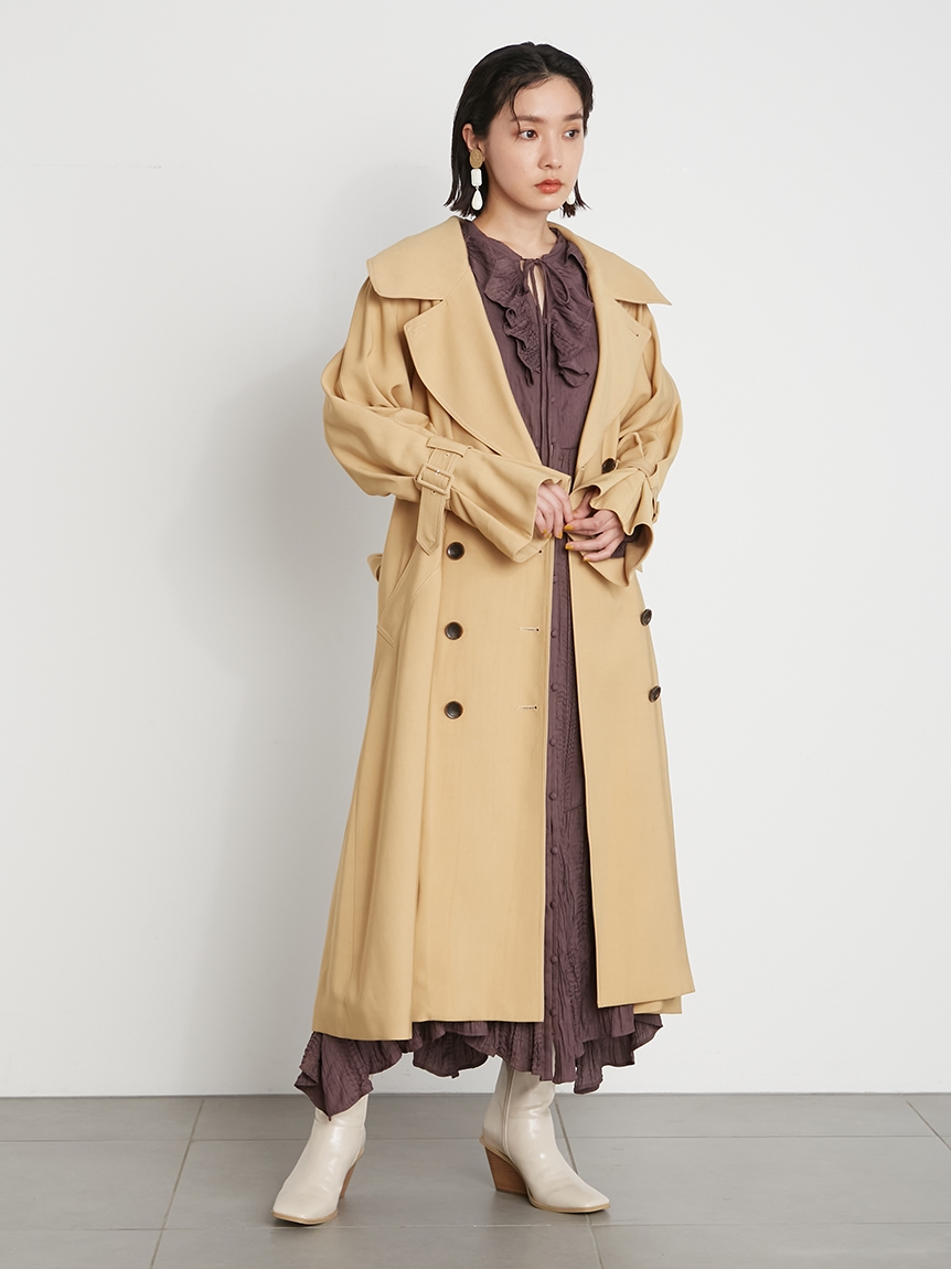 トレンド感のあるビッグカラーがポイントになったクラシカルなトレンチコート。顔回りがすっきり見えるように襟を少し抜き、天幅から前下がりまでを計算して美しいラインを演出しています。共布ベルトでウエストをきゅっと結べば、女性らしいメリハリのあるシルエットに。袖口はタックを寄せ、そこから広がるフレアなフォルムでエレガントさが高まります。少し袖を上げて着ると袖がくしゅっとし、ボリュームが出て手首が細見えするのもポイント。襟のシルエット、ステッチ、ベルト巾など細かなディテールはヴィンテージのトレンチコートからオマージュしたデザインで仕上げています。