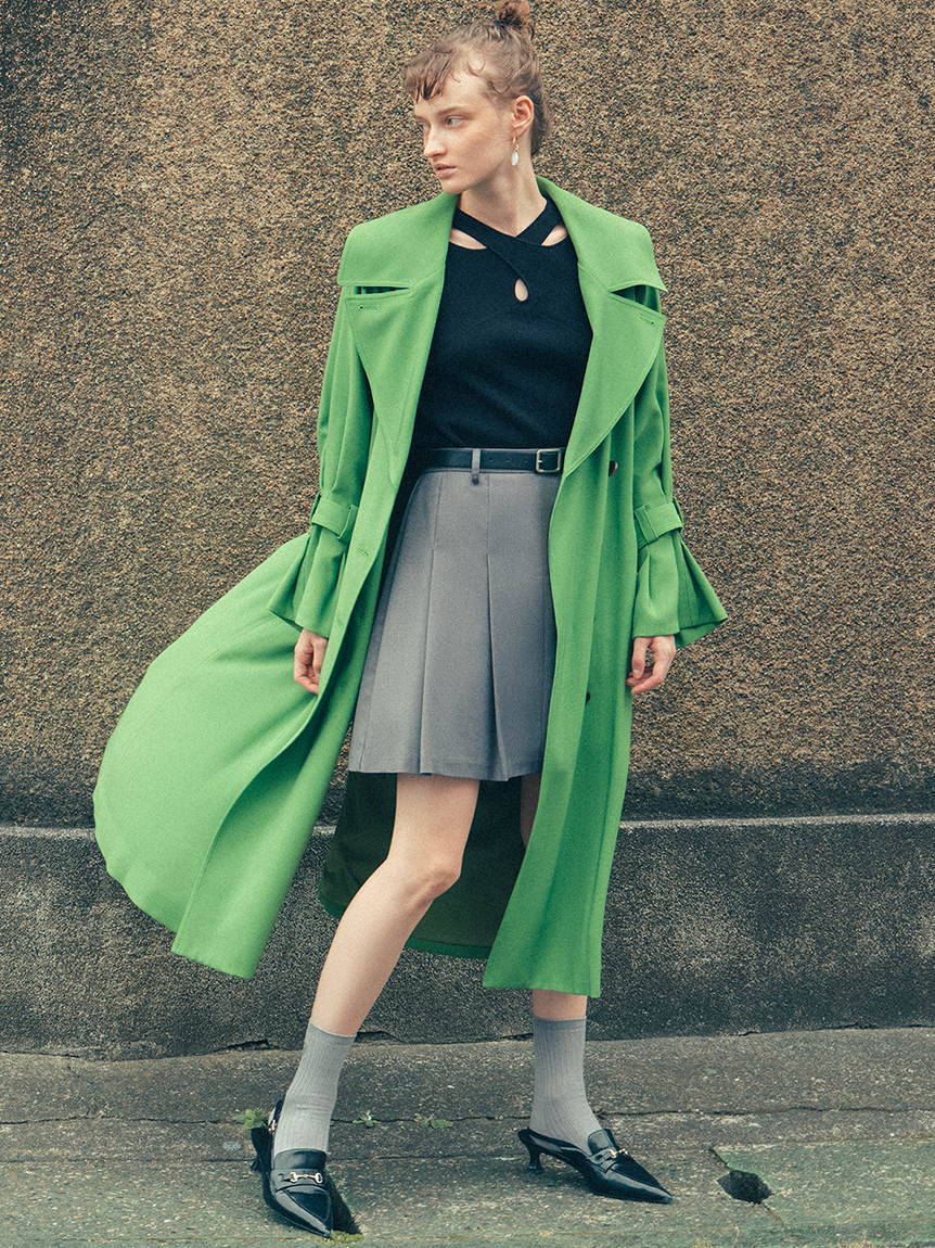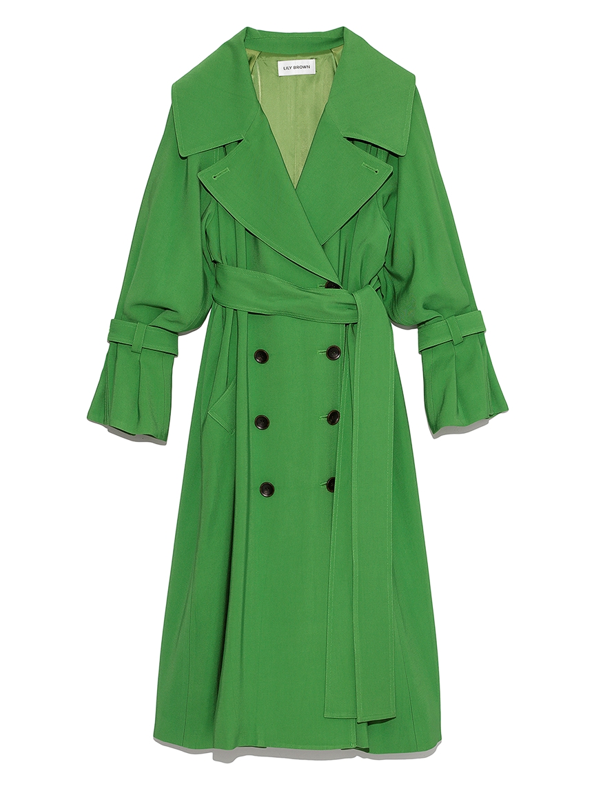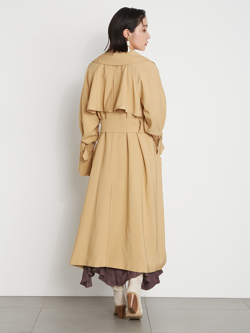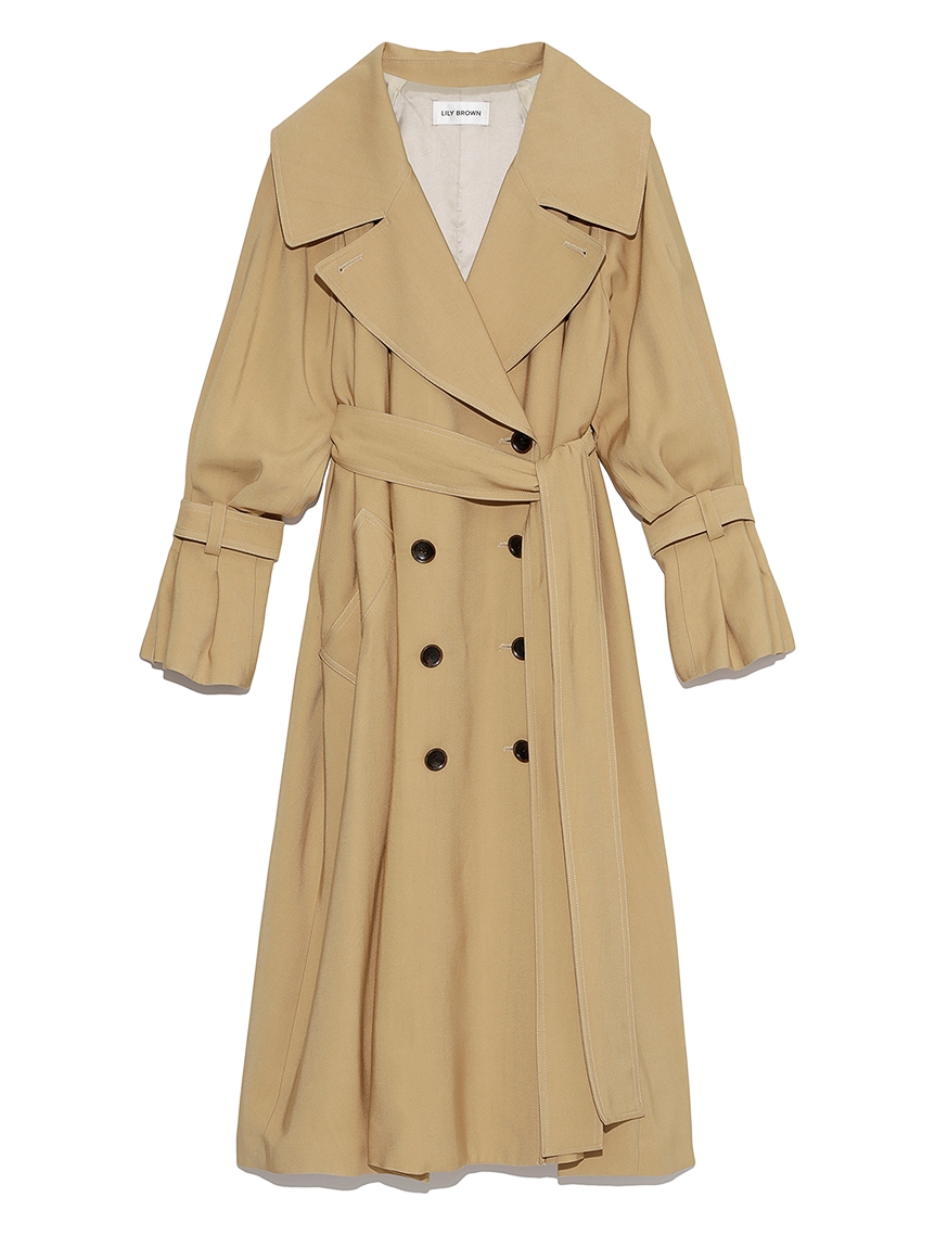 トレンド感のあるビッグカラーがポイントになったクラシカルなトレンチコート。顔回りがすっきり見えるように襟を少し抜き、天幅から前下がりまでを計算して美しいラインを演出しています。共布ベルトでウエストをきゅっと結べば、女性らしいメリハリのあるシルエットに。袖口はタックを寄せ、そこから広がるフレアなフォルムでエレガントさが高まります。少し袖を上げて着ると袖がくしゅっとし、ボリュームが出て手首が細見えするのもポイント。襟のシルエット、ステッチ、ベルト巾など細かなディテールはヴィンテージのトレンチコートからオマージュしたデザインで仕上げています。