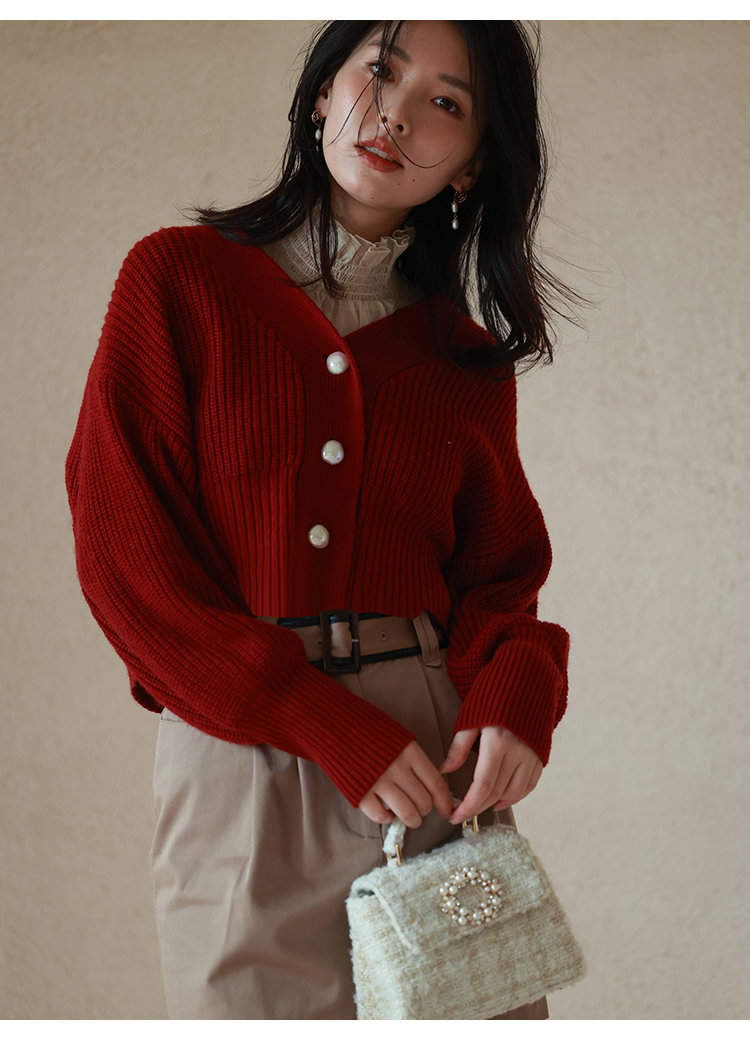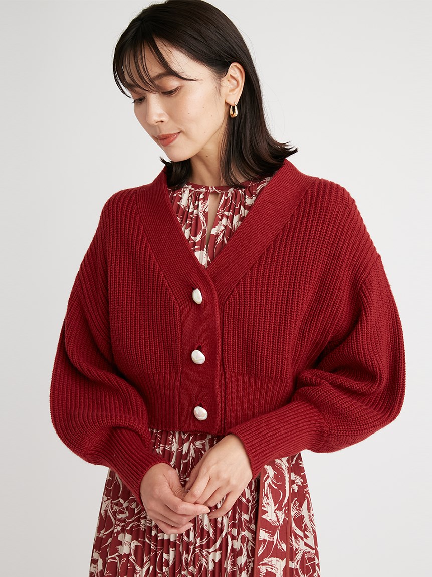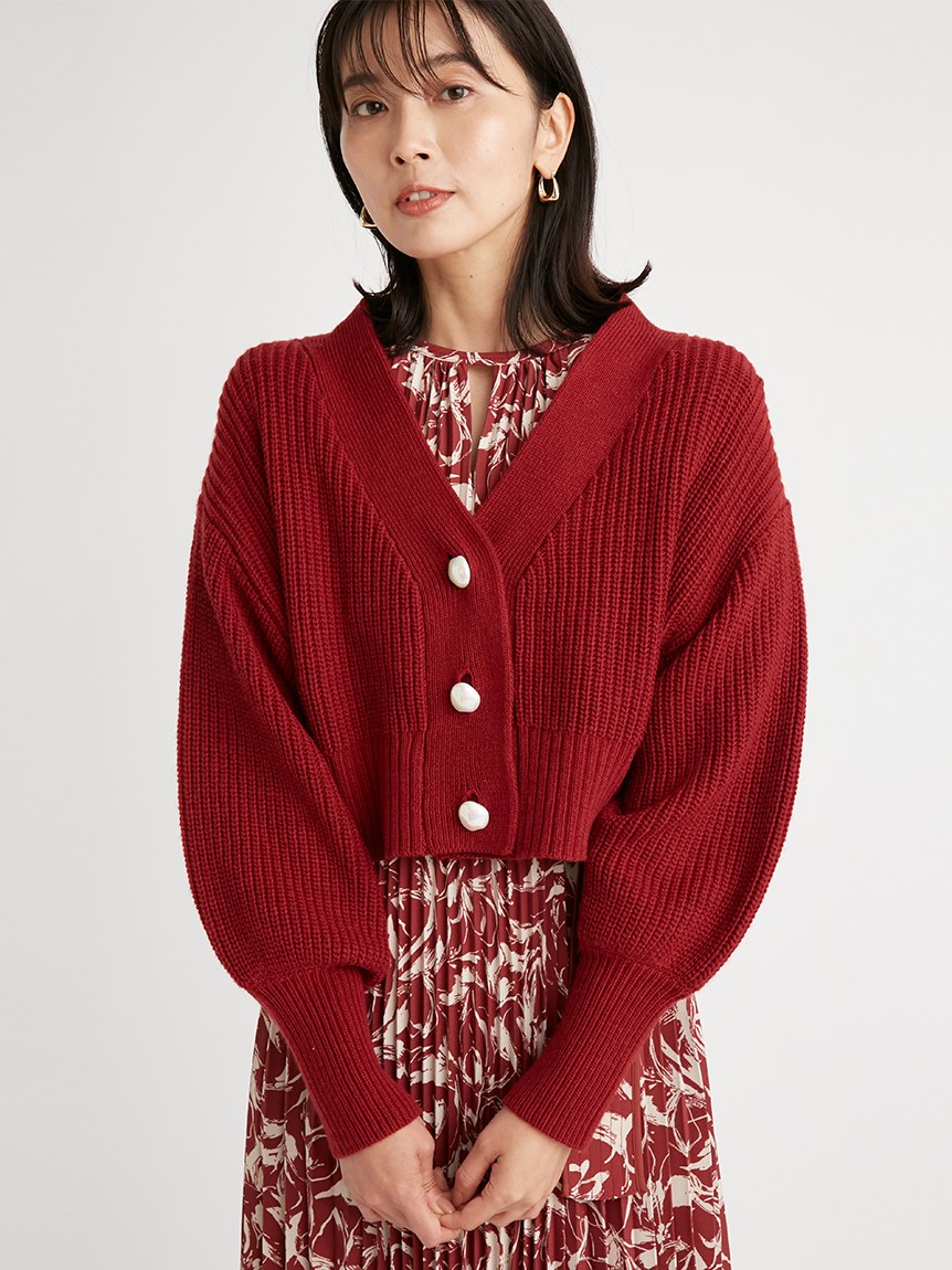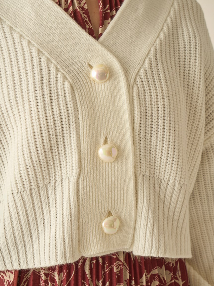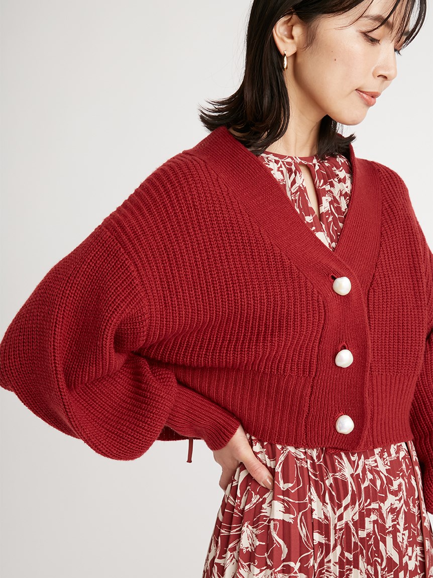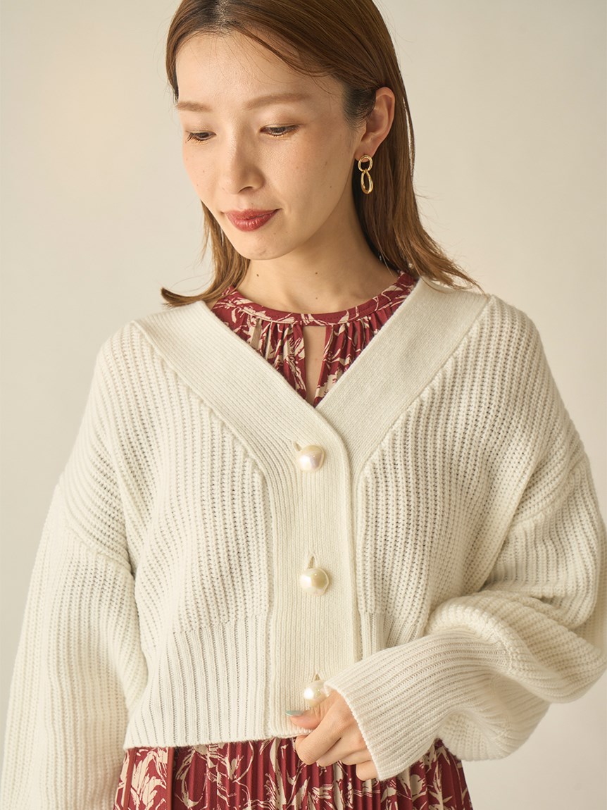 ツヤやかな質感のパール調ボタンがあしらわれた、品が良く華やかなニットカーディガン。肩のラインを落とし丸みのあるシルエットにすることで、ワンピースにも合わせやすい女性らしいフォルムに。さらりと羽織ればこなれ感が生まれ、スタイリングの鮮度が一気に高まります。