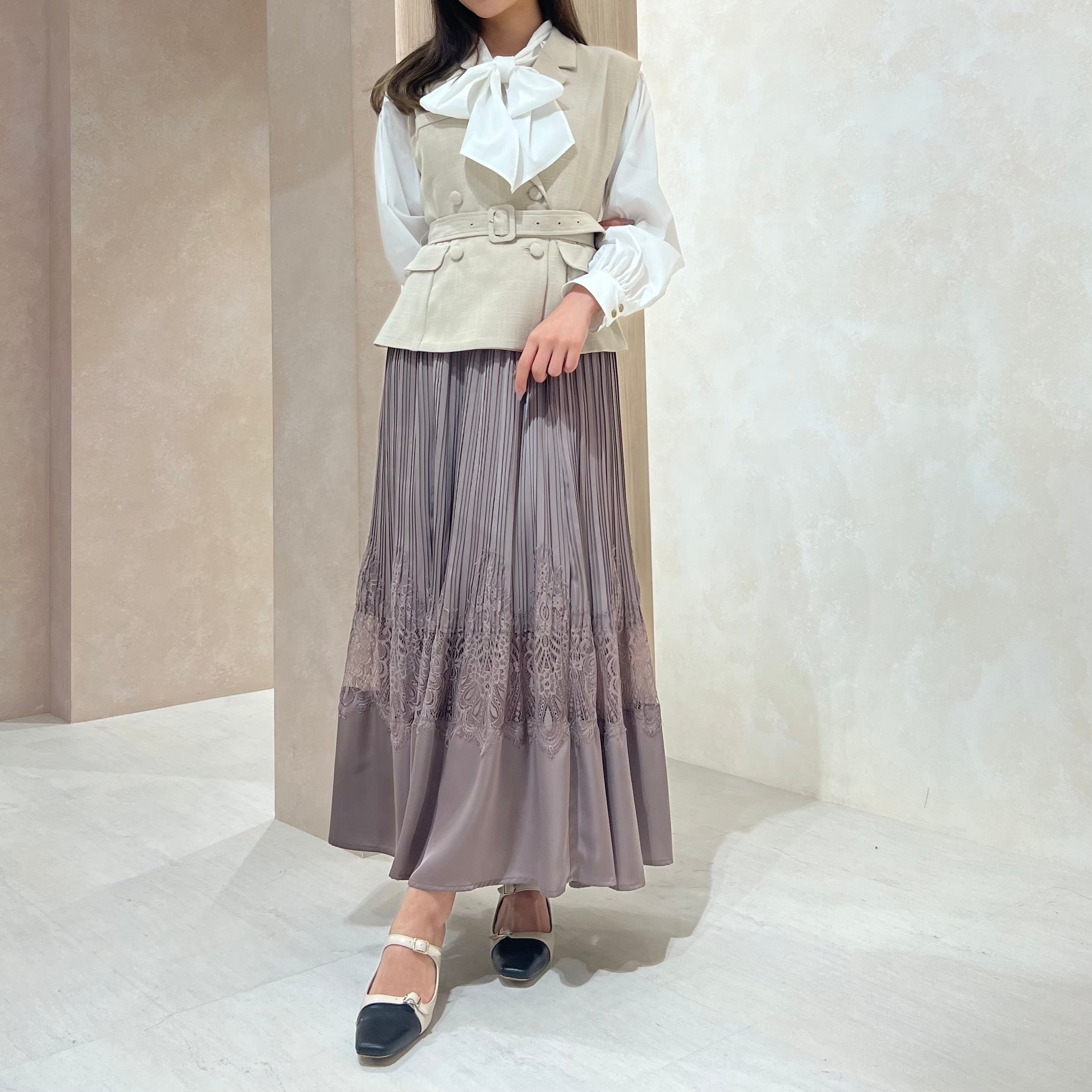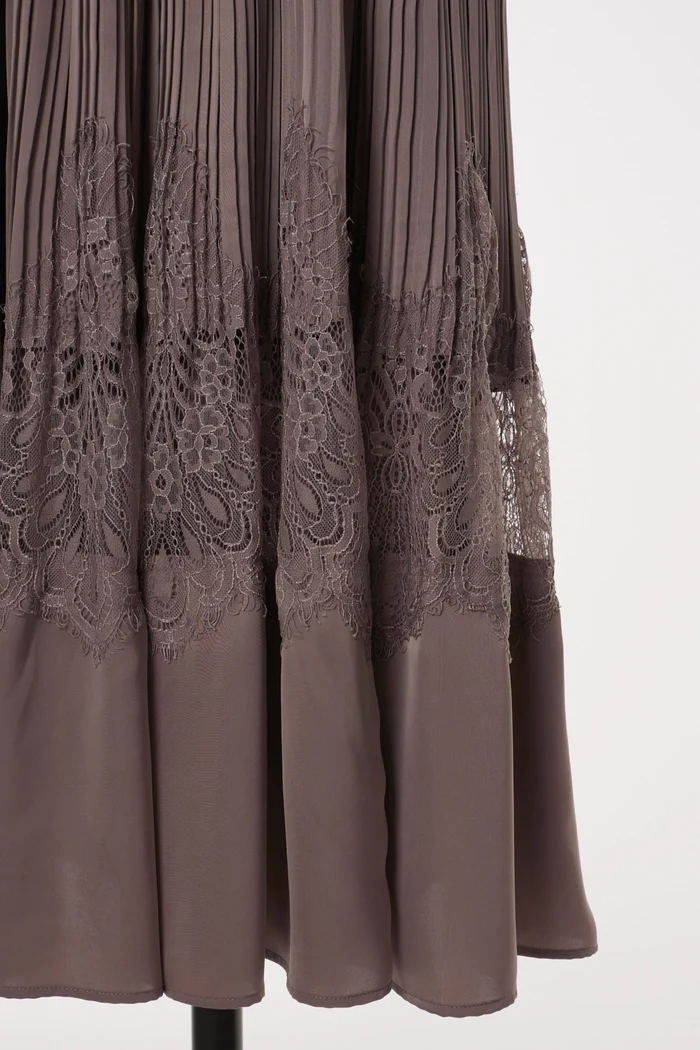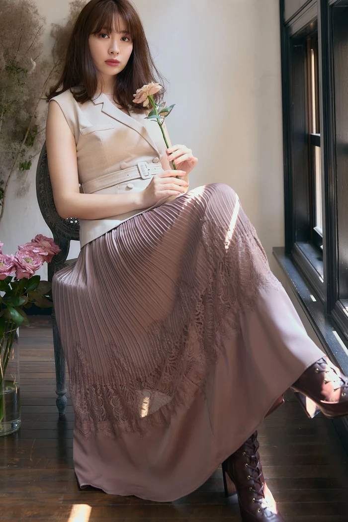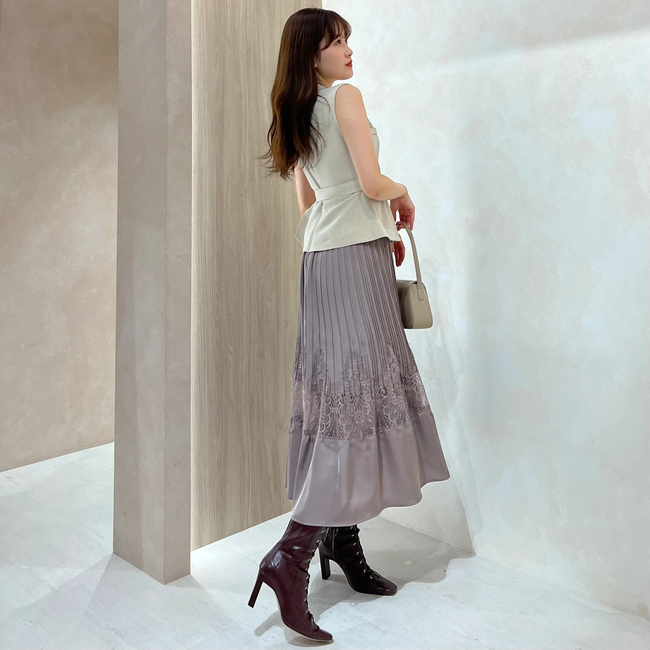 スカートには滑らかで艶感のある上品なサテン素材を使用、細かなランダムプリーツをふんだんに施し、程よい透け感のレースで切り替えることによって足元に抜け感を与えました。