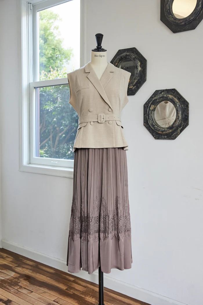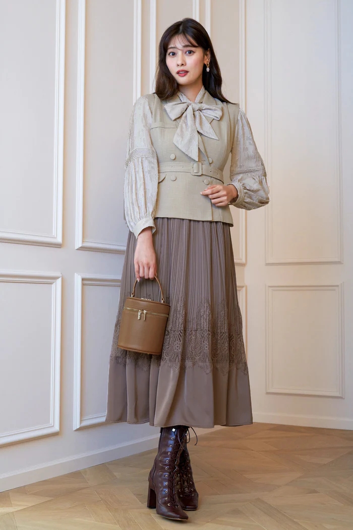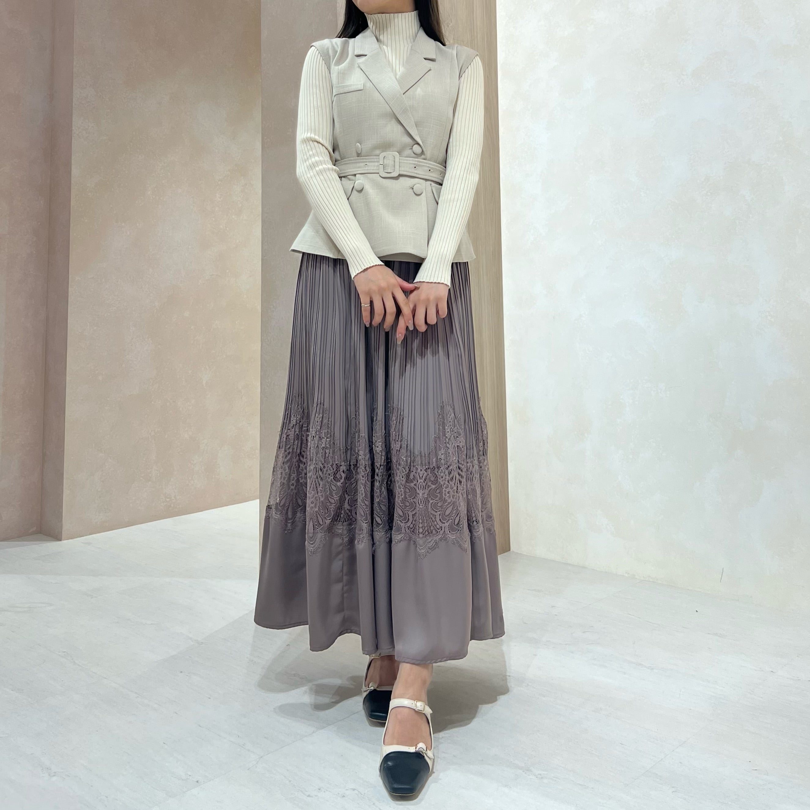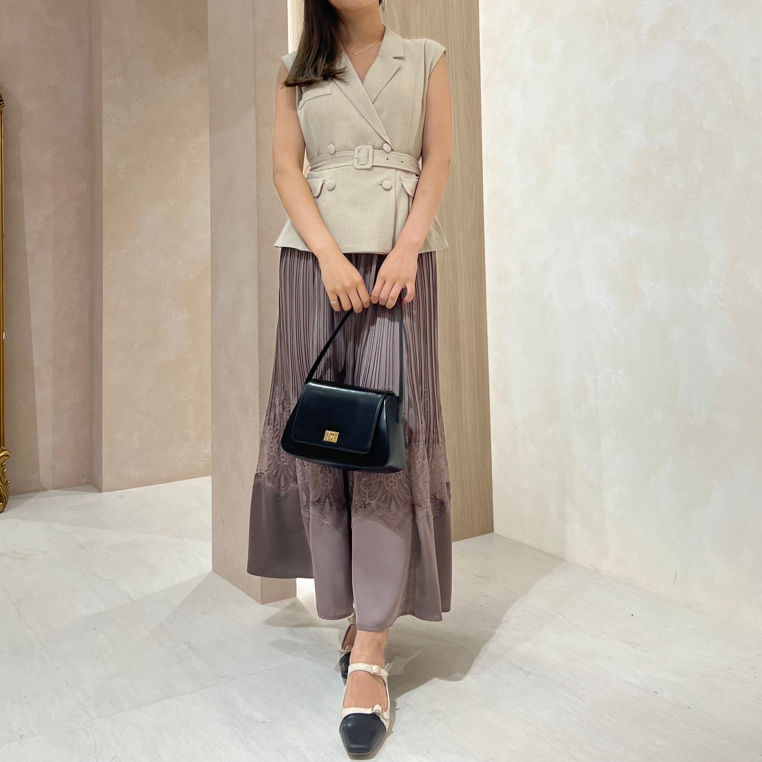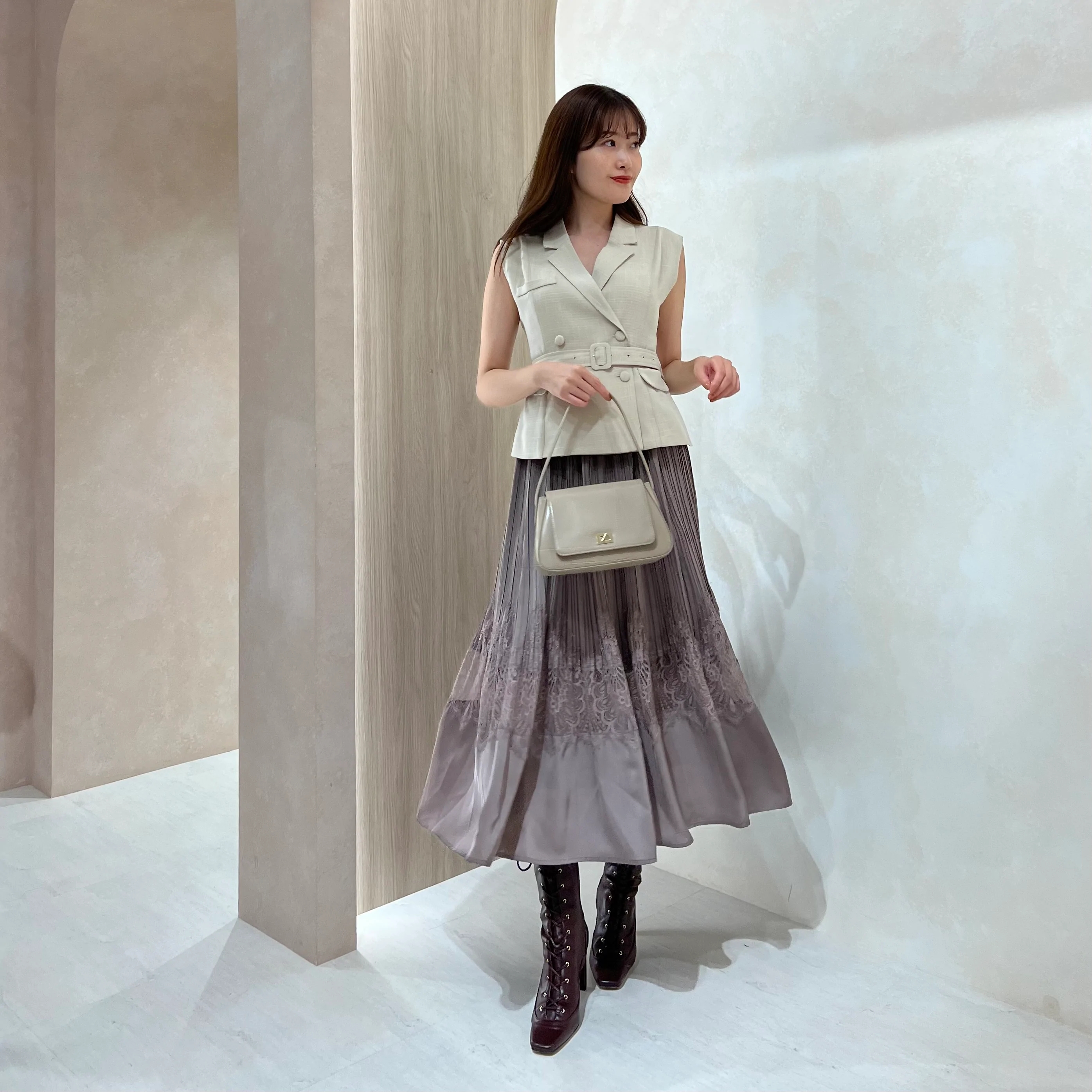 スカートには滑らかで艶感のある上品なサテン素材を使用、細かなランダムプリーツをふんだんに施し、程よい透け感のレースで切り替えることによって足元に抜け感を与えました。