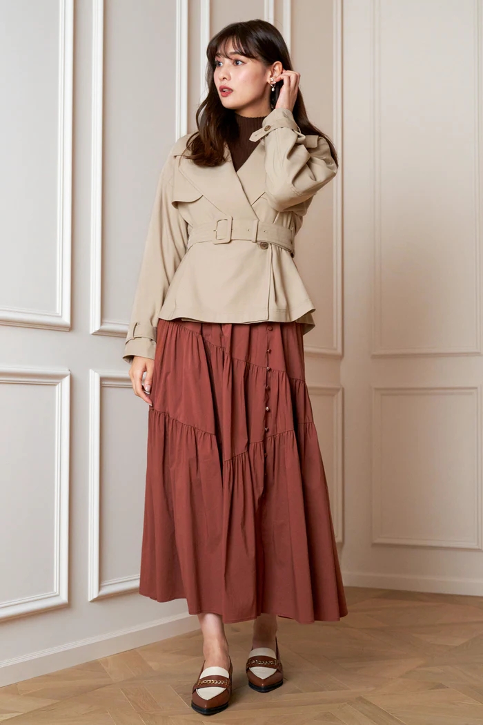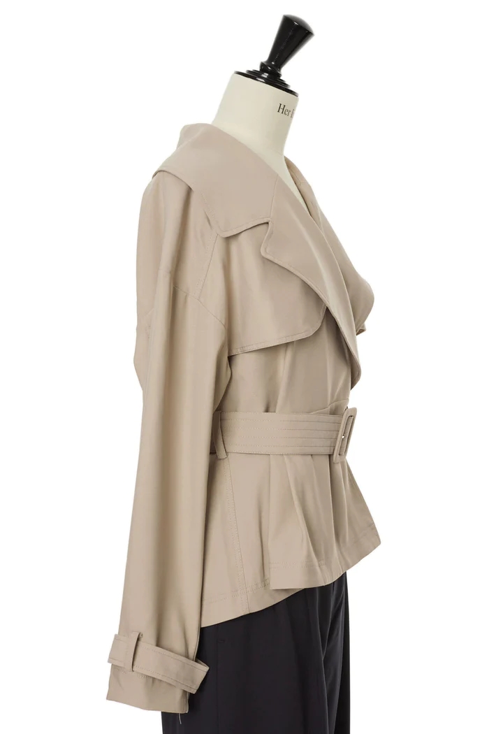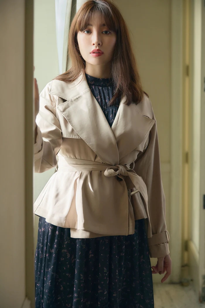 大人の女性の魅力を引き出す上品な印象のシルキーショートトレンチ。