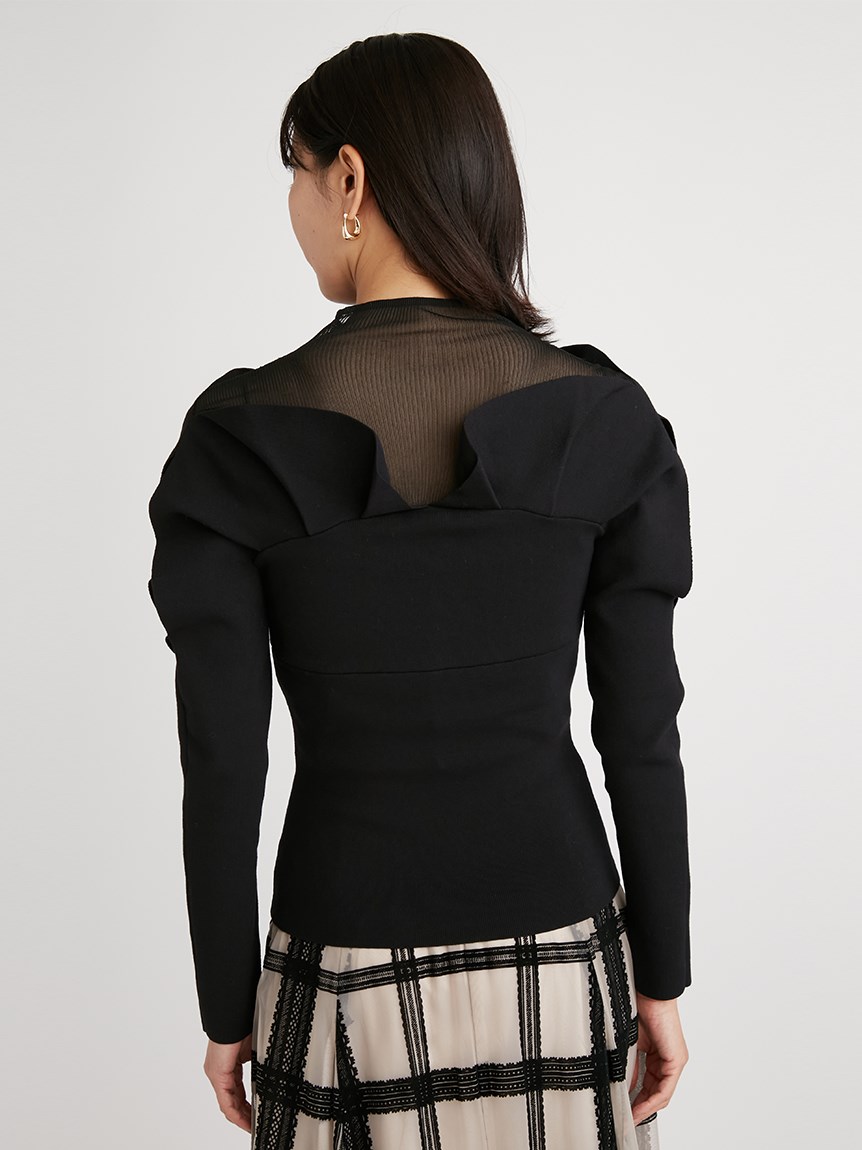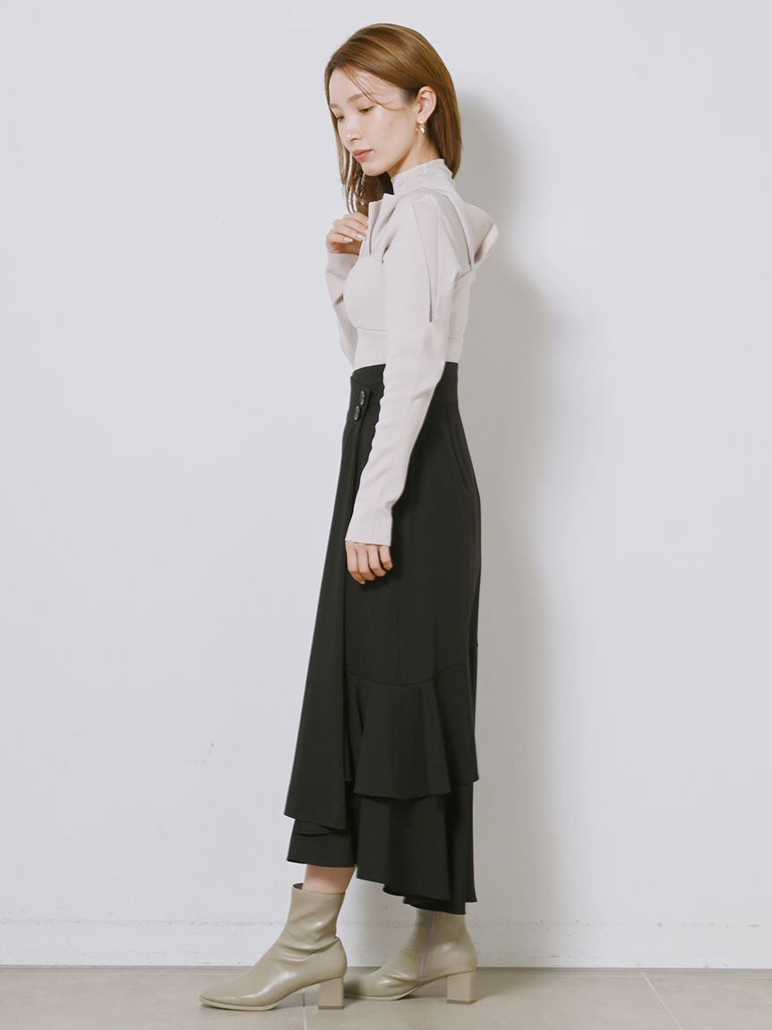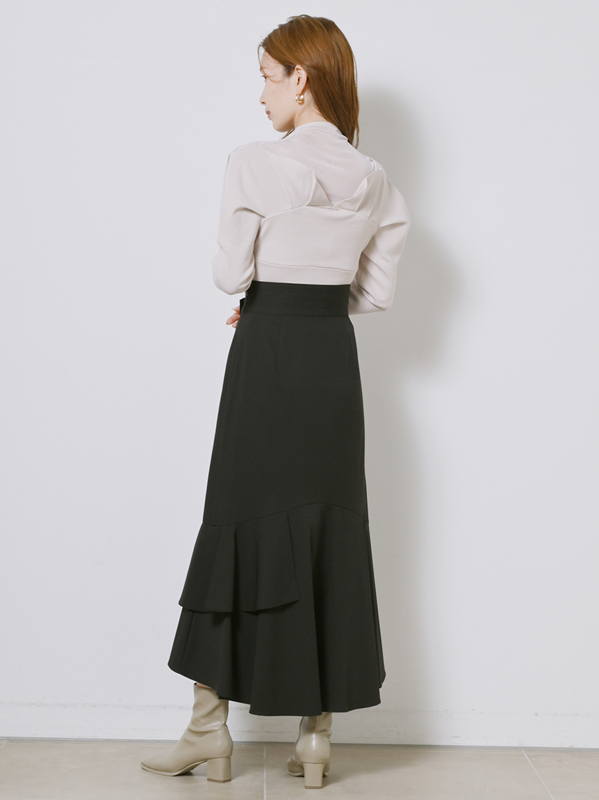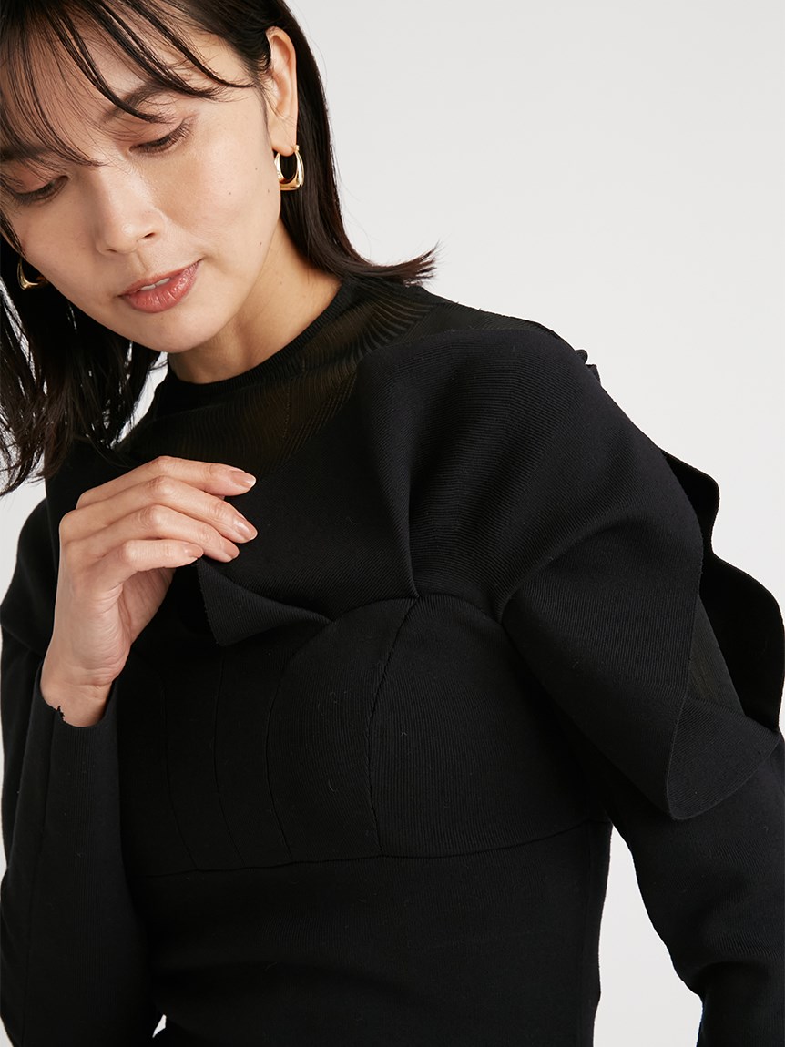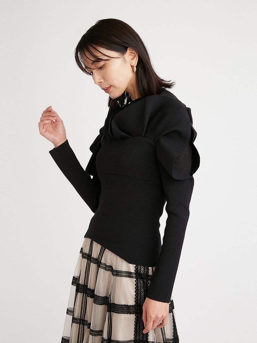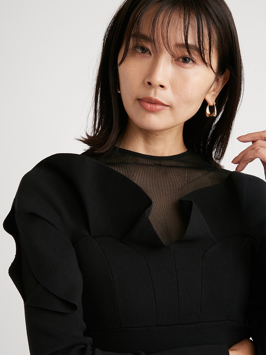 透け感のあるセンシュアルなデコルテとコルセットライクな身頃との絶妙なバランス感が魅力。「SNIDEL」定番のデコルテシースルーニットをモードに昇華させたこだわりの1着が届きました。前後に彩られたボリューミーなフリルでぐっと華やかな雰囲気に。オフショルにアレンジすることも可能なので、着こなしを自由に楽しめます。