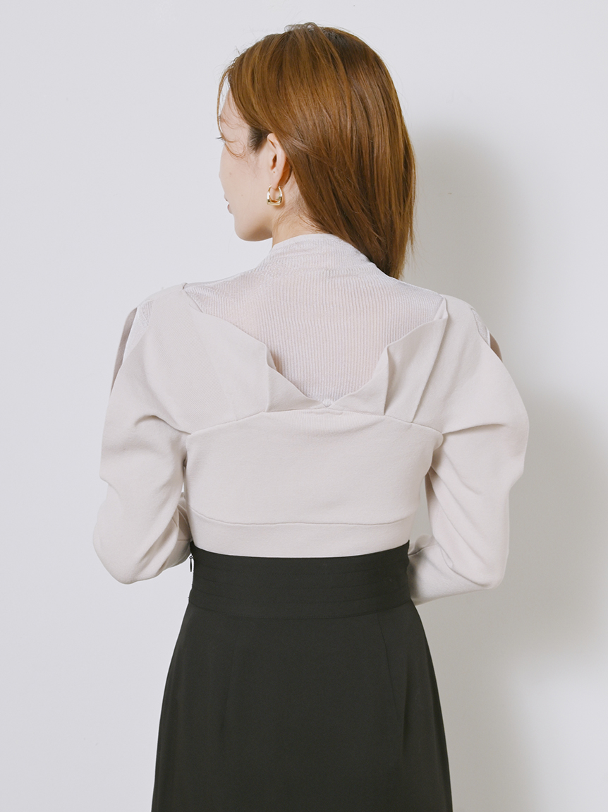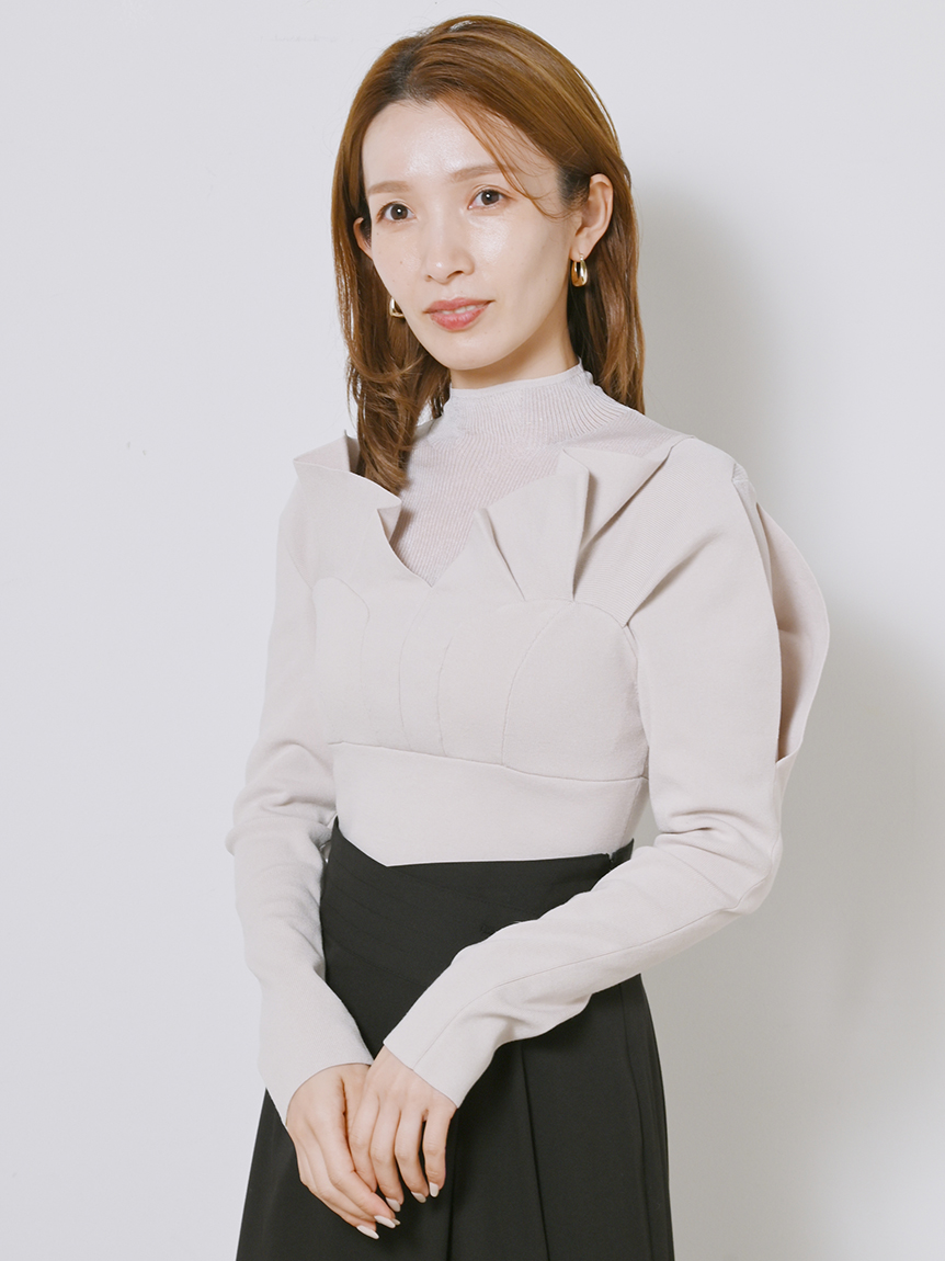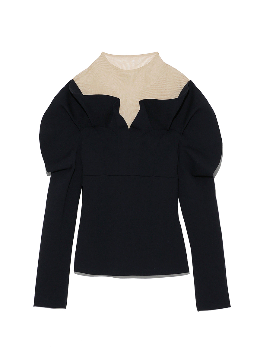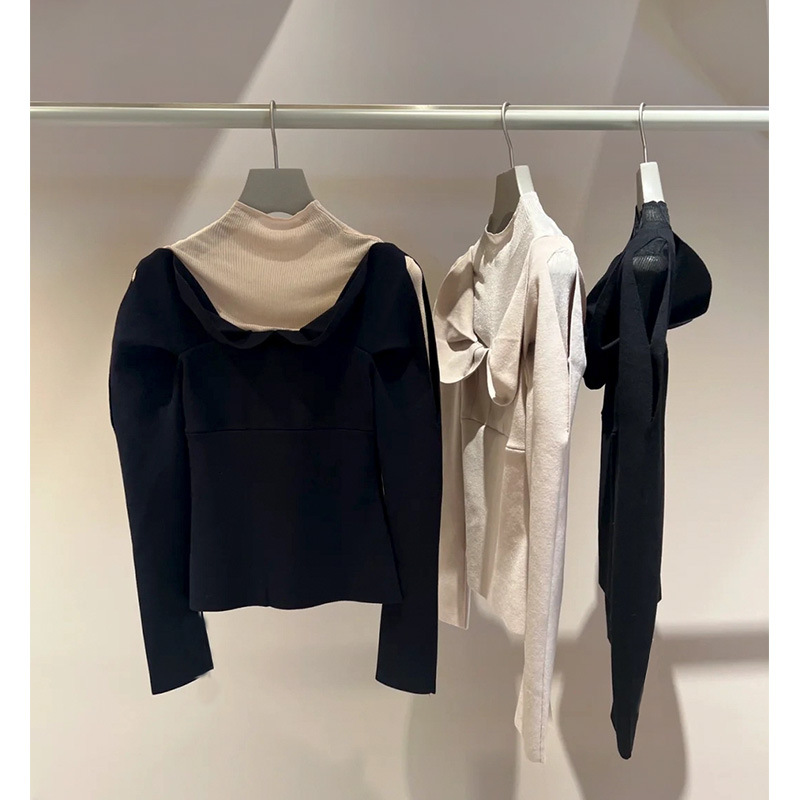 身頃は総針編みできりっとした印象に、デコルテ部分は細番手の糸で透け感のある編地を使用しました。全体をワントーンでまとめたアイボリーとブラック、バイカラーデザインを取り入れたネイビーの3色展開です。