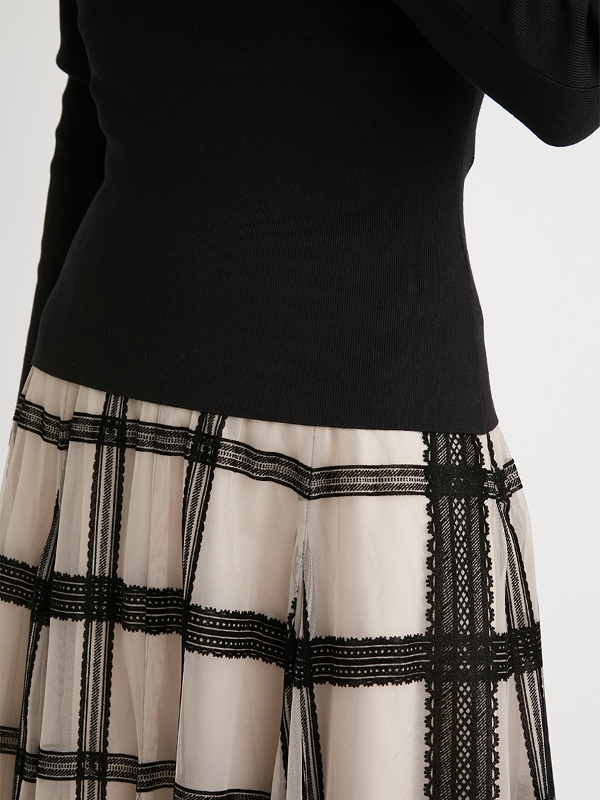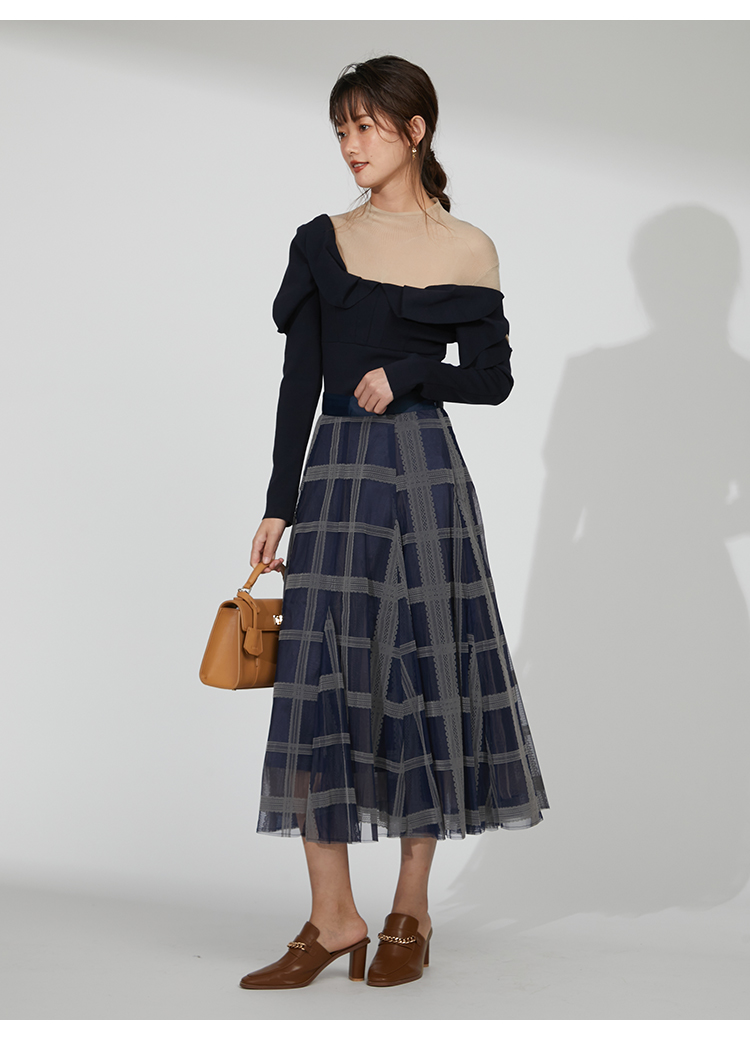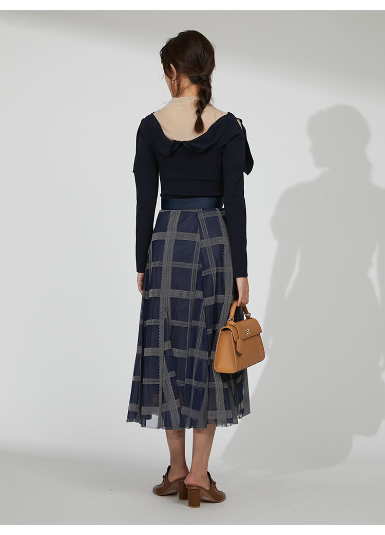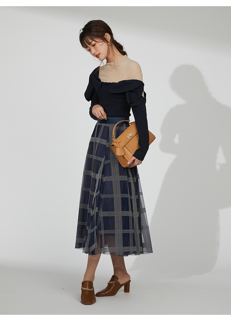 身頃は総針編みできりっとした印象に、デコルテ部分は細番手の糸で透け感のある編地を使用しました。全体をワントーンでまとめたアイボリーとブラック、バイカラーデザインを取り入れたネイビーの3色展開です。