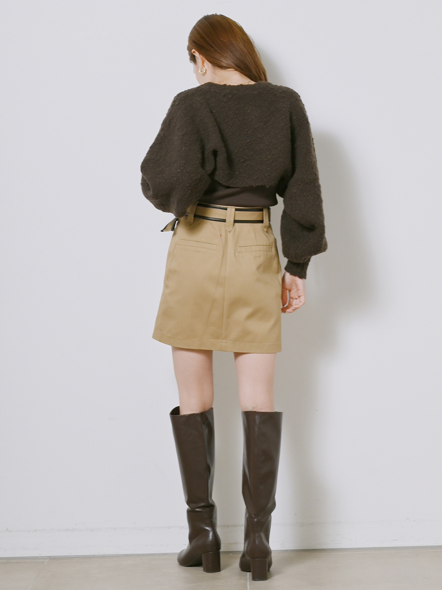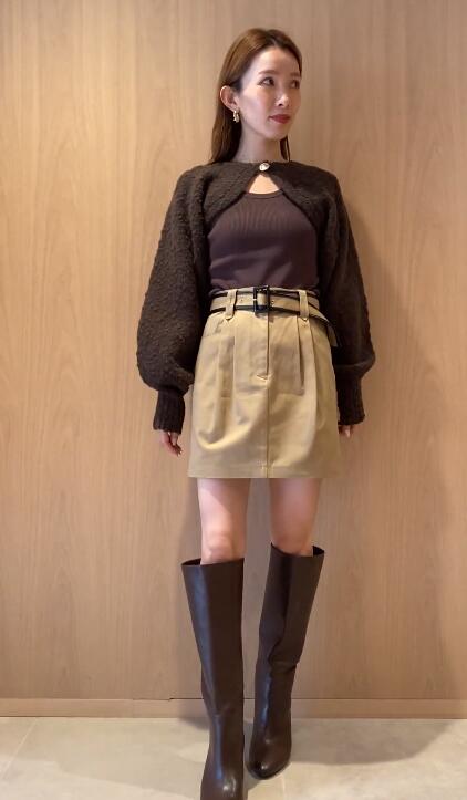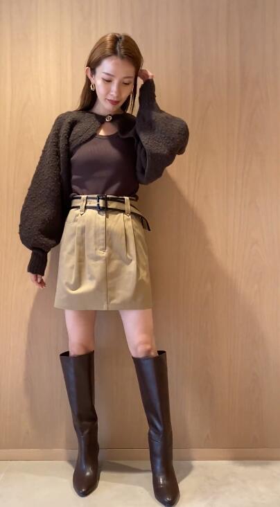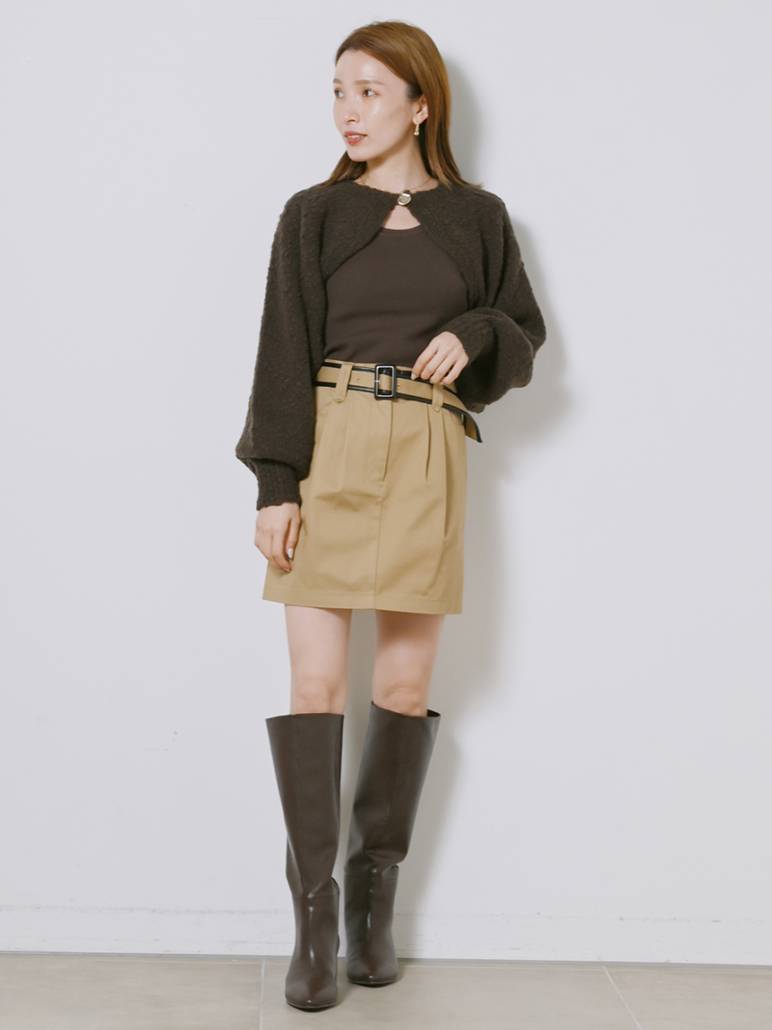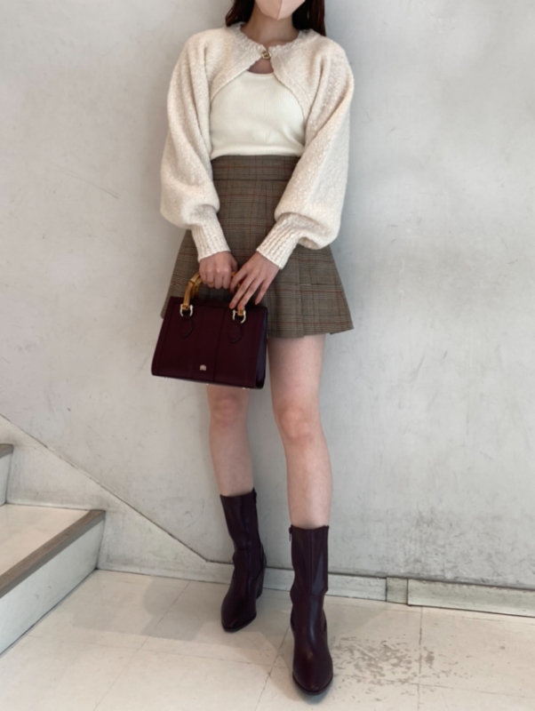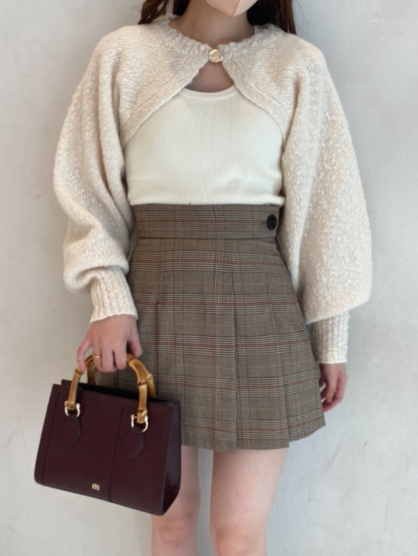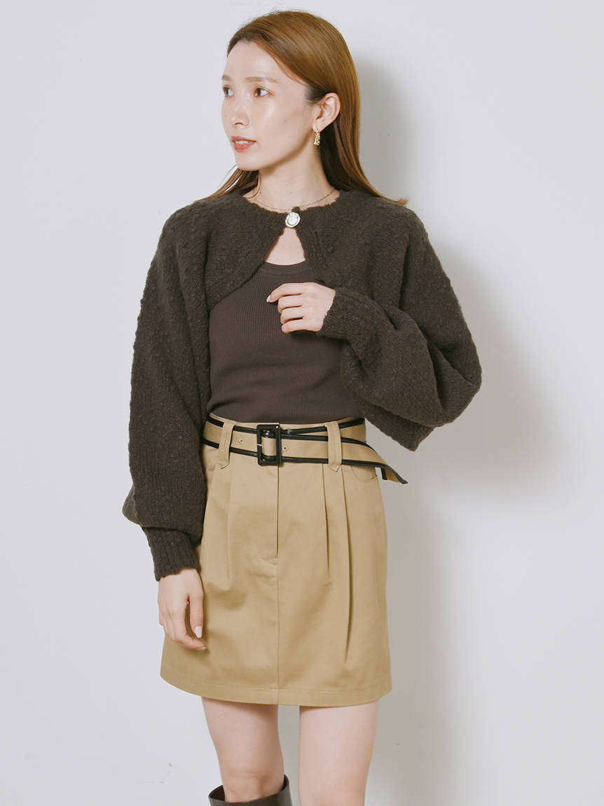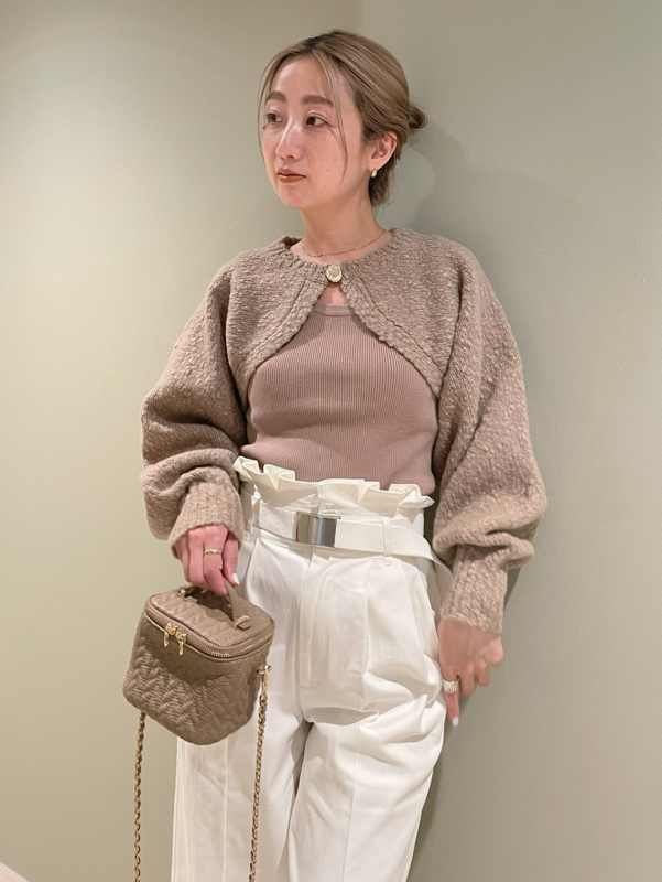 ボレロはイタリア糸を用いた編地に表情のあるニット素材を使用、タンクは伸縮性のあるリブニットを使用しました。ホワイト、ベージュ、ダークブラウンの着まわしやすいカラー展開でお届けします。