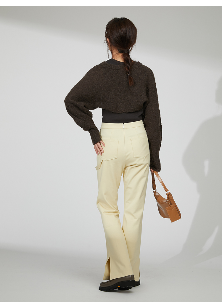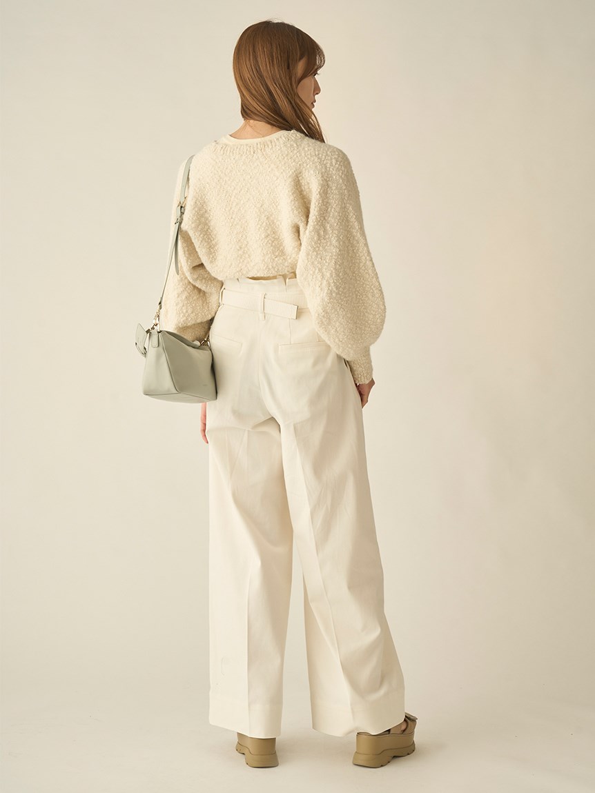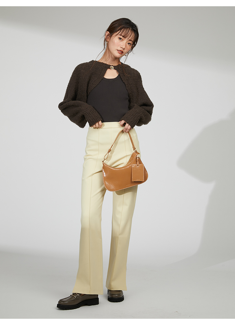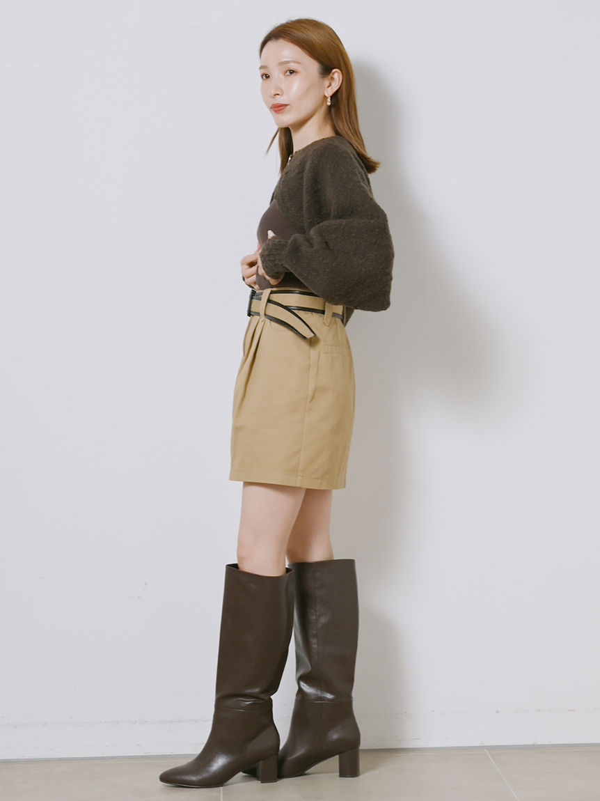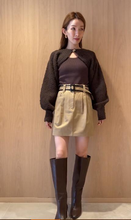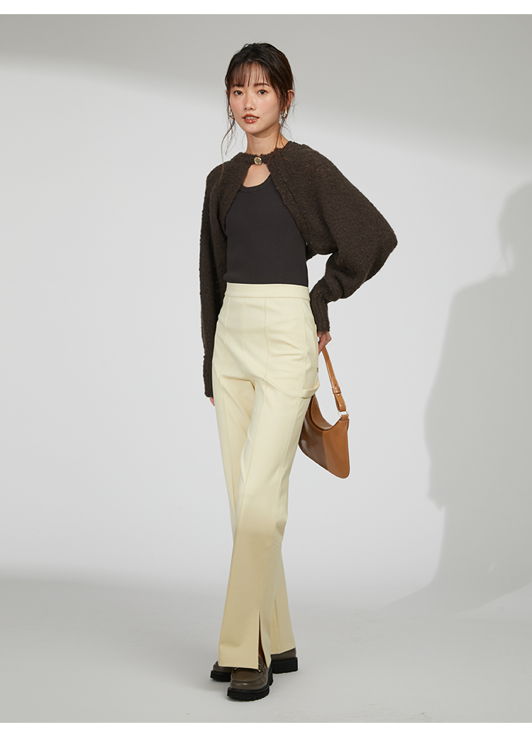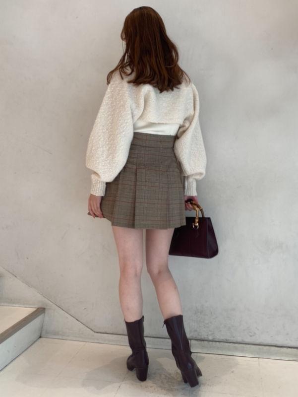 ボレロはイタリア糸を用いた編地に表情のあるニット素材を使用、タンクは伸縮性のあるリブニットを使用しました。ホワイト、ベージュ、ダークブラウンの着まわしやすいカラー展開でお届けします。