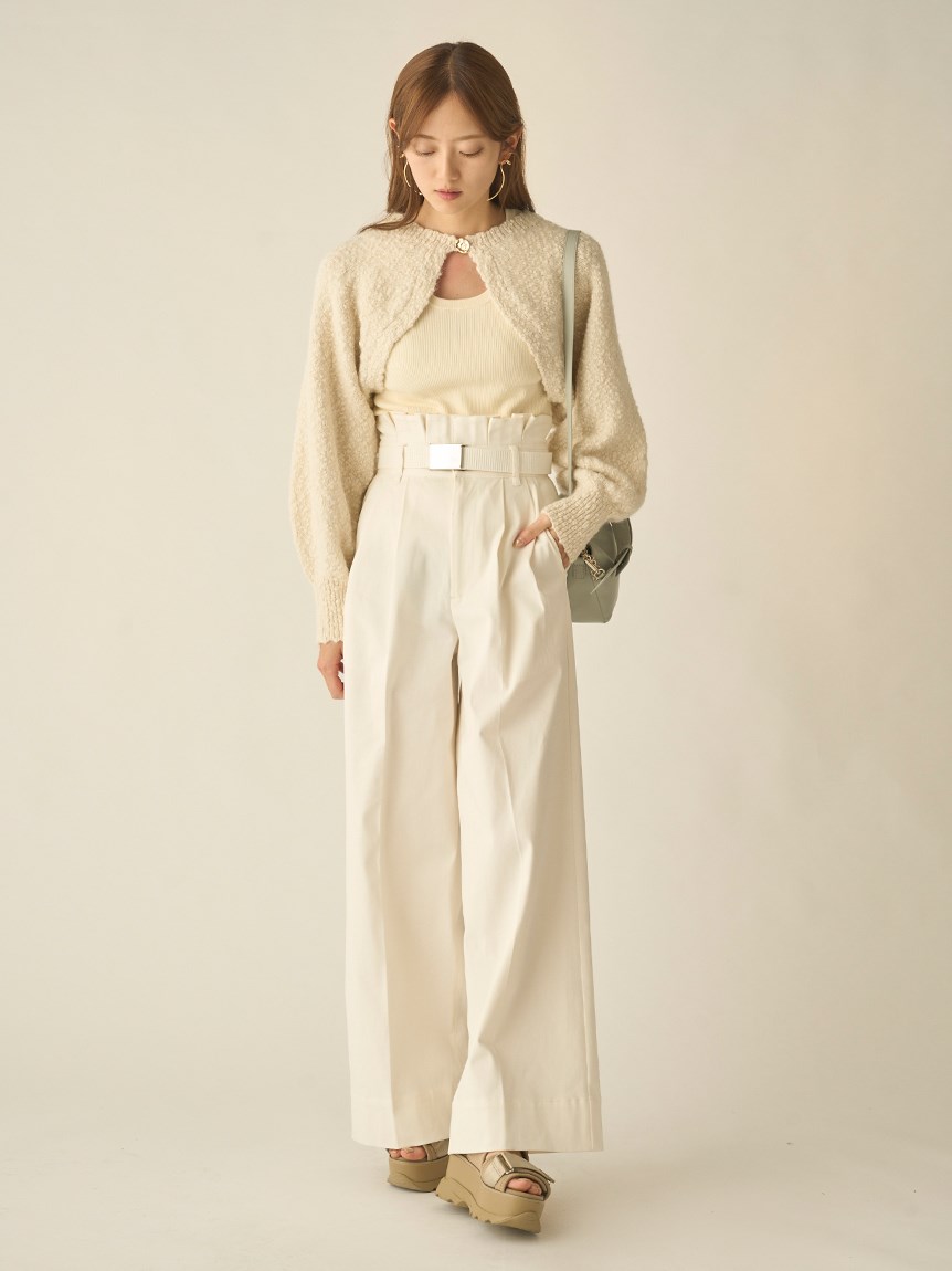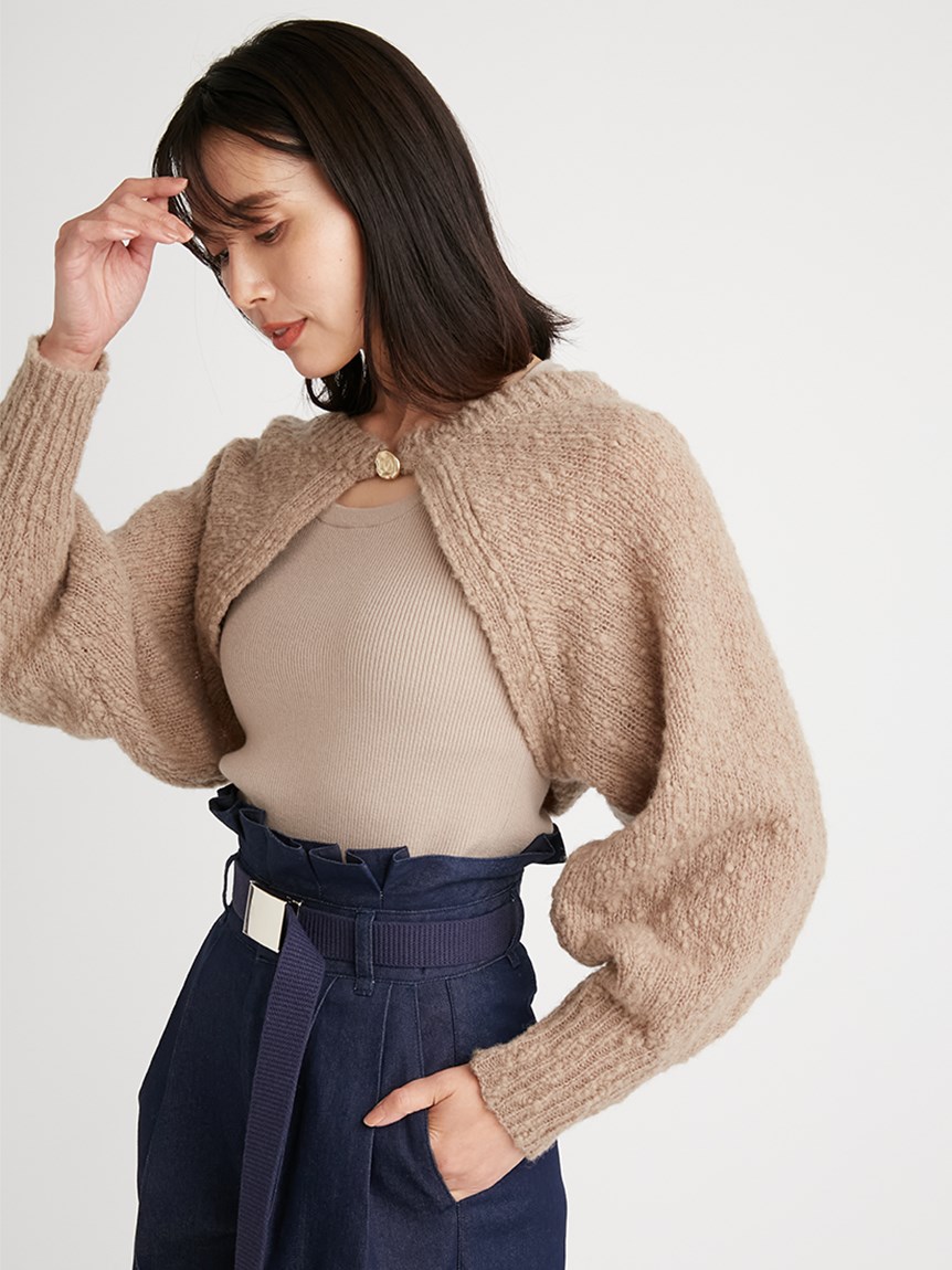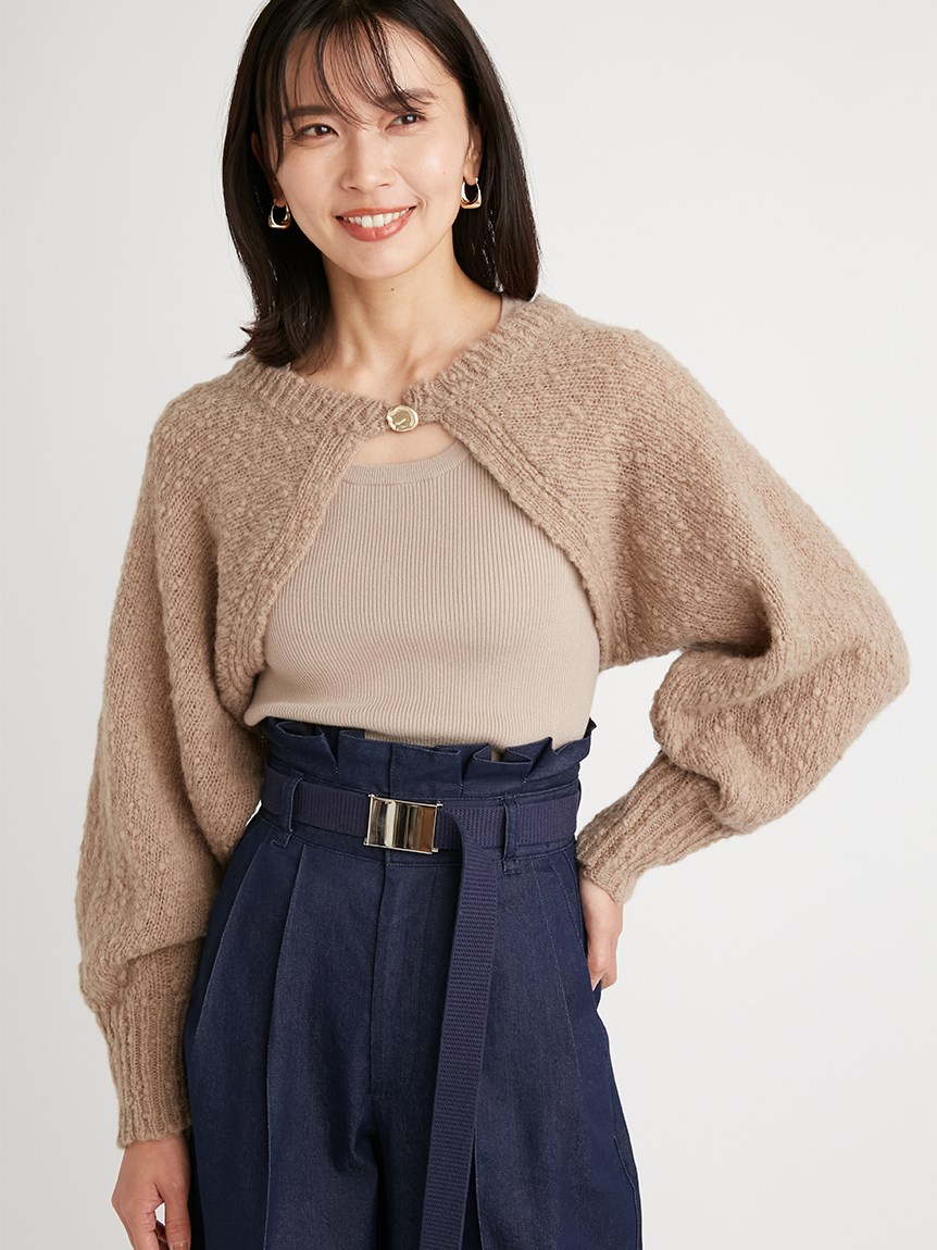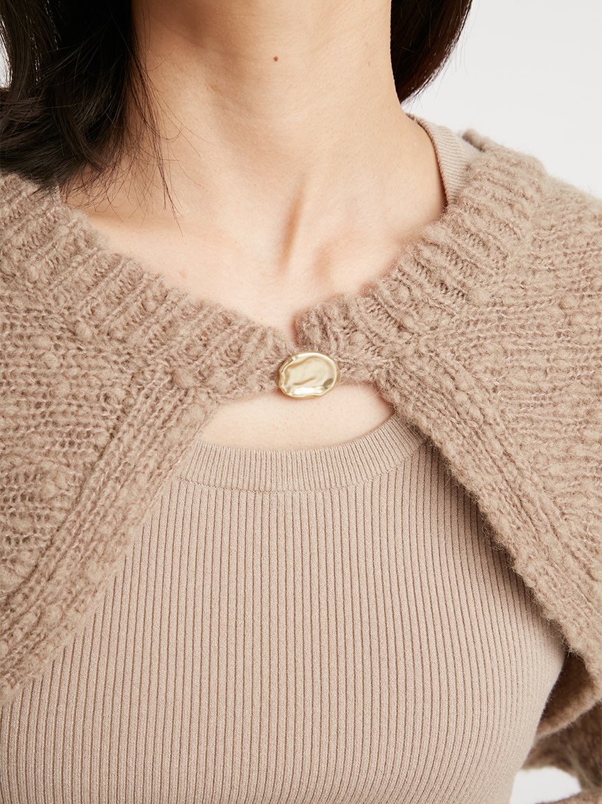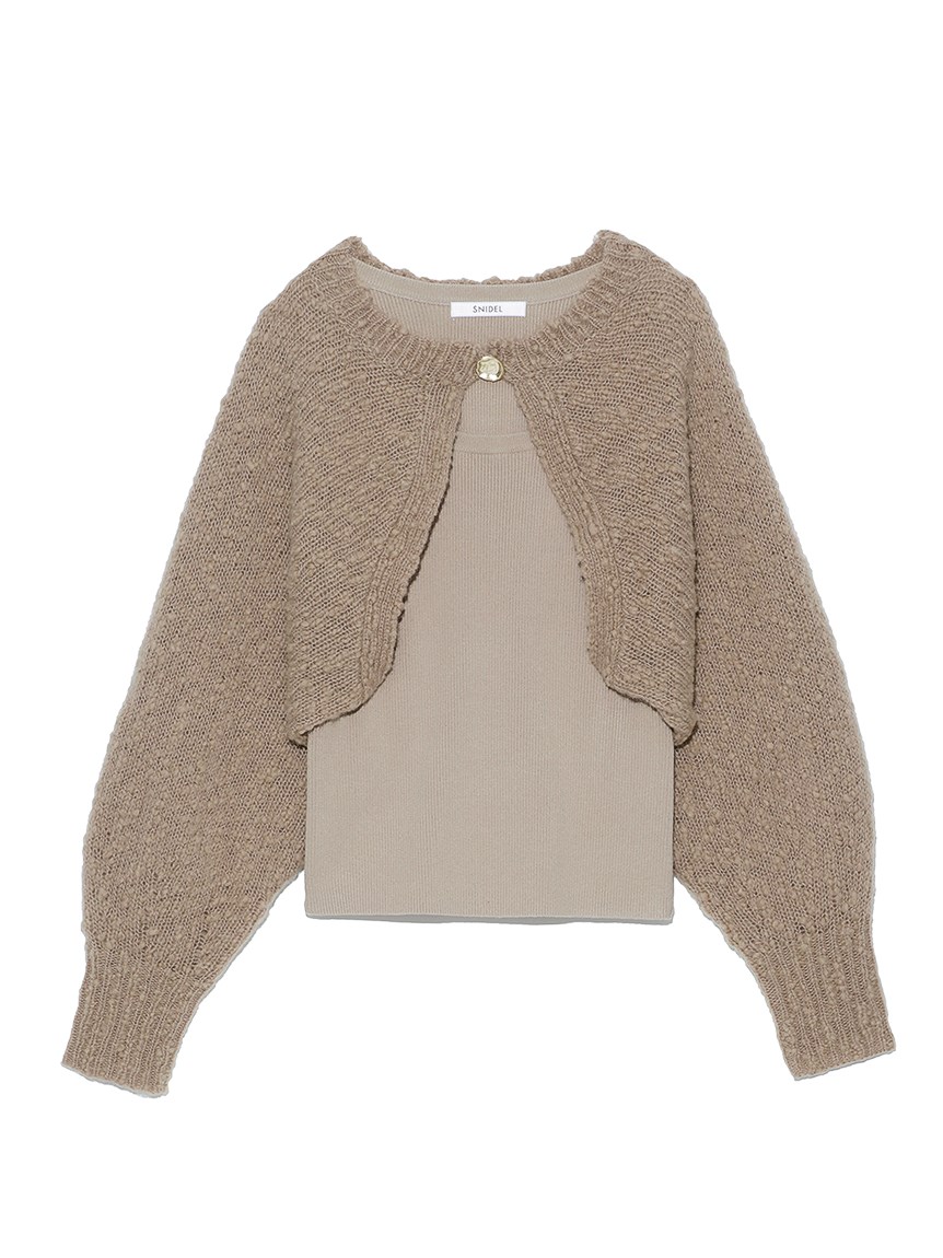 凸凹とした独特の表面感があるニット素材を使用したボレロカーディガン。セットになったニットタンクを合わせればデコルテに程よい開きができ、女性らしさがぐっと高まります。首元にあしらわれたデザインボタンがモードなアクセントに。それぞれ単品でも着られるので、コーディネートの幅が一気に広がります。