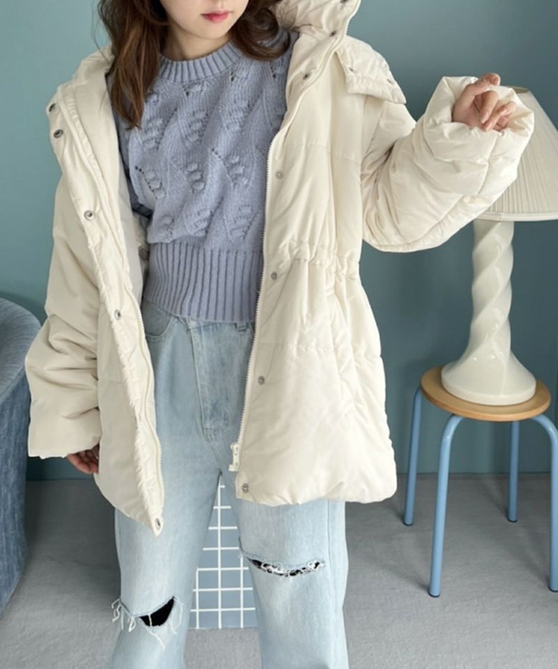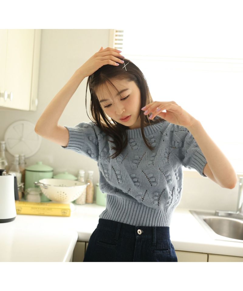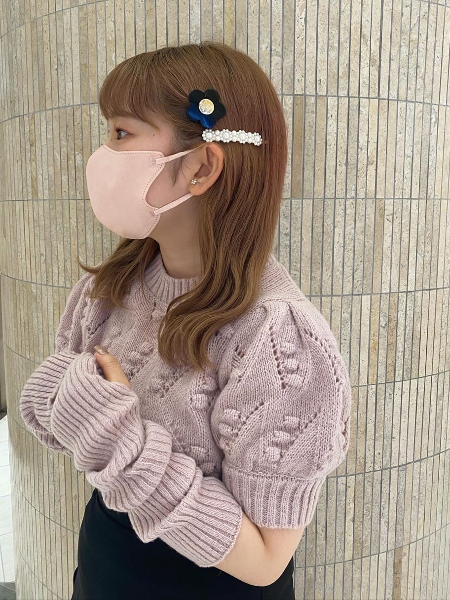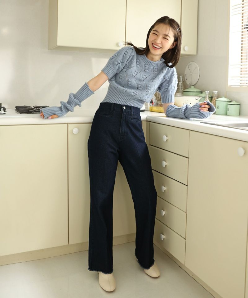 フロントのポンポンや、ところどころに透かし編みの部分もあったりと1枚でも華やかに見せてくれます。