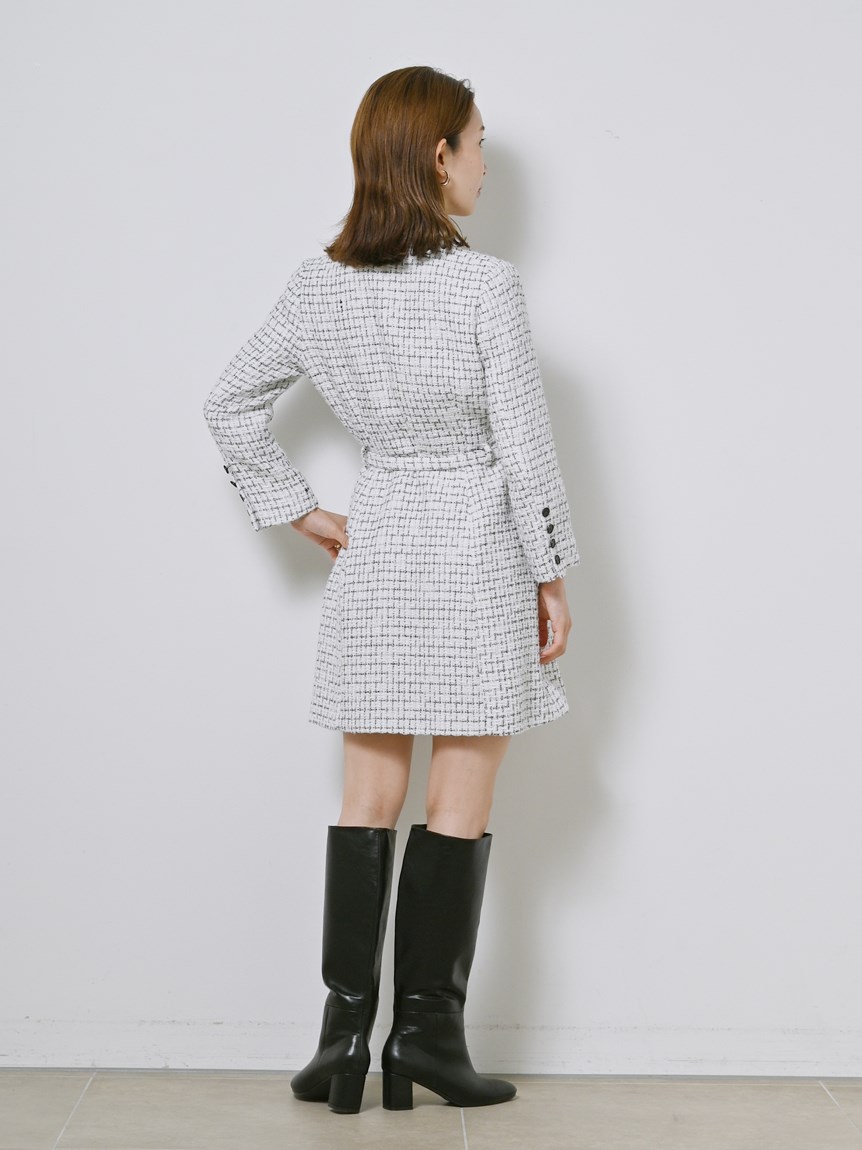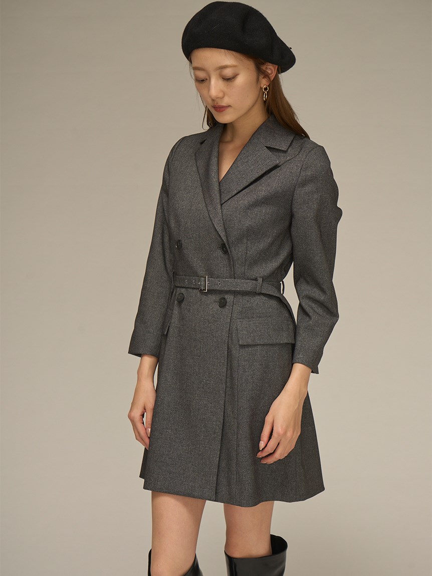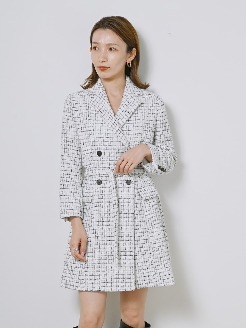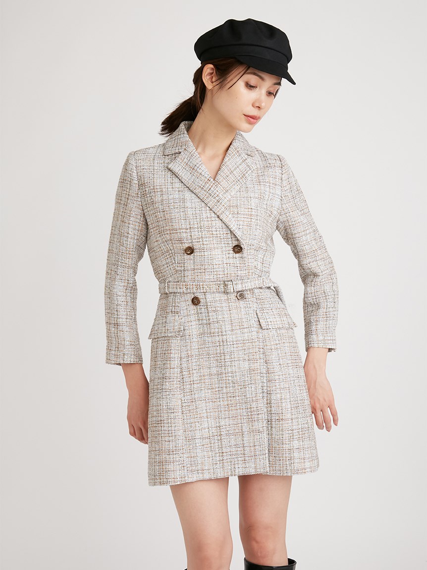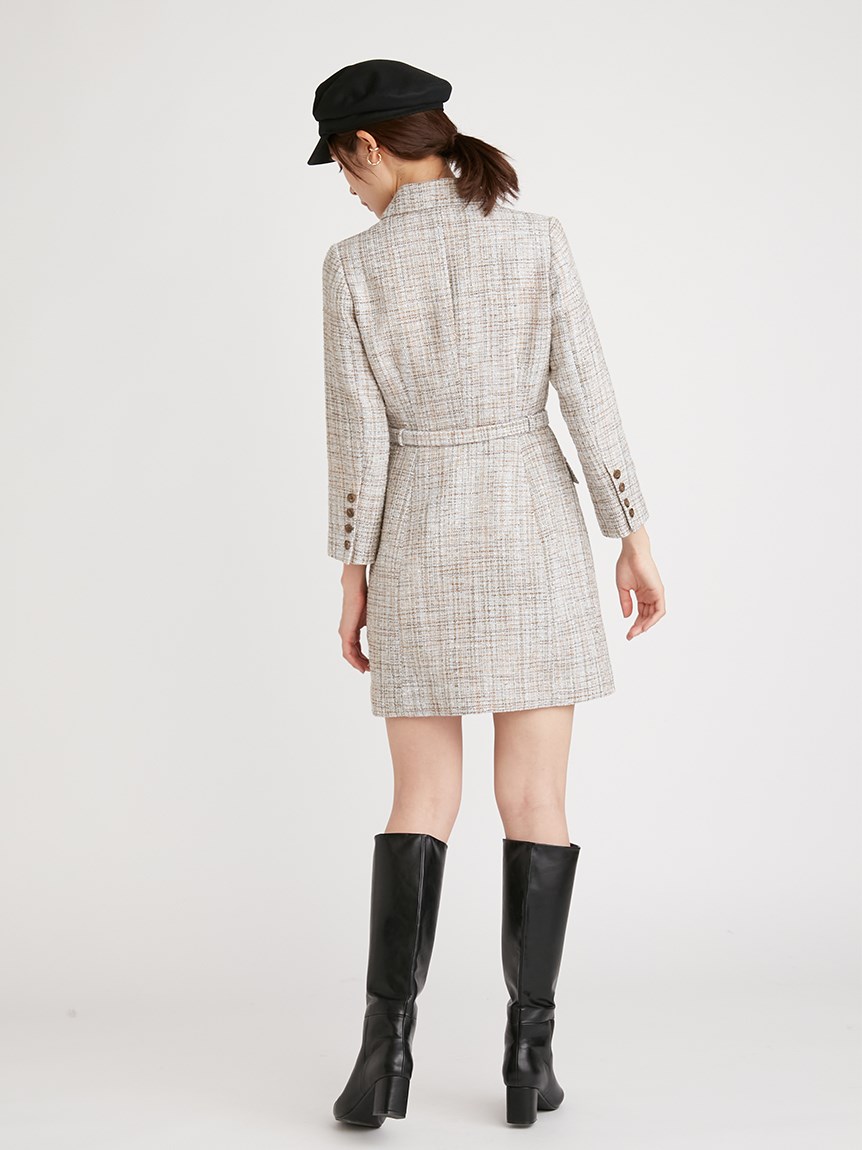 ジャケットのディテールを取り入れハンサムなルックスに仕上げた、トレンド感溢れるミニワンピース。女性らしさが際立つように、立体感のある構築的なシルエットを作り上げました。付属のベルトでウエストをマークすることでメリハリ感をプラス。フロントの飾りボタンに加え、打掛ボタンを備えているので裾が広がることがなく、安心して着用いただけます。