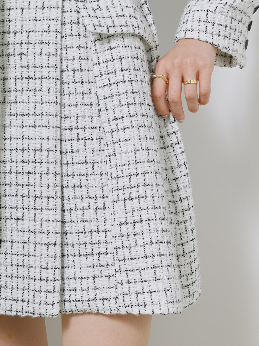 シンプルな無地のグレー、ツイードチェックのミックス、マニッシュな印象を与えるストライプのそれぞれ印象の異なる3色展開に加え、WEB限定カラーでホワイトをお届けします。