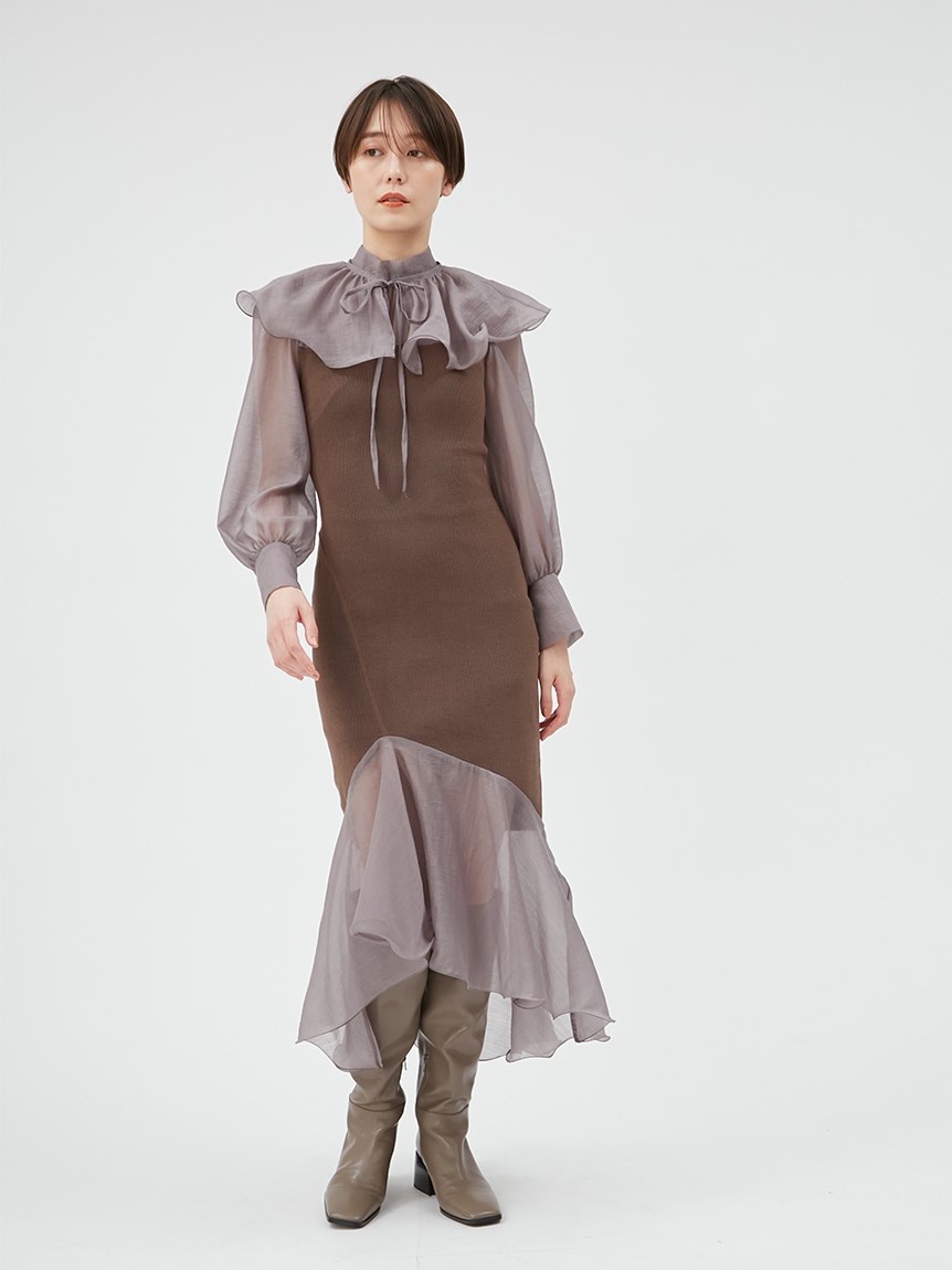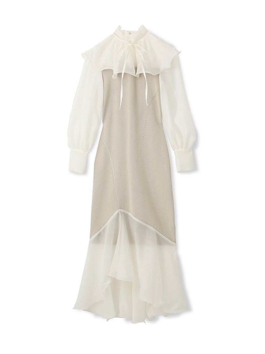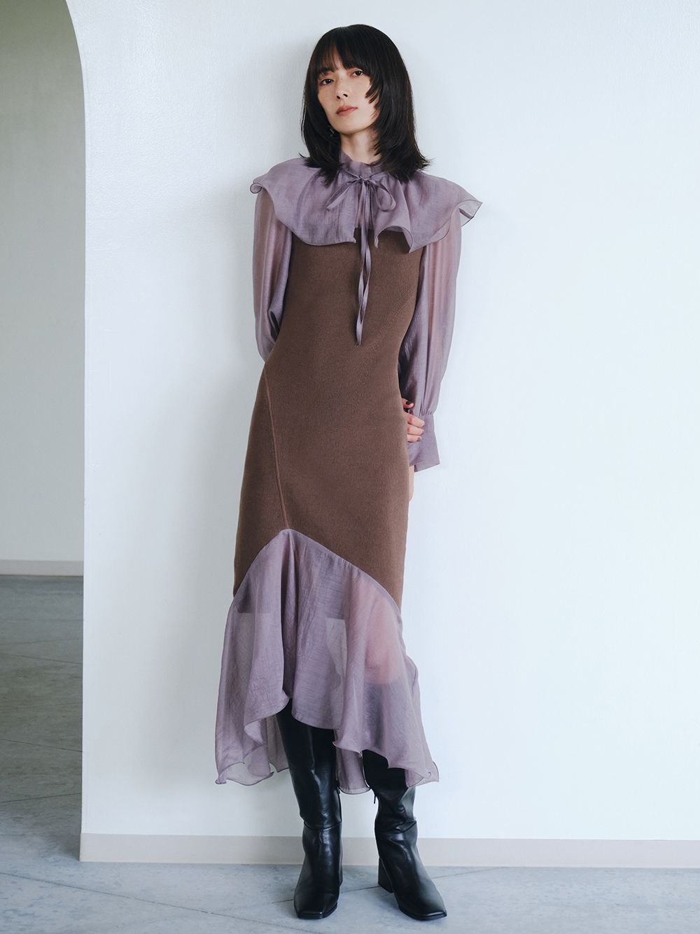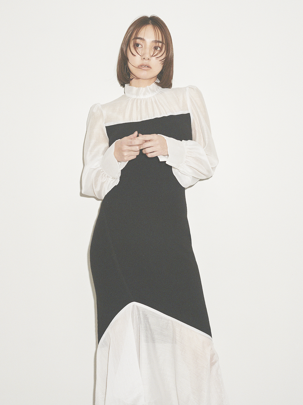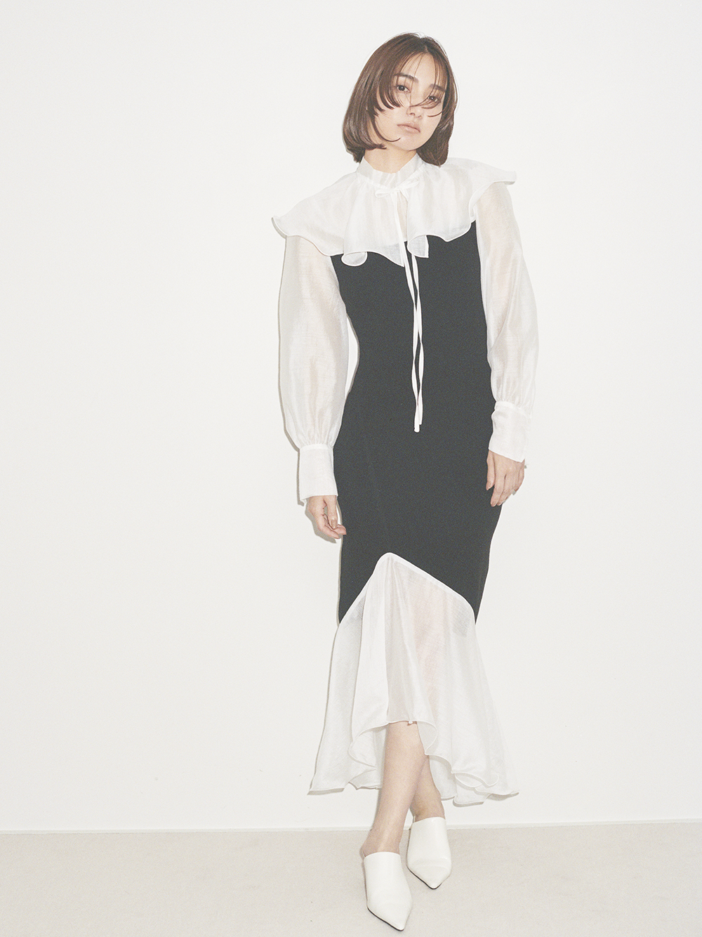 大きなつけ襟とヘムラインのフチはテグスで立体感のあるフォルムを構築させ、華やかさをいっそう引き立たせるアクセントになり、ニット素材の身ごろはアシンメトリーの切り替えを施したタイトラインでシルエットを美しく演出します。
