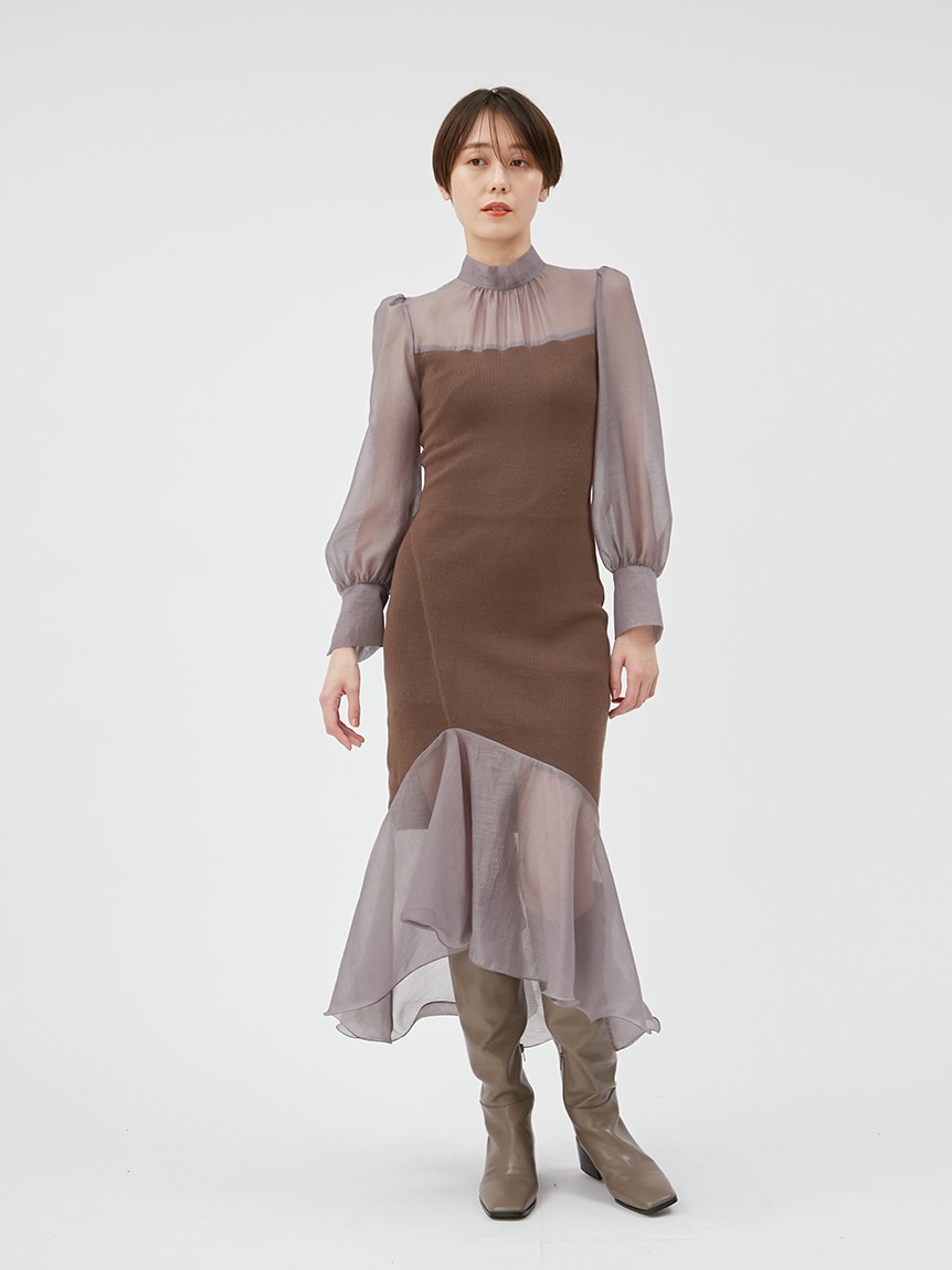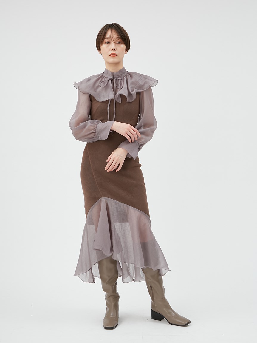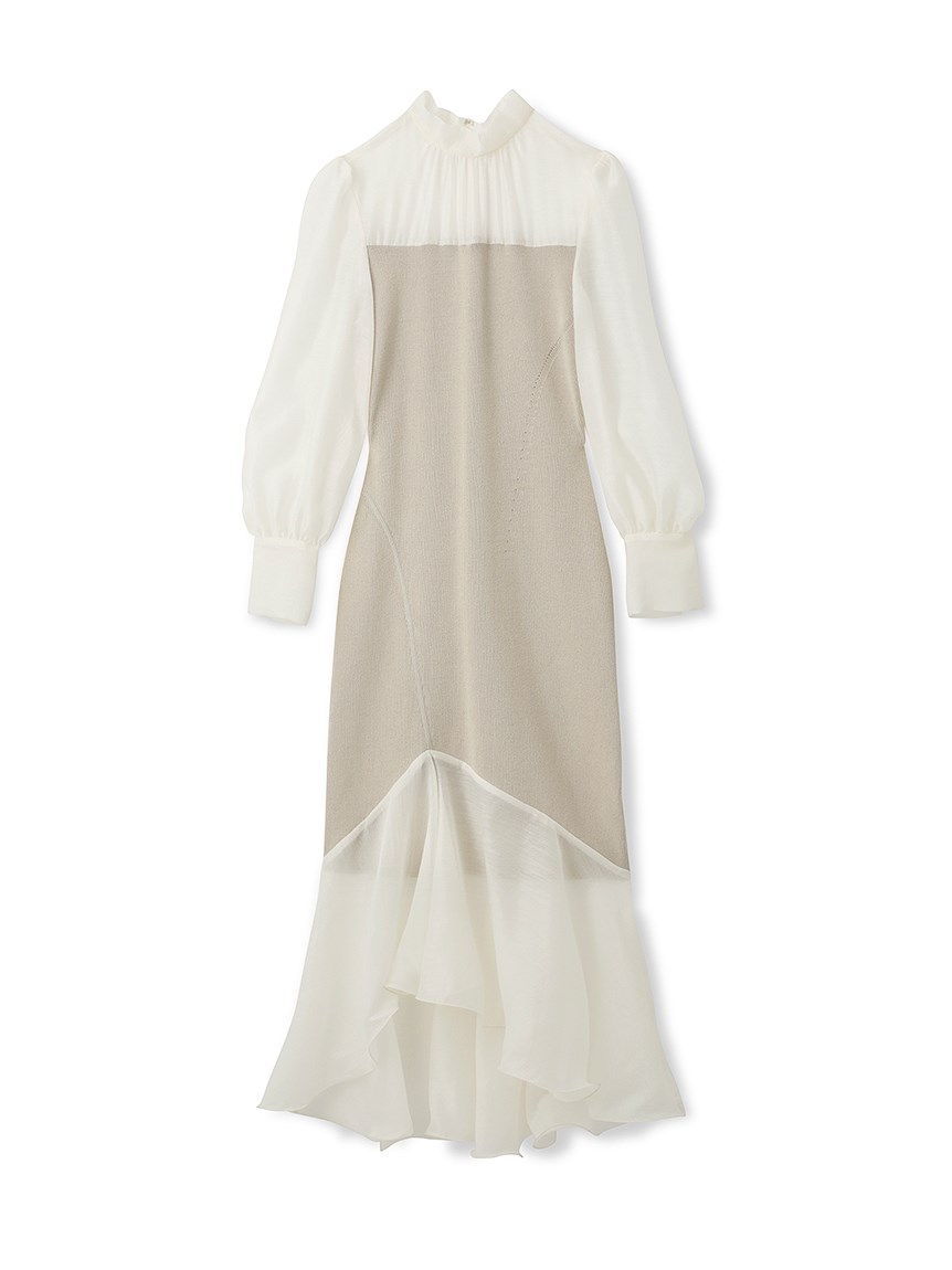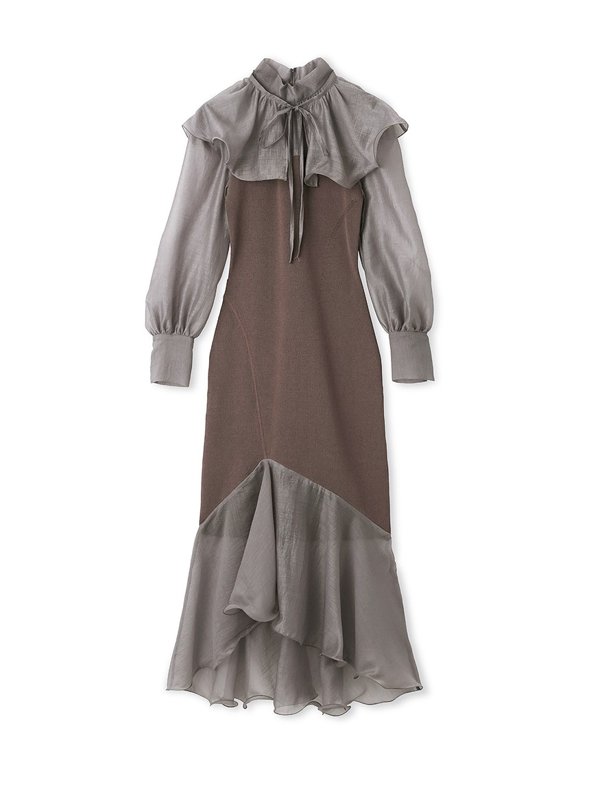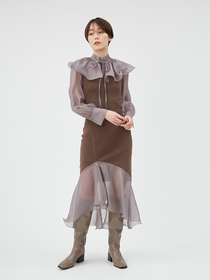 大きなつけ襟とヘムラインのフチはテグスで立体感のあるフォルムを構築させ、華やかさをいっそう引き立たせるアクセントになり、ニット素材の身ごろはアシンメトリーの切り替えを施したタイトラインでシルエットを美しく演出します。