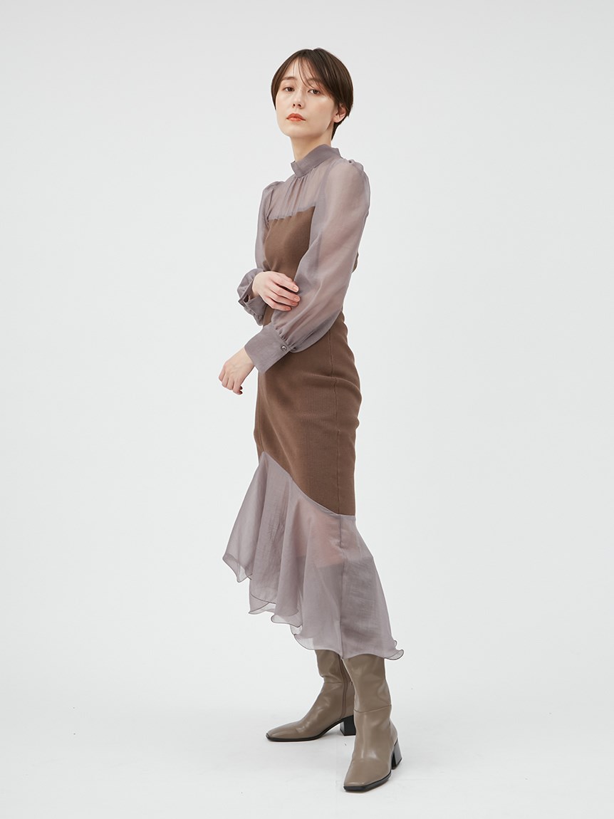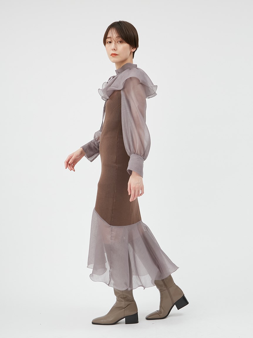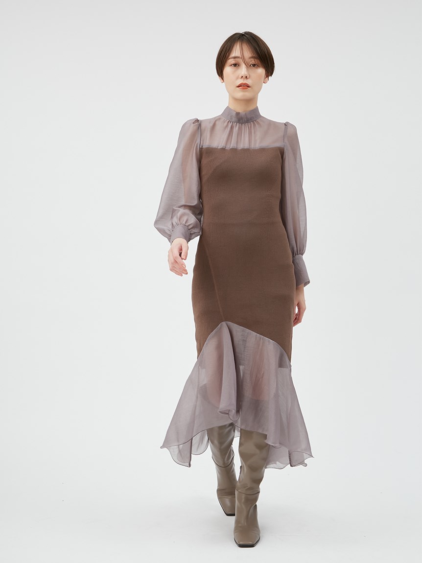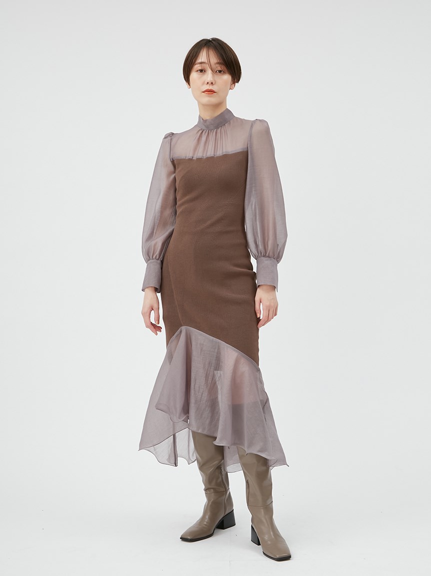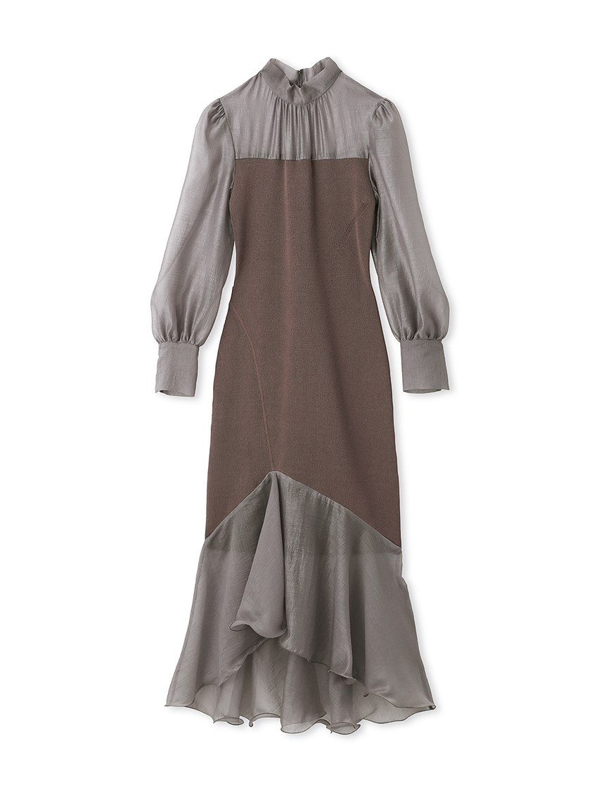 大きなつけ襟とヘムラインのフチはテグスで立体感のあるフォルムを構築させ、華やかさをいっそう引き立たせるアクセントになり、ニット素材の身ごろはアシンメトリーの切り替えを施したタイトラインでシルエットを美しく演出します。