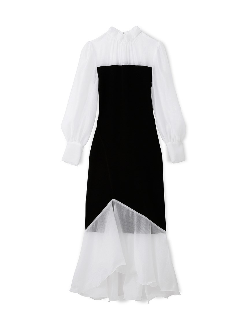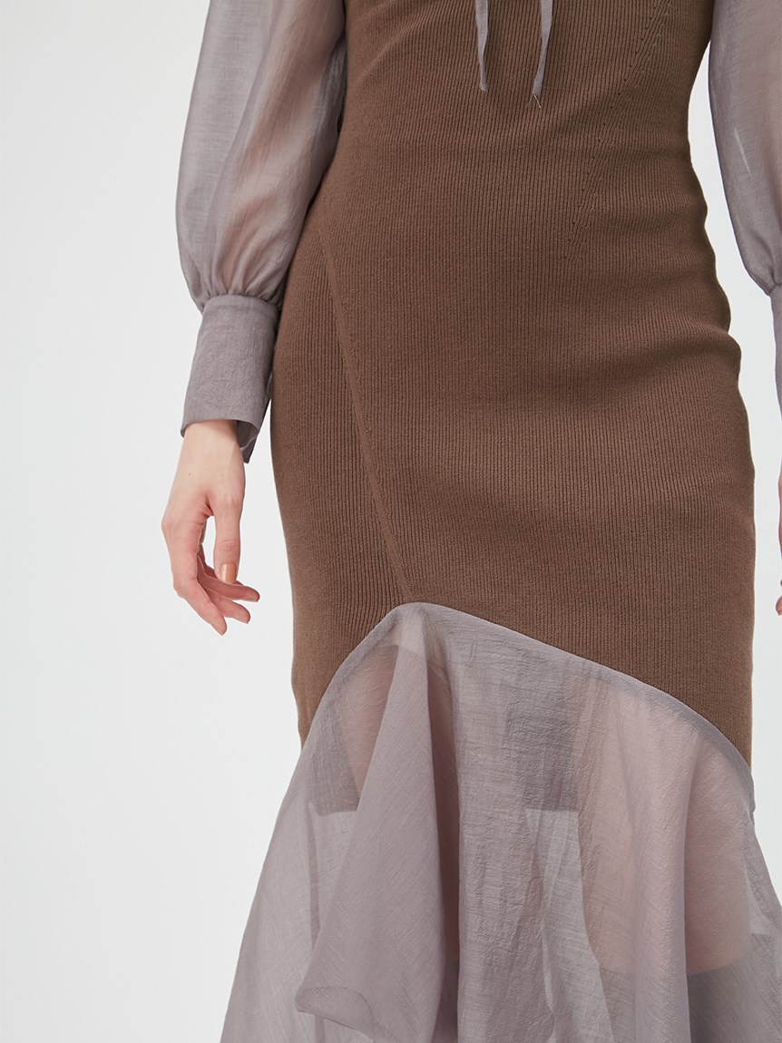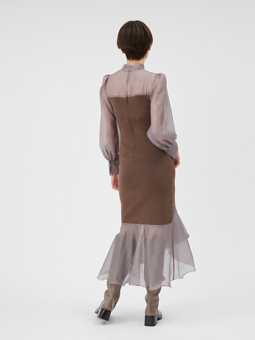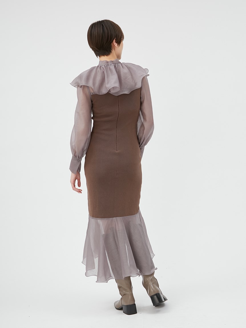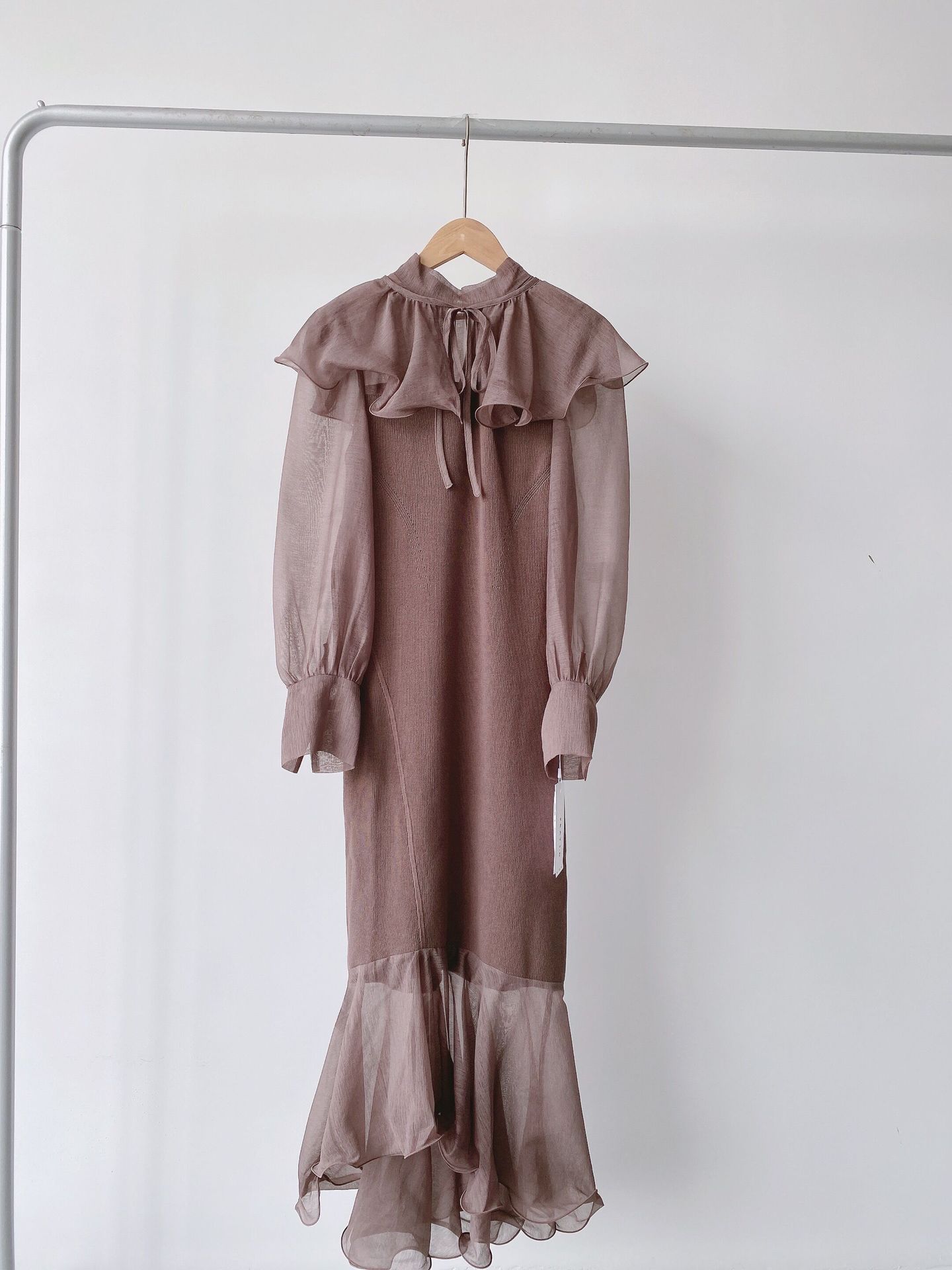 大きなつけ襟とヘムラインのフチはテグスで立体感のあるフォルムを構築させ、華やかさをいっそう引き立たせるアクセントになり、ニット素材の身ごろはアシンメトリーの切り替えを施したタイトラインでシルエットを美しく演出します。