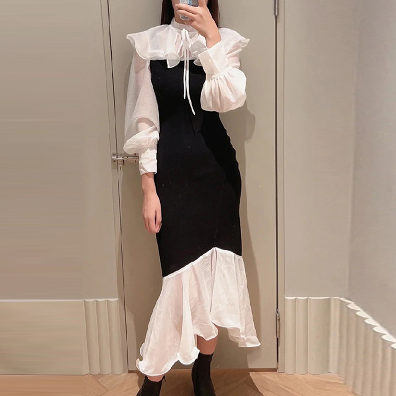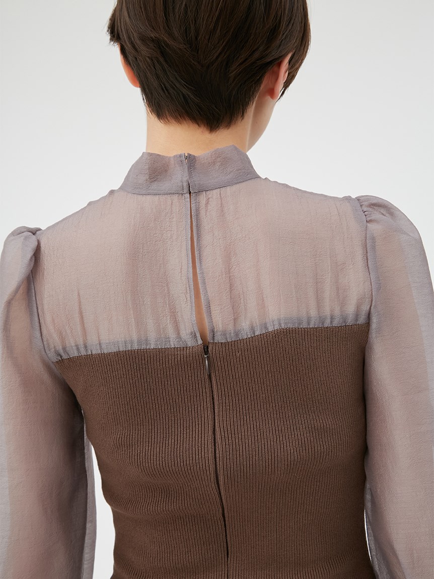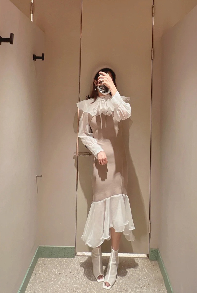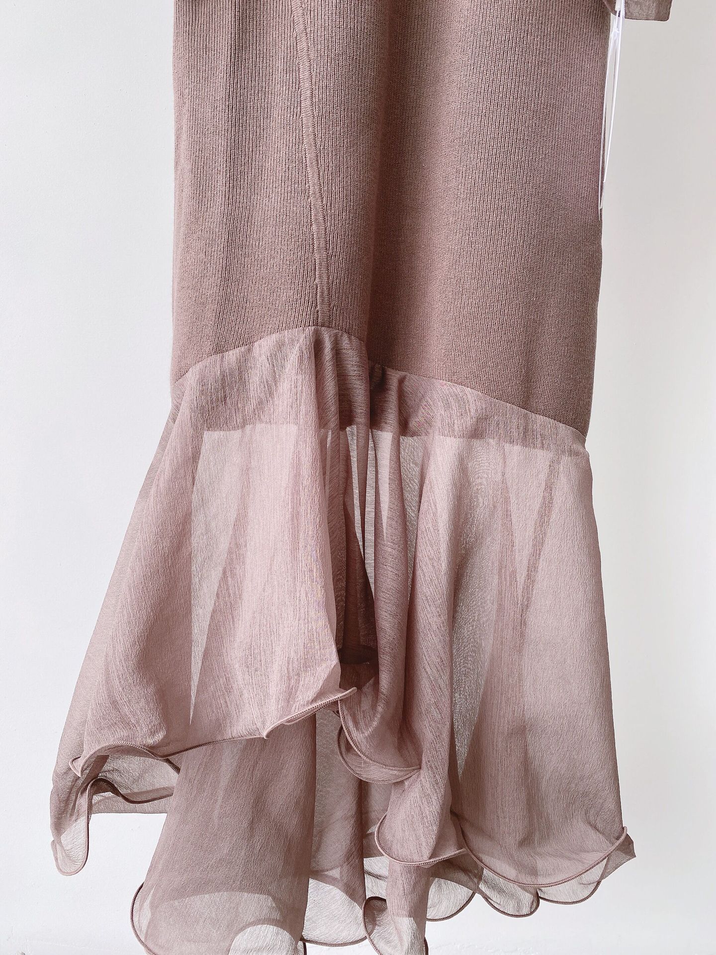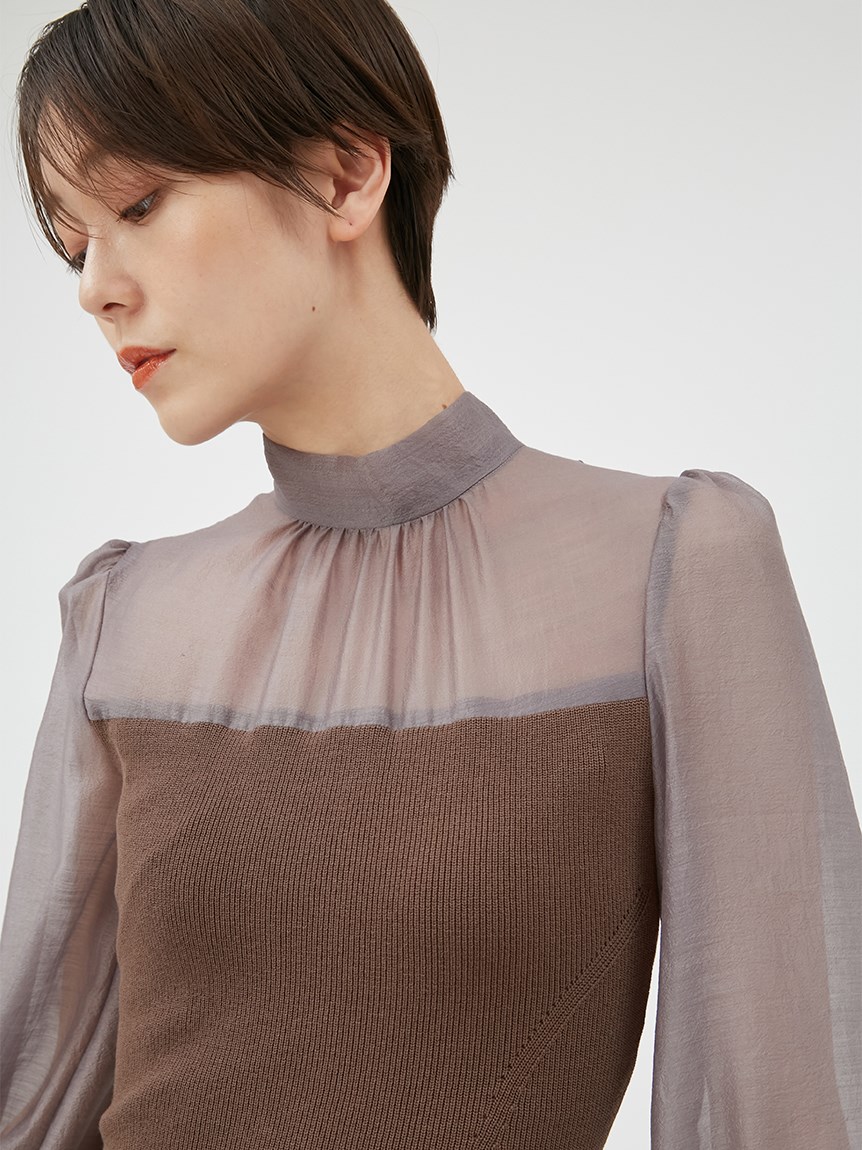 大きなつけ襟とヘムラインのフチはテグスで立体感のあるフォルムを構築させ、華やかさをいっそう引き立たせるアクセントになり、ニット素材の身ごろはアシンメトリーの切り替えを施したタイトラインでシルエットを美しく演出します。