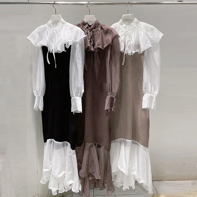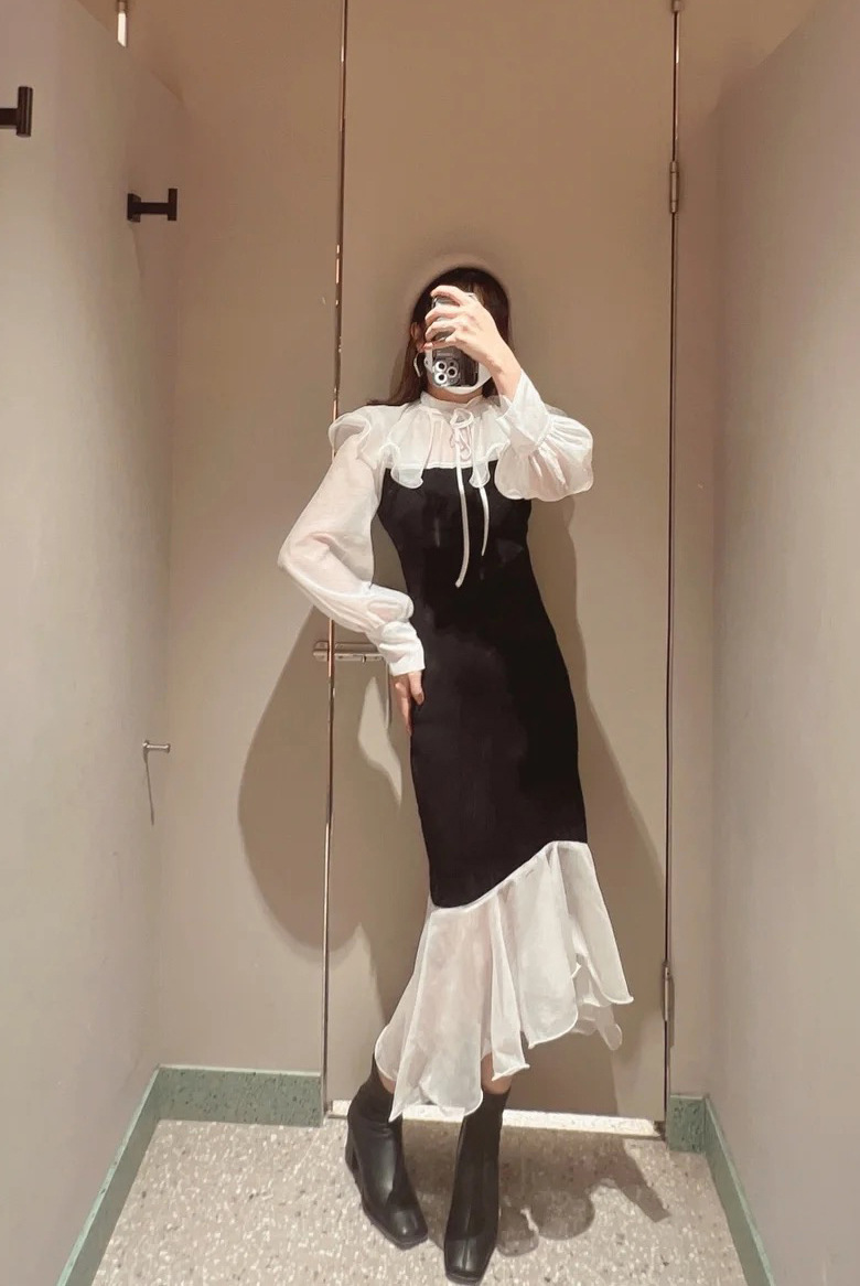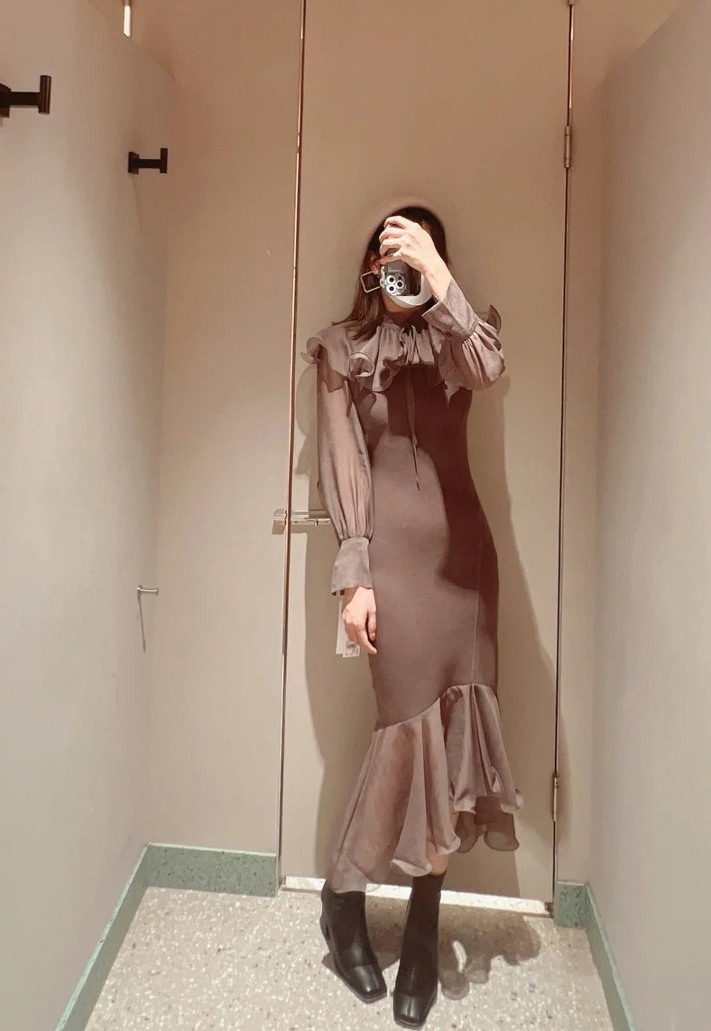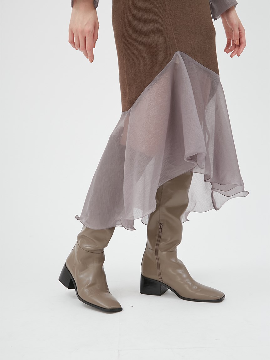 裾まわりはボリュームを作るランダムヘムのマーメイドライン、ひざ上までほんのり透け感があり重厚感のあるロングブーツと好相性です。