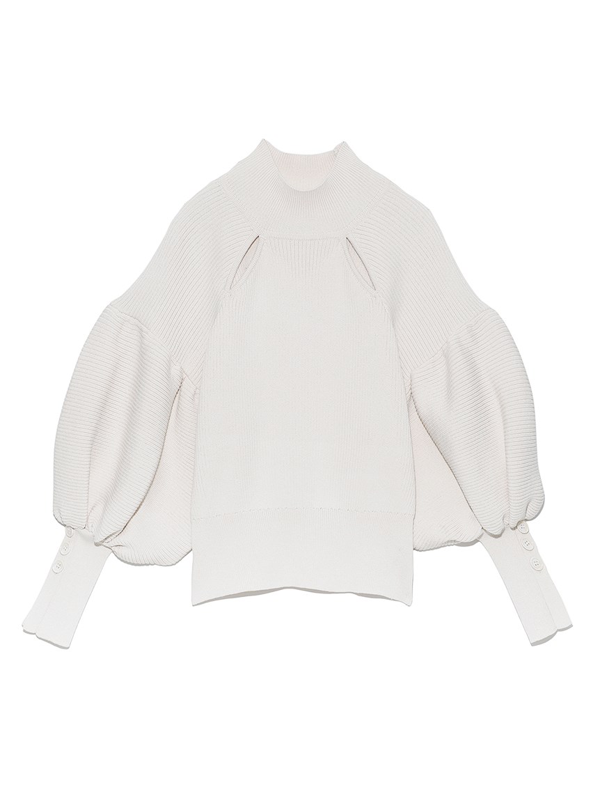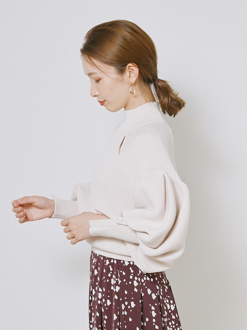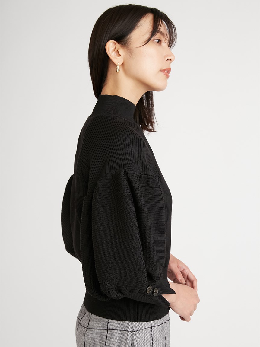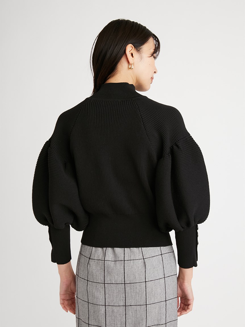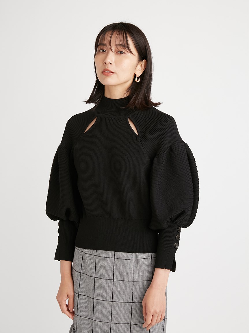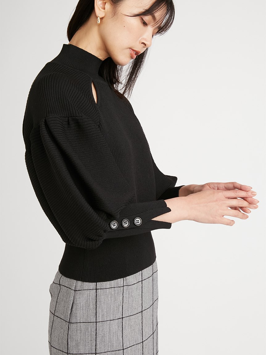 タックを効かせボリュームを持たせた独特なフォルムのパフスリーブが印象的な、女性らしさの中にモードな雰囲気を漂わせるニットプルオーバー。さり気ない肌見せが叶う胸元のスリットやボタンがあしらわれた袖口のディテールなどこだわりが詰まった1着です。幅広のリブで切り替えたショート丈のコンパクトなシルエットがトレンド感を高める秘訣。ボトムスにインしてもアウトでもバランス良く着られ、パンツともスカートとも合わせやすい優秀アイテムです。