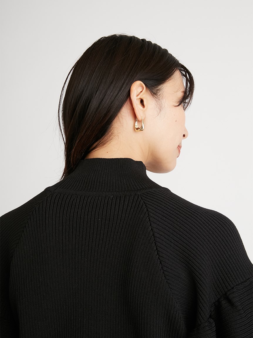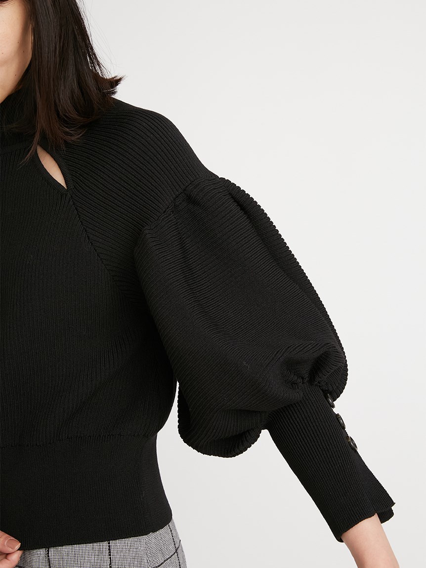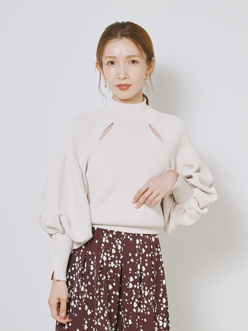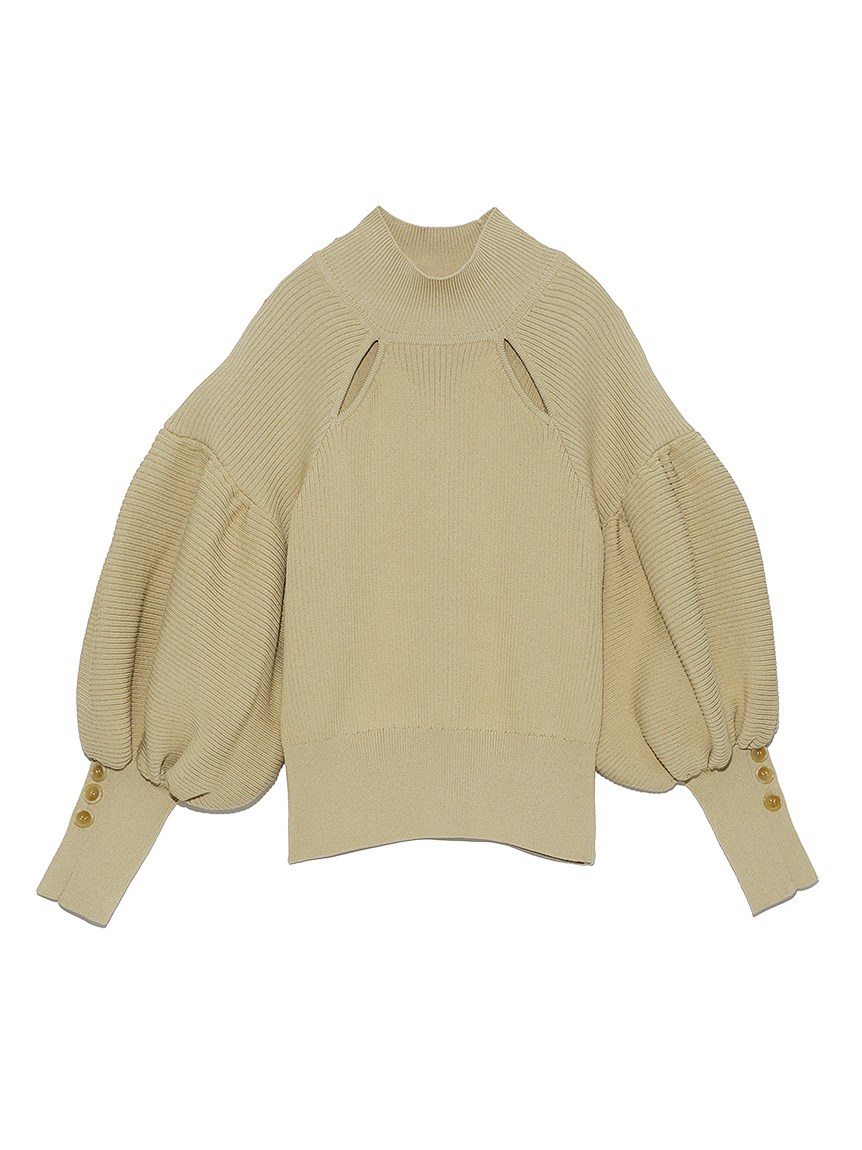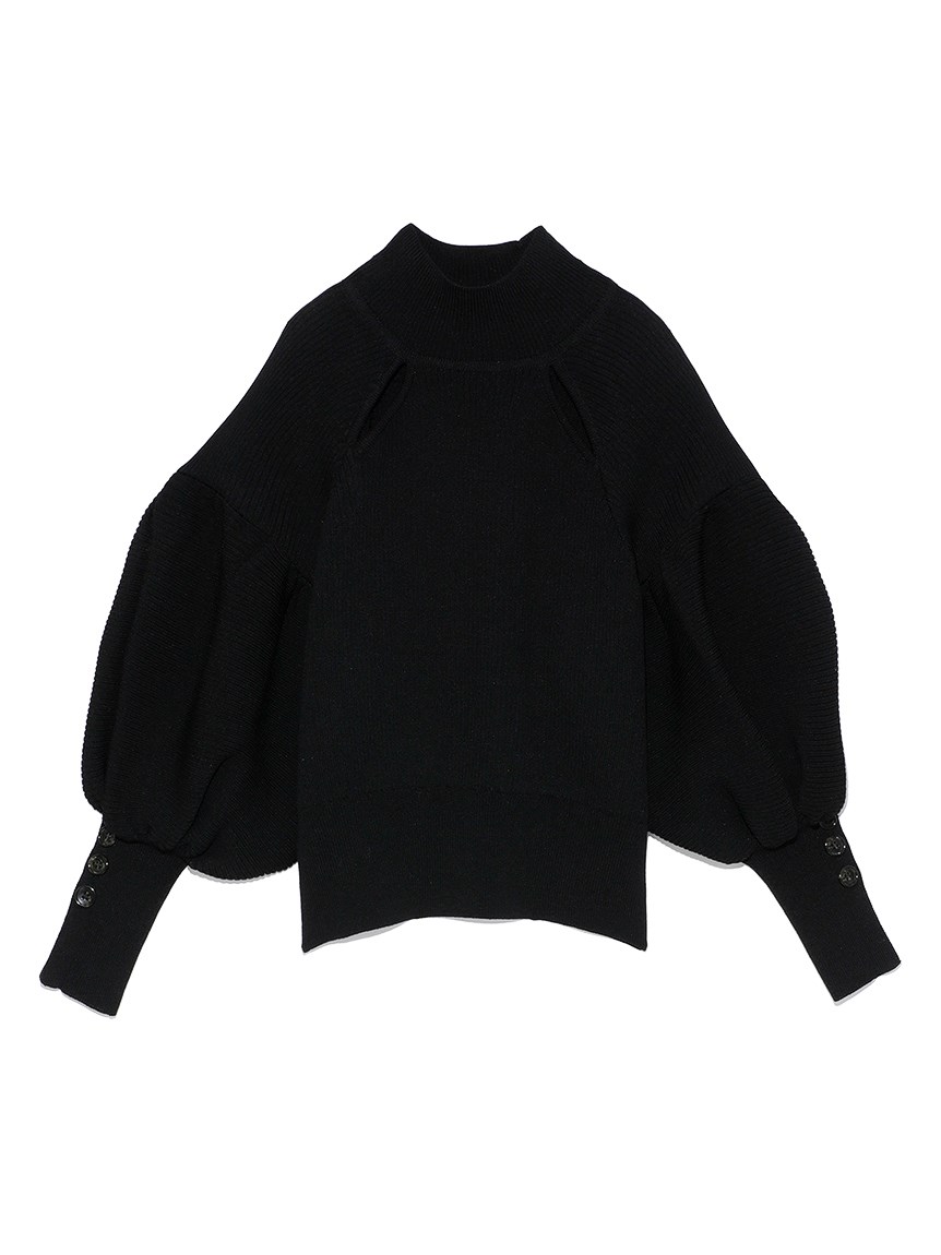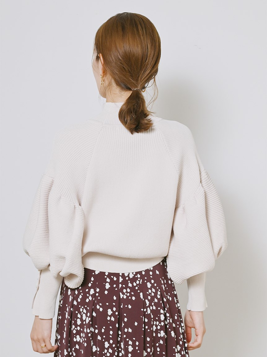 タックを効かせボリュームを持たせた独特なフォルムのパフスリーブが印象的な、女性らしさの中にモードな雰囲気を漂わせるニットプルオーバー。さり気ない肌見せが叶う胸元のスリットやボタンがあしらわれた袖口のディテールなどこだわりが詰まった1着です。幅広のリブで切り替えたショート丈のコンパクトなシルエットがトレンド感を高める秘訣。ボトムスにインしてもアウトでもバランス良く着られ、パンツともスカートとも合わせやすい優秀アイテムです。