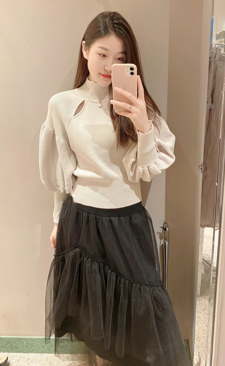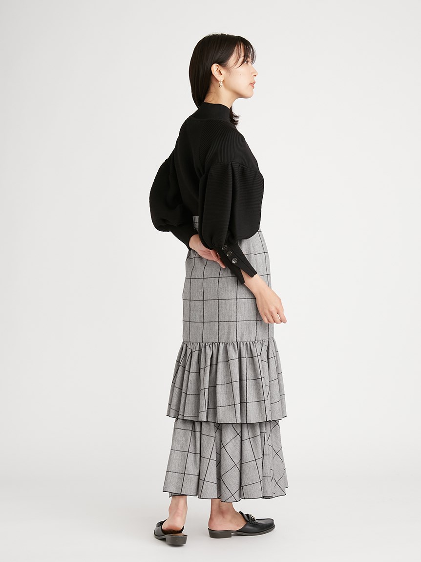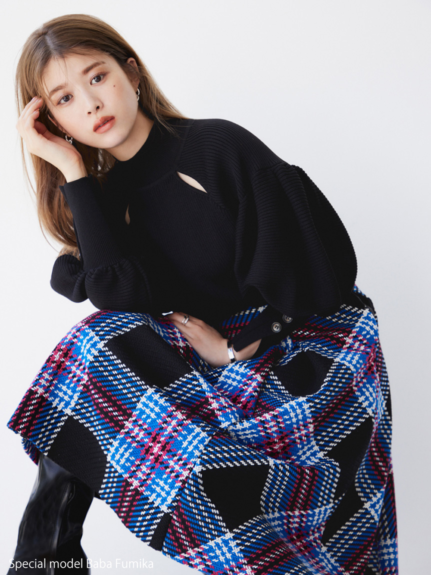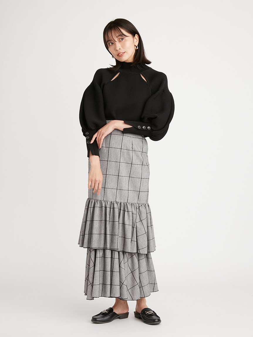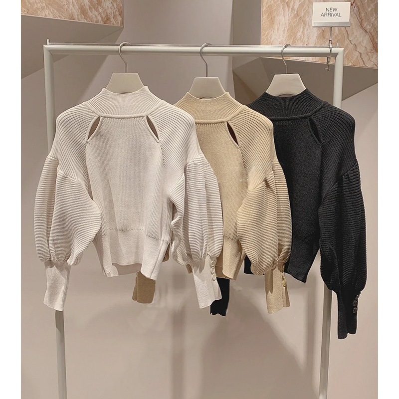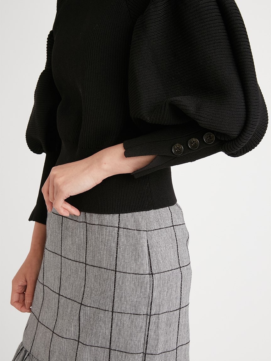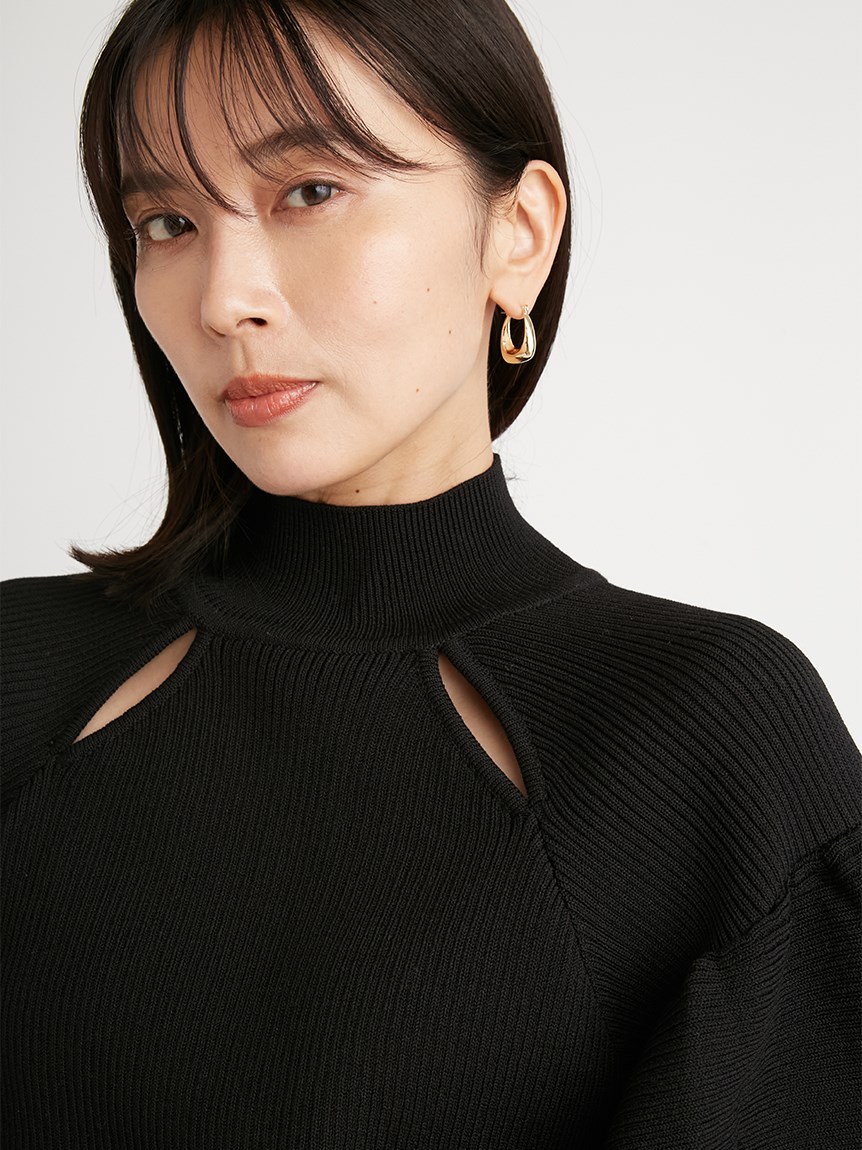 タックを効かせボリュームを持たせた独特なフォルムのパフスリーブが印象的な、女性らしさの中にモードな雰囲気を漂わせるニットプルオーバー。さり気ない肌見せが叶う胸元のスリットやボタンがあしらわれた袖口のディテールなどこだわりが詰まった1着です。幅広のリブで切り替えたショート丈のコンパクトなシルエットがトレンド感を高める秘訣。ボトムスにインしてもアウトでもバランス良く着られ、パンツともスカートとも合わせやすい優秀アイテムです。