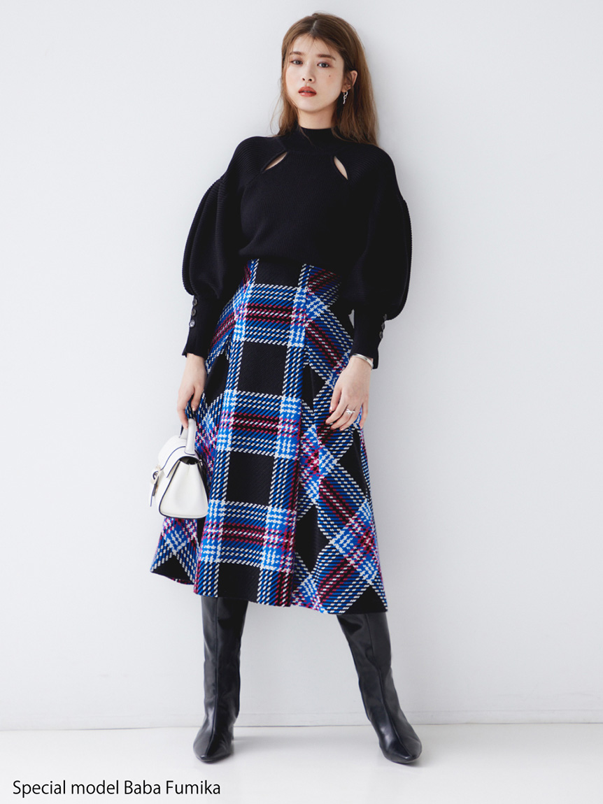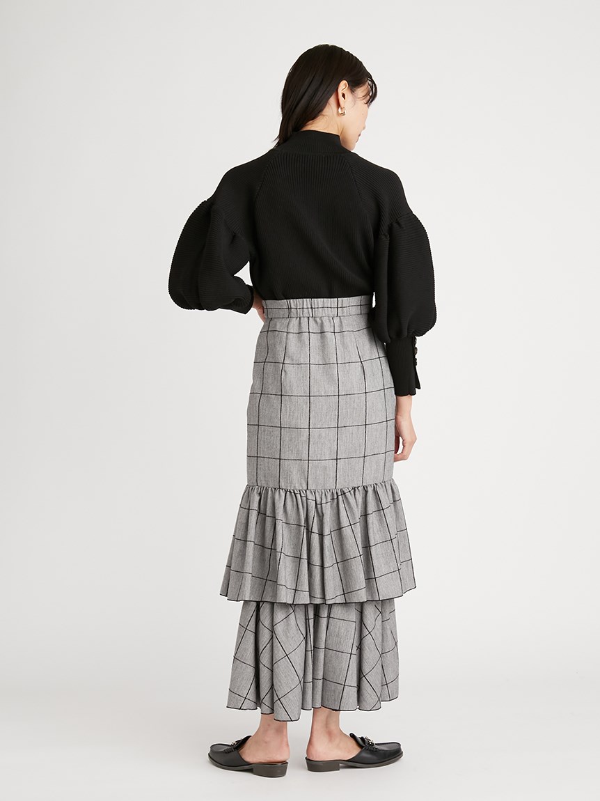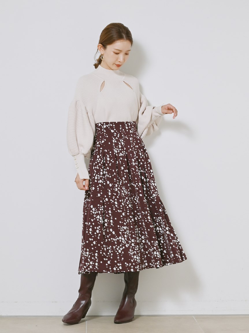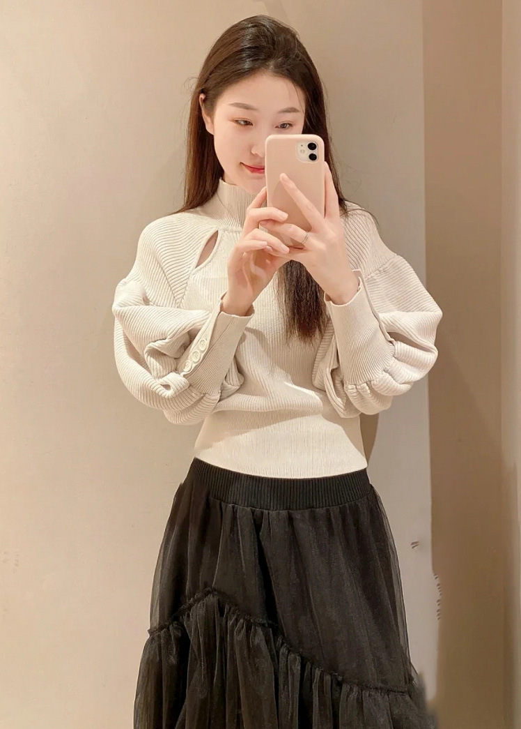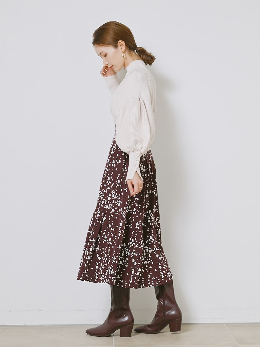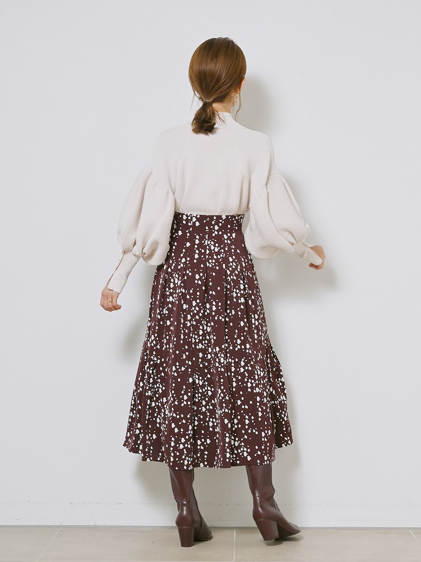 タックを効かせボリュームを持たせた独特なフォルムのパフスリーブが印象的な、女性らしさの中にモードな雰囲気を漂わせるニットプルオーバー。さり気ない肌見せが叶う胸元のスリットやボタンがあしらわれた袖口のディテールなどこだわりが詰まった1着です。幅広のリブで切り替えたショート丈のコンパクトなシルエットがトレンド感を高める秘訣。ボトムスにインしてもアウトでもバランス良く着られ、パンツともスカートとも合わせやすい優秀アイテムです。