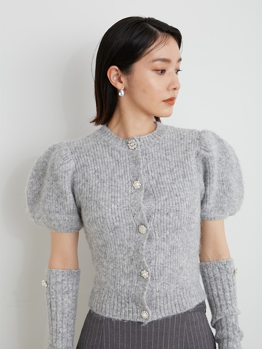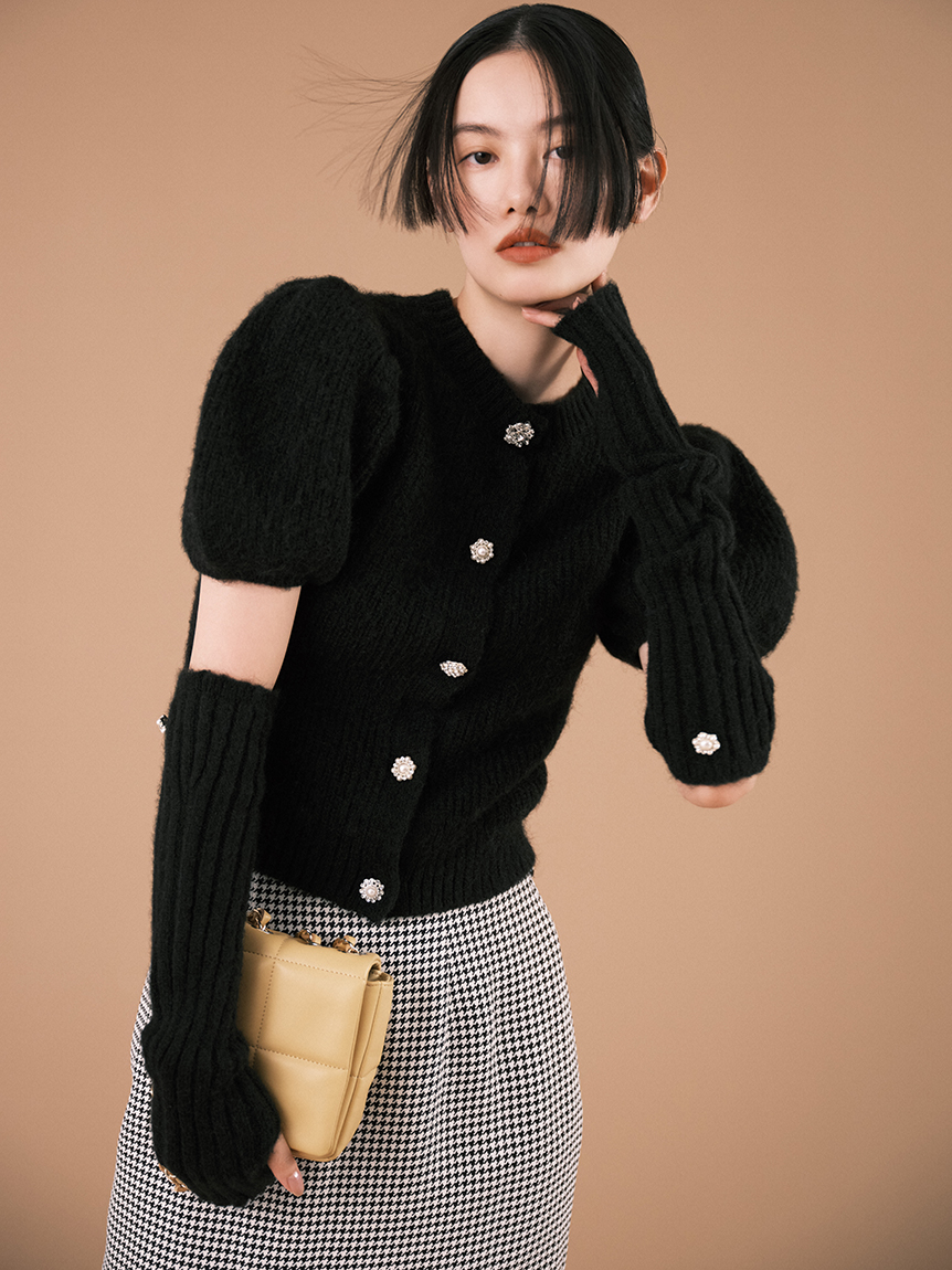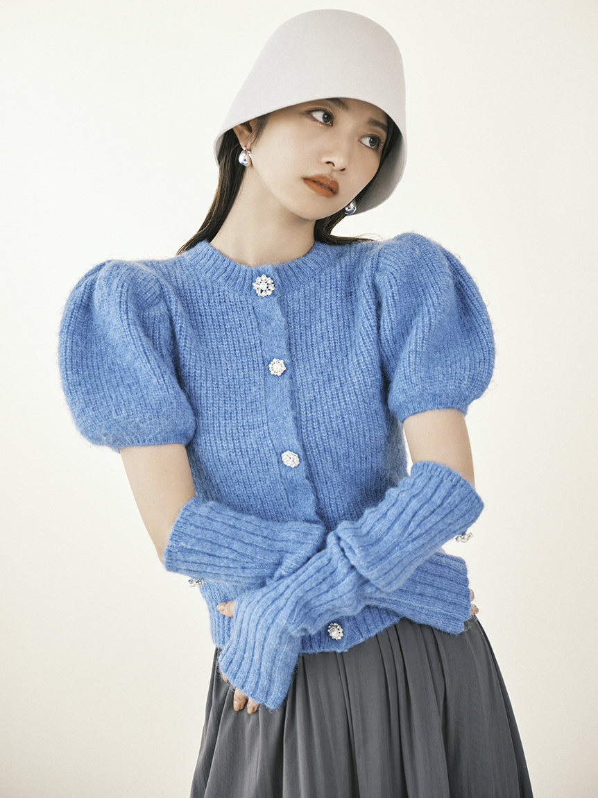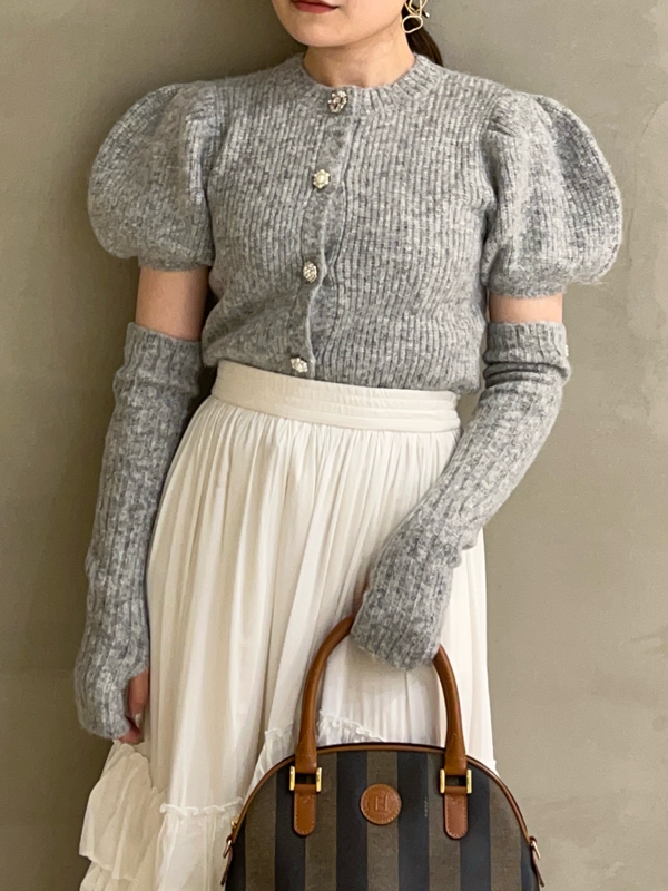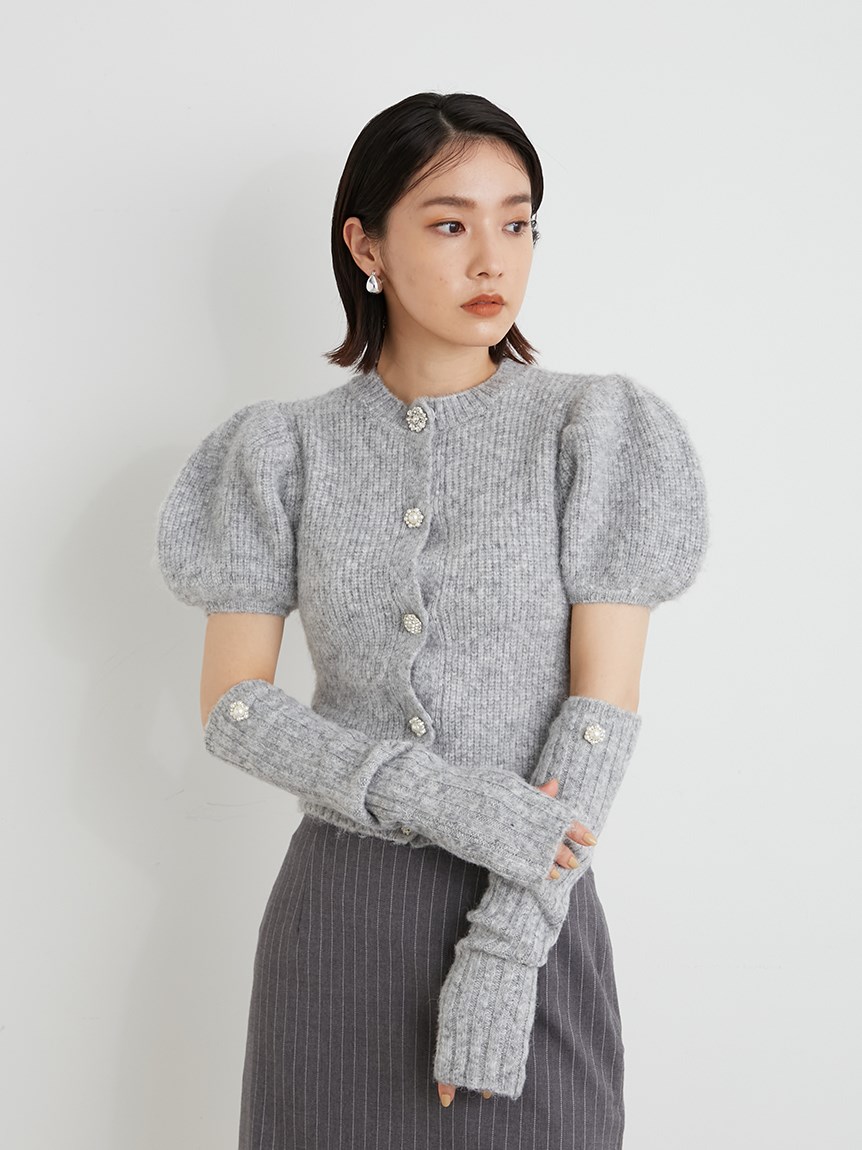 ボリュームのあるパフスリーブがポイントになったニットカーディガンとアームウォーマーのセット。どちらのアイテムにもリュクスなビジューボタンをあしらうことで、上品フェミニンに仕上げました。カーディガンは半袖なので初秋から着られ、アームウォーマーをプラスすれば寒い季節もカバーできる優秀な1着。アームウォーマーは長めに仕立てているので少しクシュっとさせてニュアンスたっぷりに。フィンガーレスで携帯の操作などもしやすく、実用性もしっかりと押さえています。