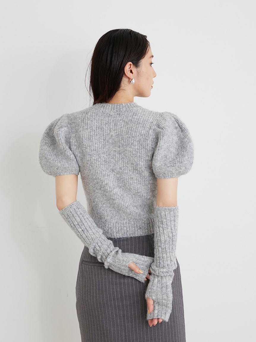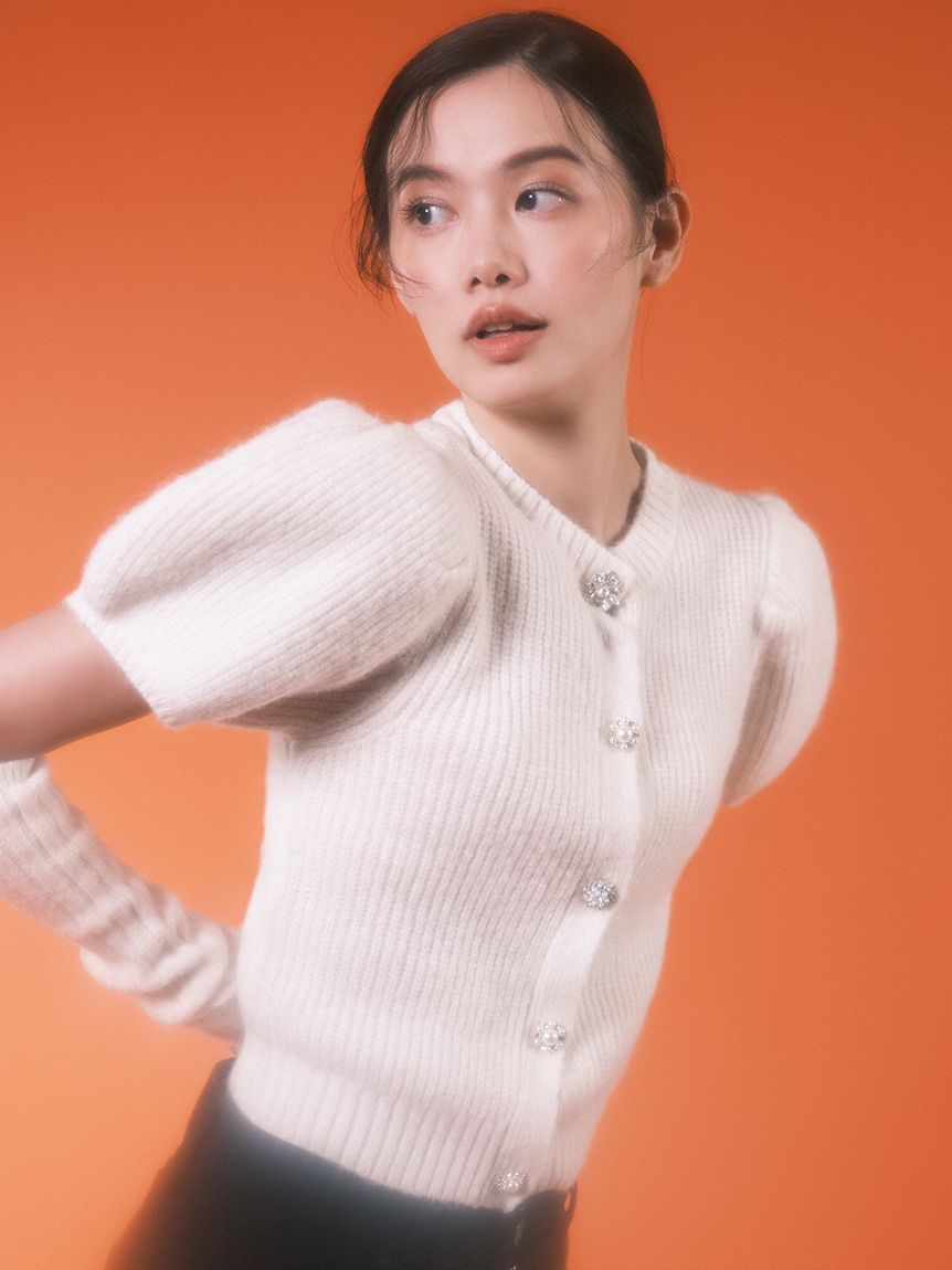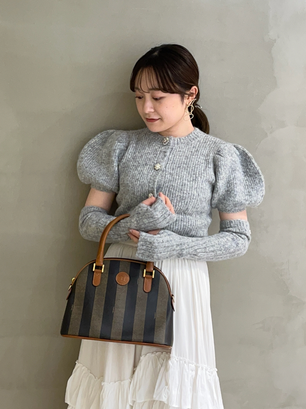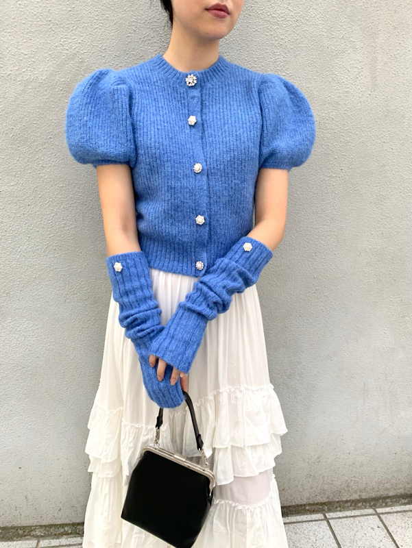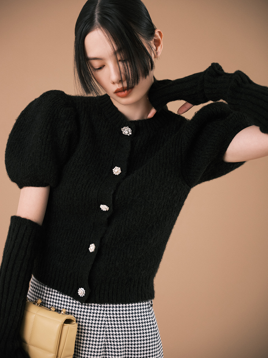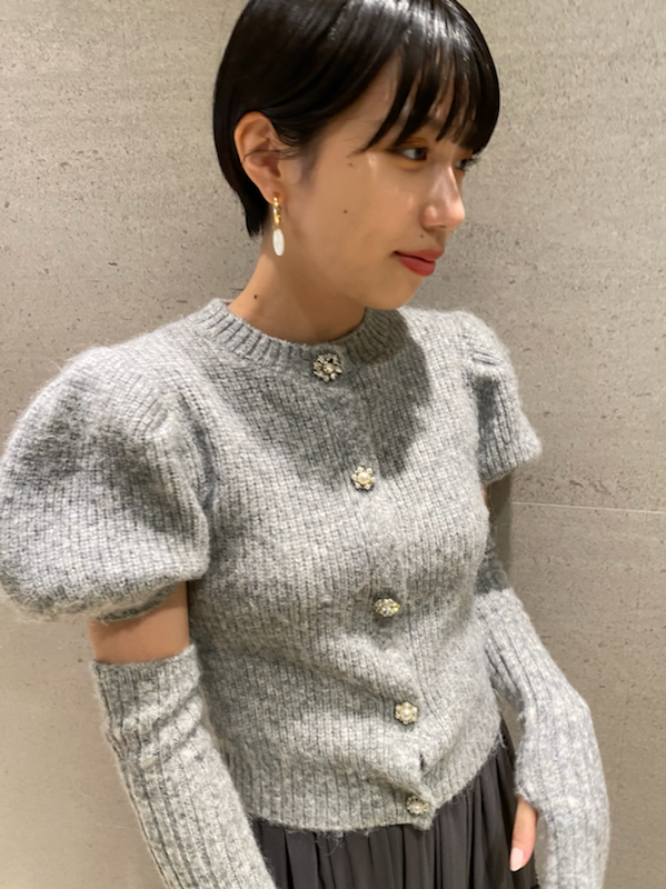 ボリュームのあるパフスリーブがポイントになったニットカーディガンとアームウォーマーのセット。どちらのアイテムにもリュクスなビジューボタンをあしらうことで、上品フェミニンに仕上げました。カーディガンは半袖なので初秋から着られ、アームウォーマーをプラスすれば寒い季節もカバーできる優秀な1着。アームウォーマーは長めに仕立てているので少しクシュっとさせてニュアンスたっぷりに。フィンガーレスで携帯の操作などもしやすく、実用性もしっかりと押さえています。