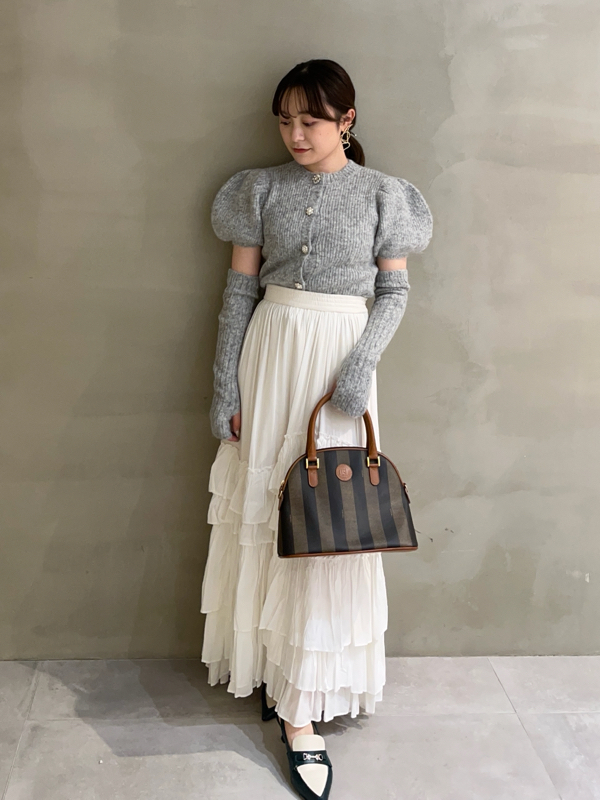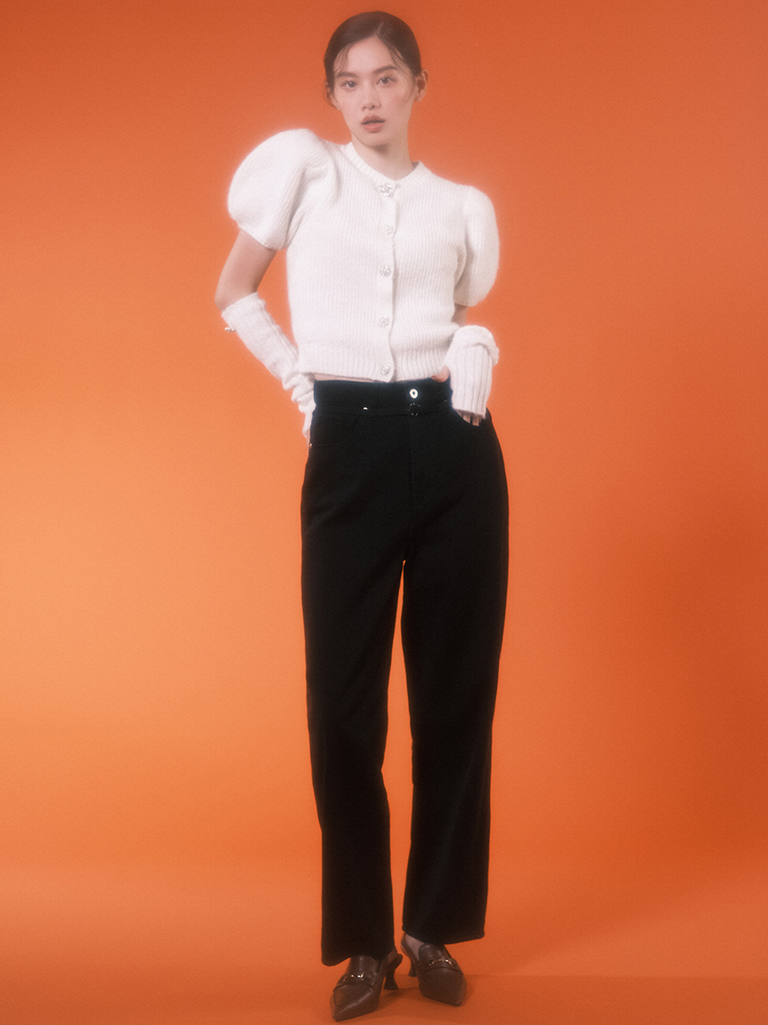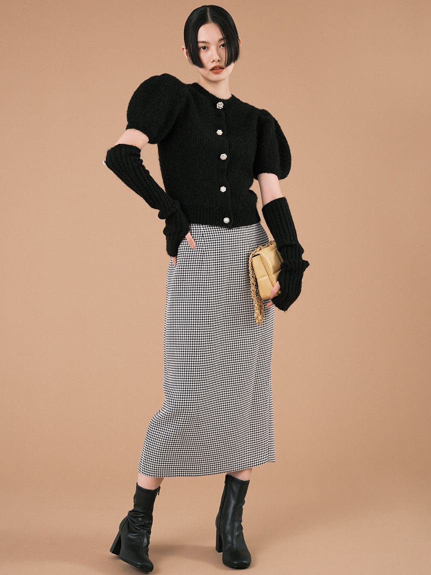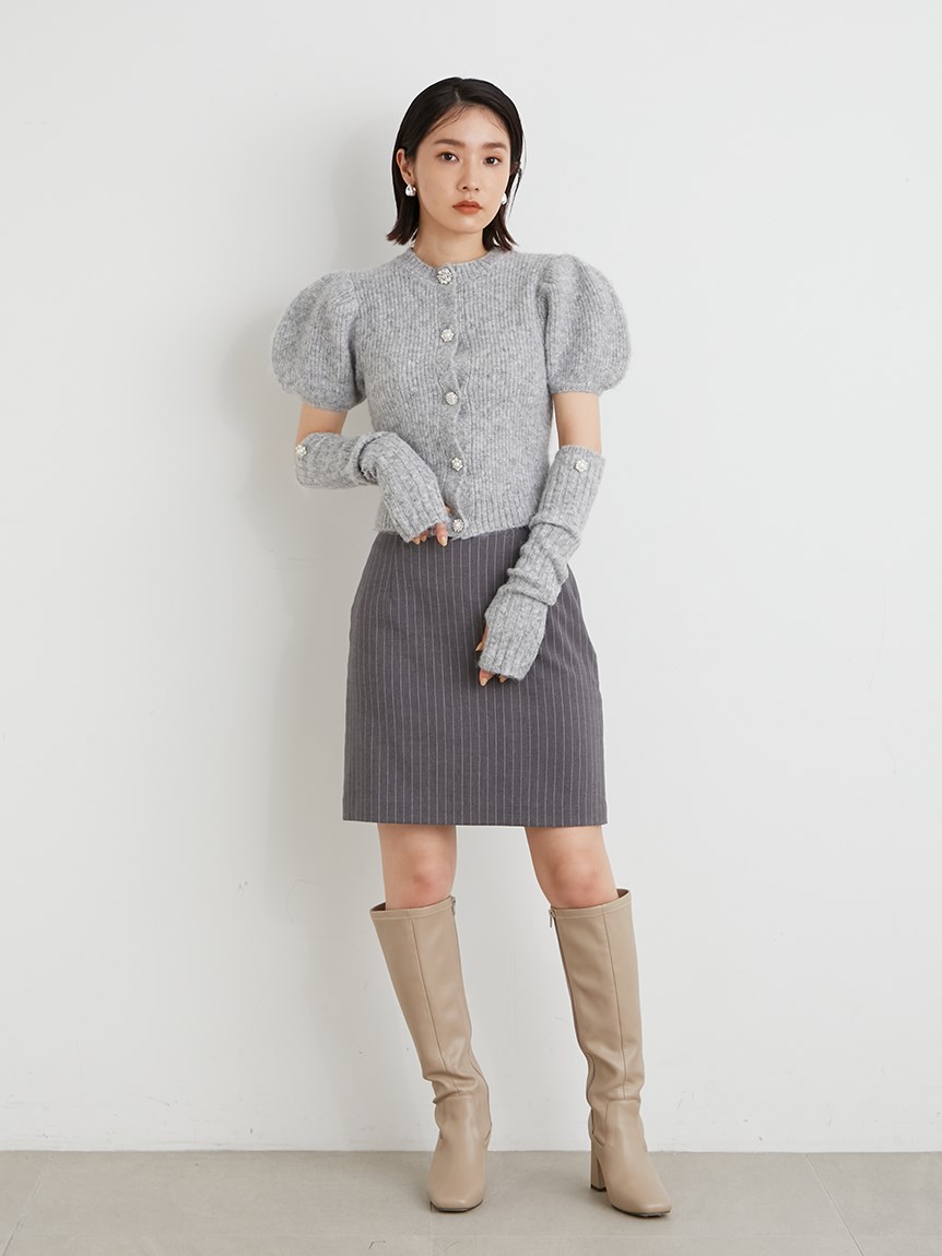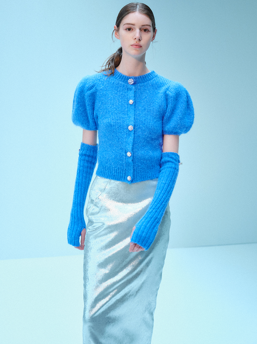 ボリュームのあるパフスリーブがポイントになったニットカーディガンとアームウォーマーのセット。どちらのアイテムにもリュクスなビジューボタンをあしらうことで、上品フェミニンに仕上げました。カーディガンは半袖なので初秋から着られ、アームウォーマーをプラスすれば寒い季節もカバーできる優秀な1着。アームウォーマーは長めに仕立てているので少しクシュっとさせてニュアンスたっぷりに。フィンガーレスで携帯の操作などもしやすく、実用性もしっかりと押さえています。