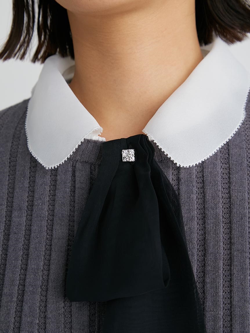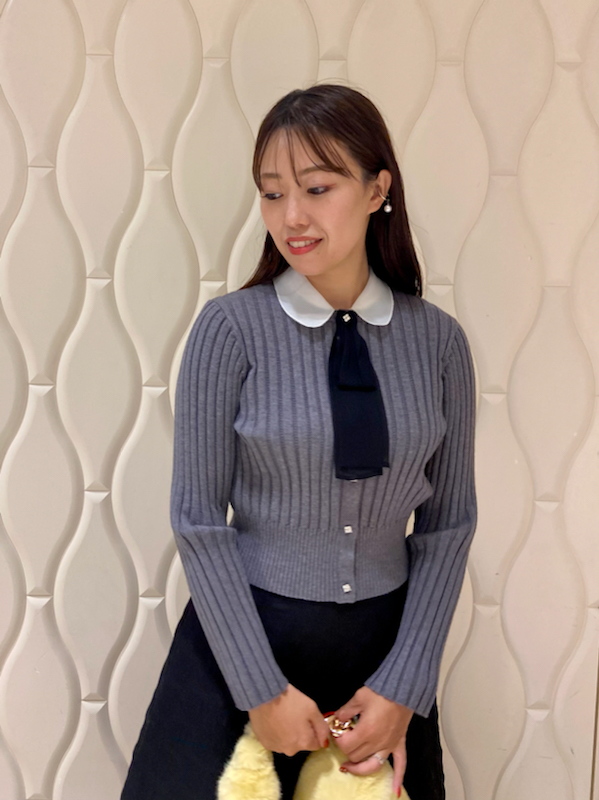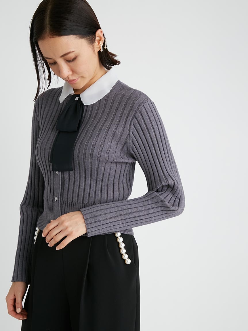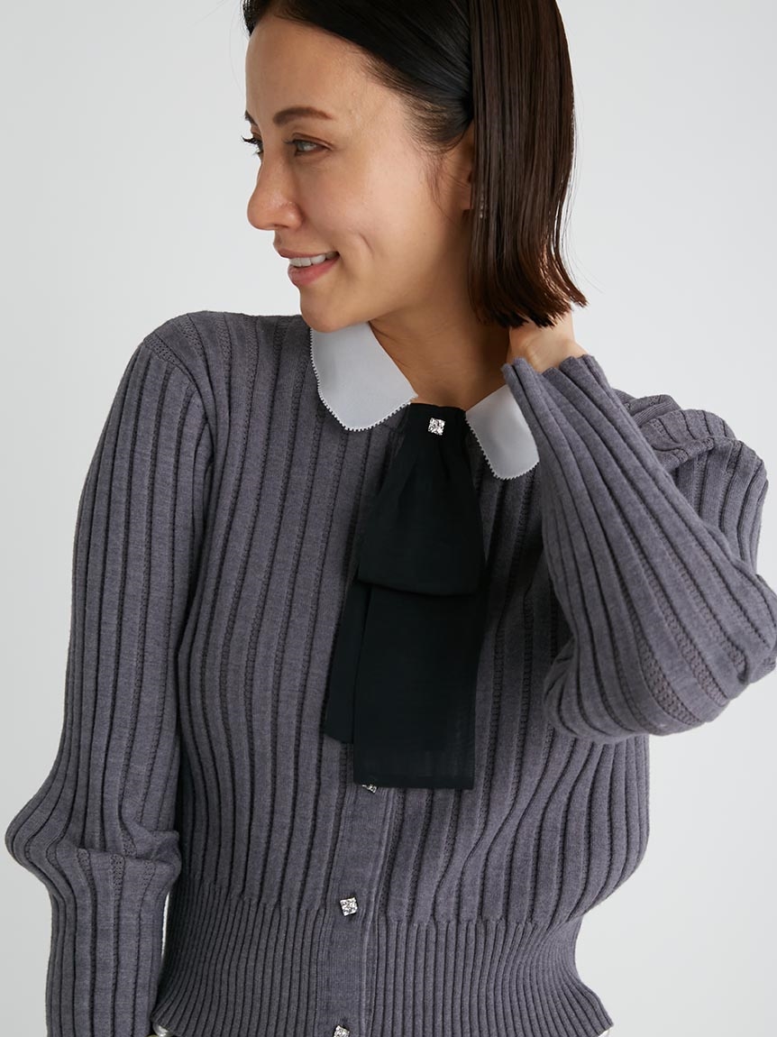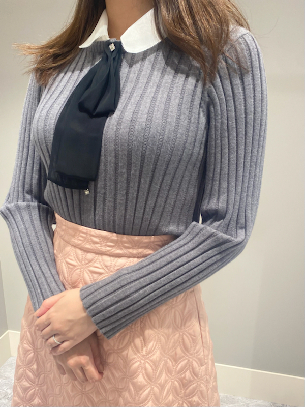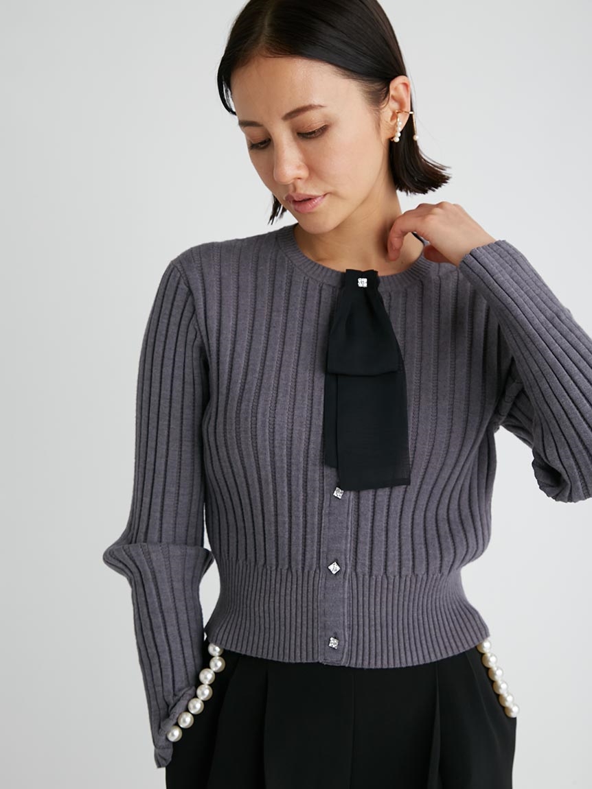 4つ石の入ったビジューボタンを使用していて取り外し可能のシフォンリボンを一番上のボタンに通していただくとリボン付きのブラウスと重ね着している様なデザインになります。