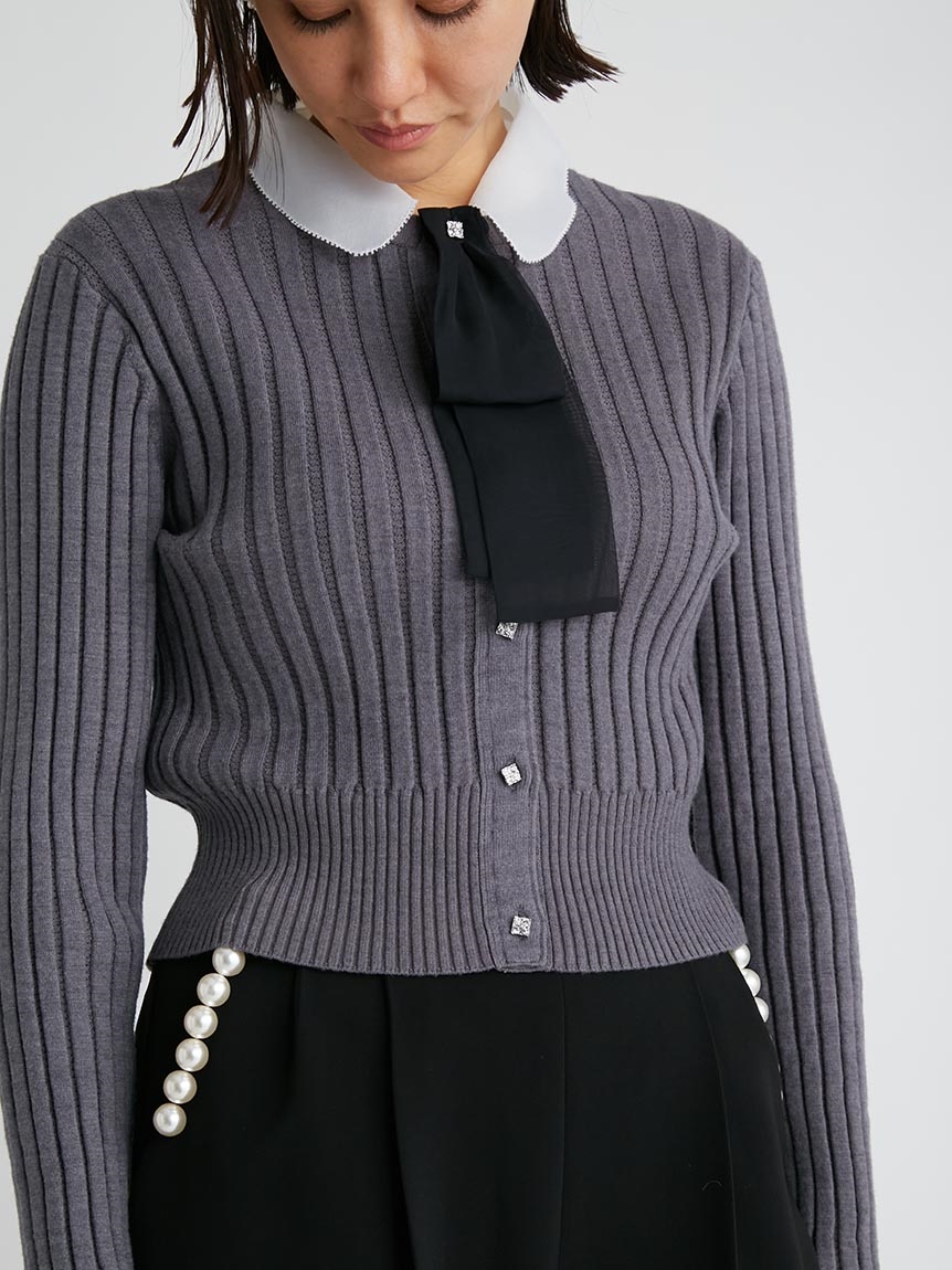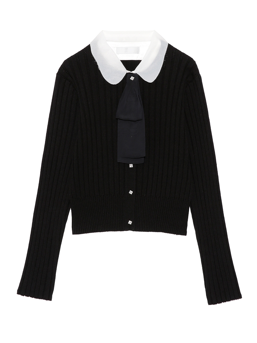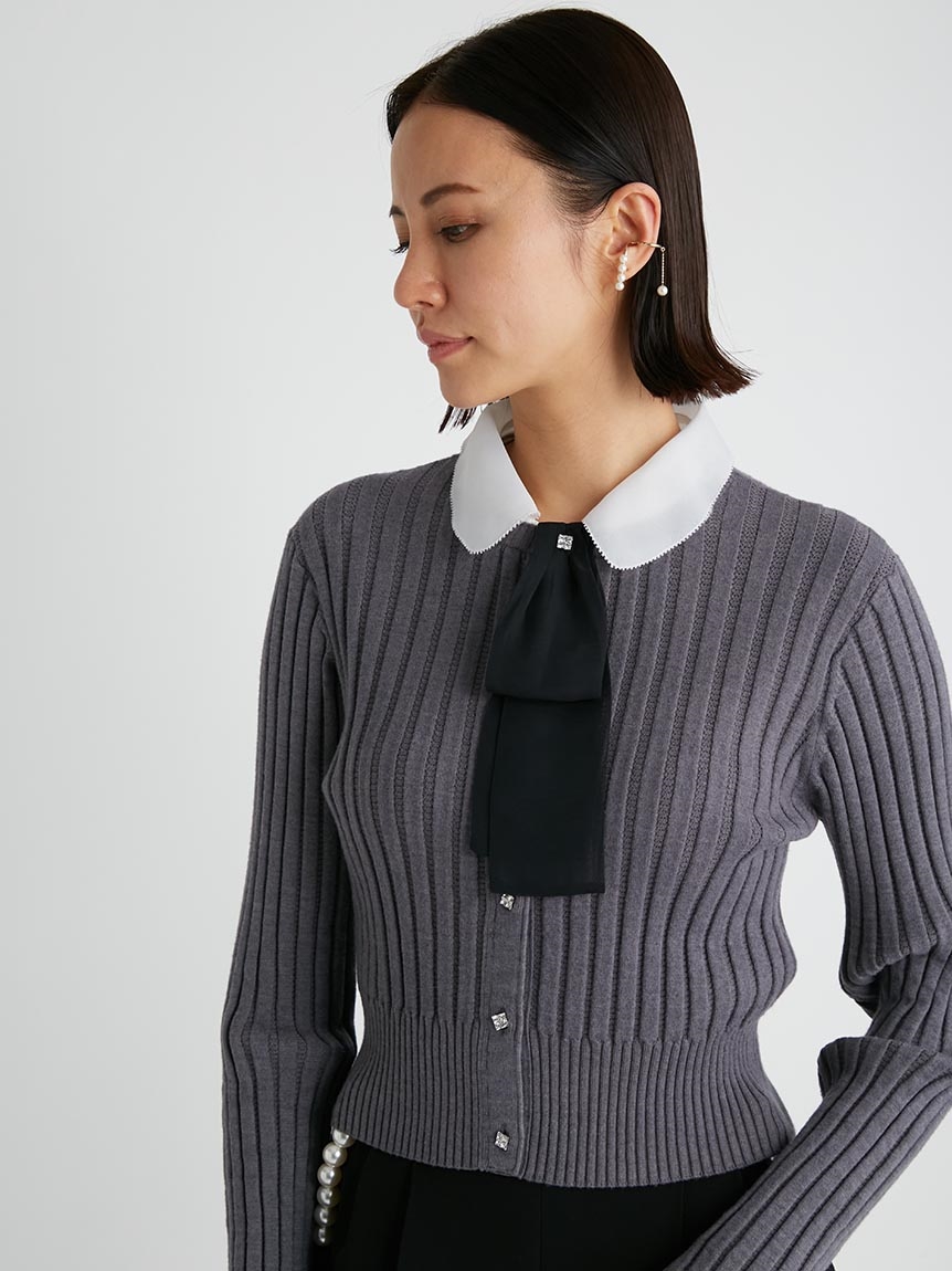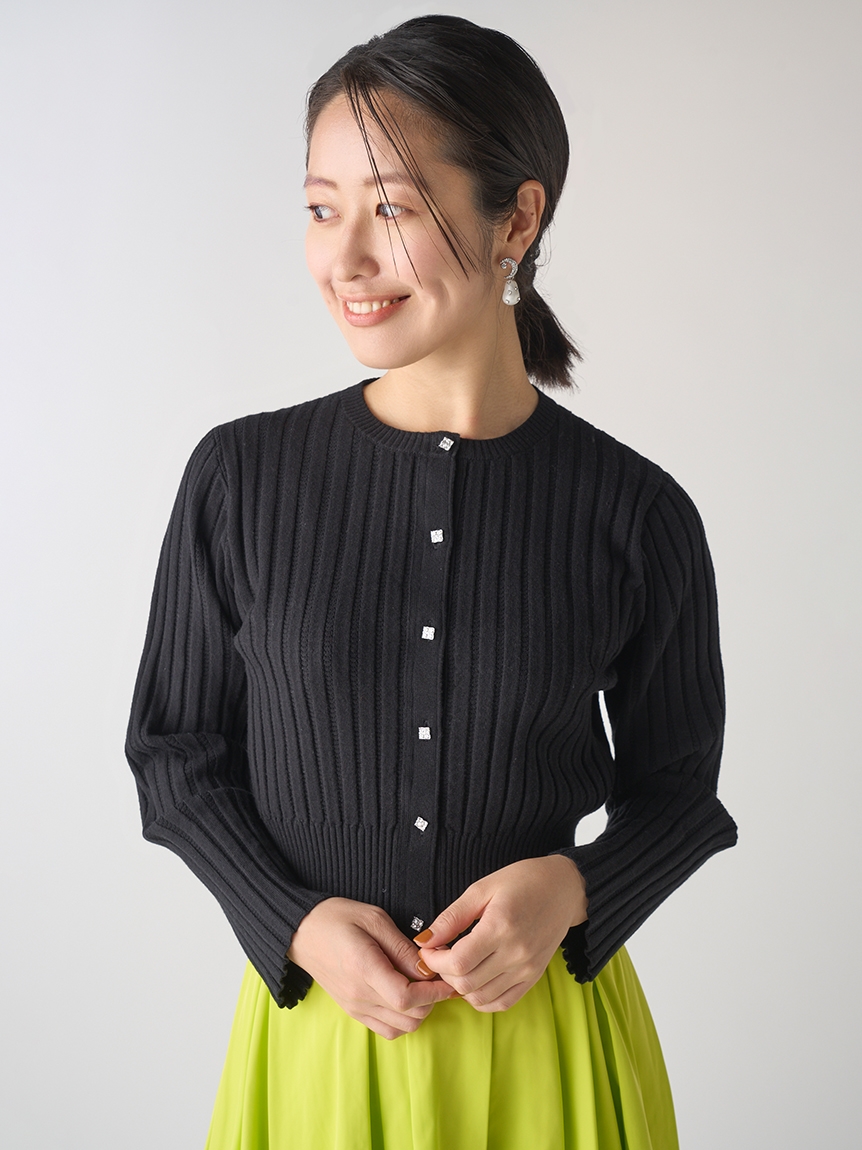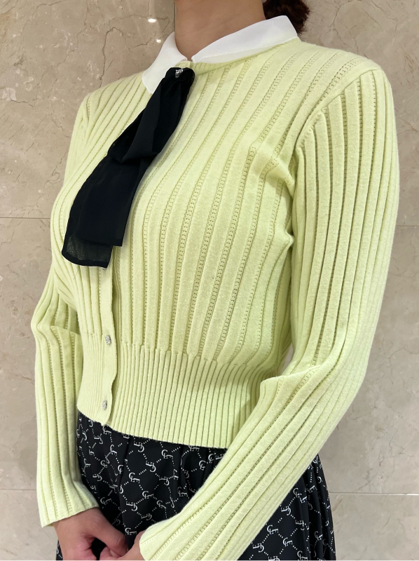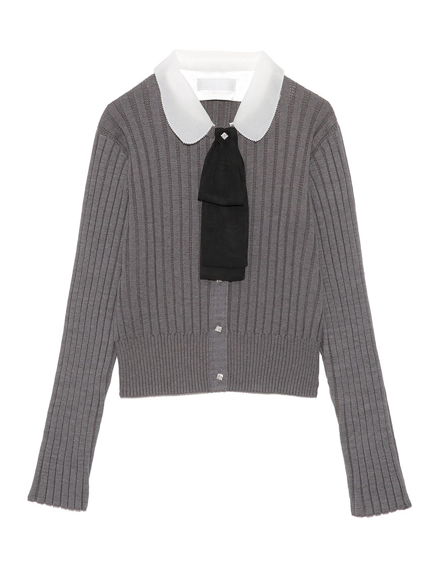 4つ石の入ったビジューボタンを使用していて取り外し可能のシフォンリボンを一番上のボタンに通していただくとリボン付きのブラウスと重ね着している様なデザインになります。