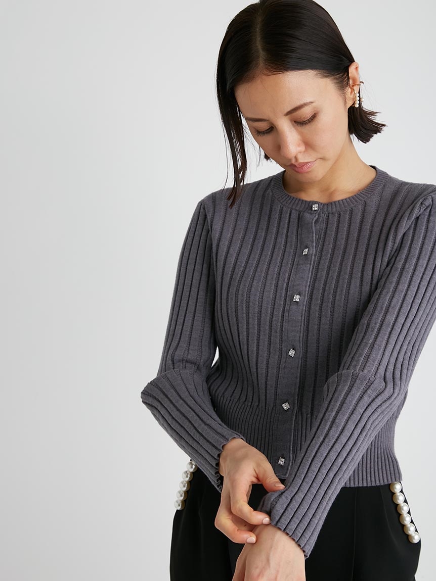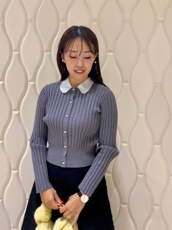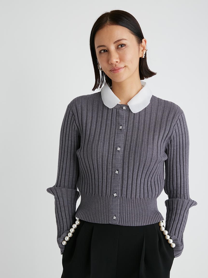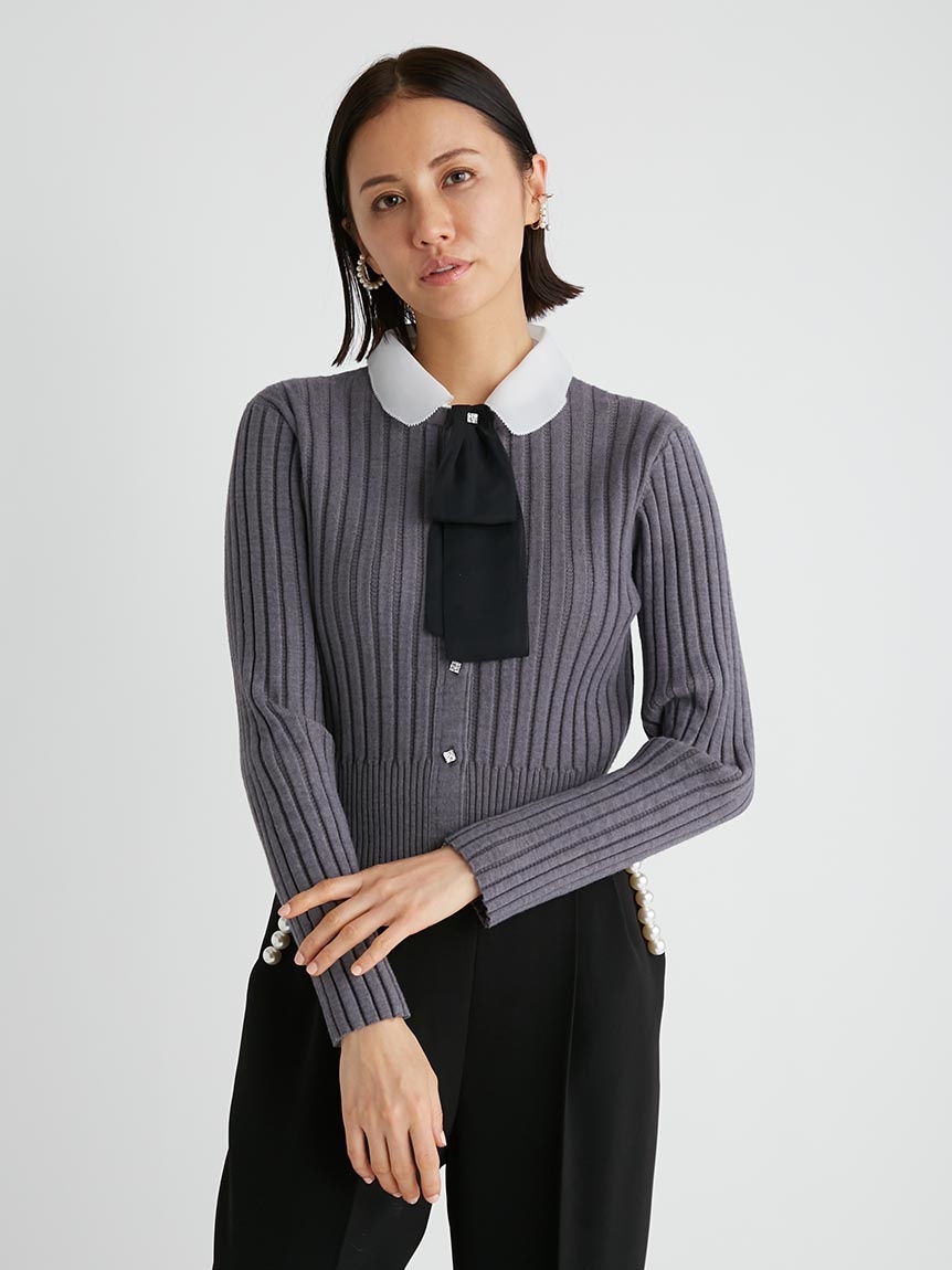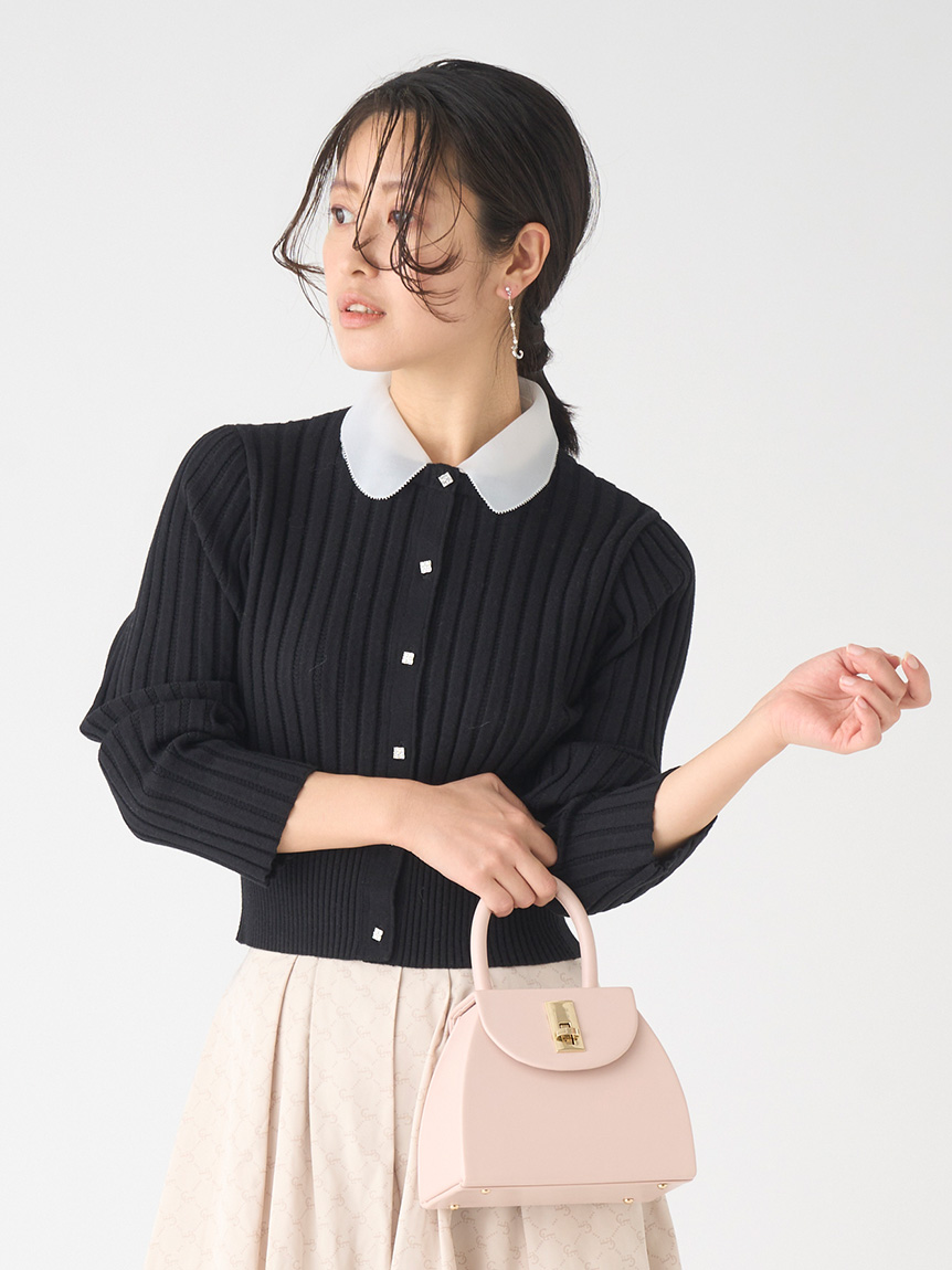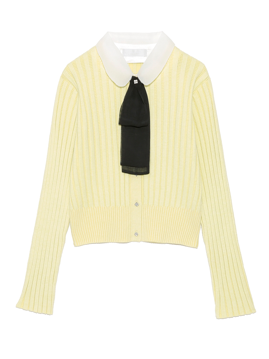 4つ石の入ったビジューボタンを使用していて取り外し可能のシフォンリボンを一番上のボタンに通していただくとリボン付きのブラウスと重ね着している様なデザインになります。