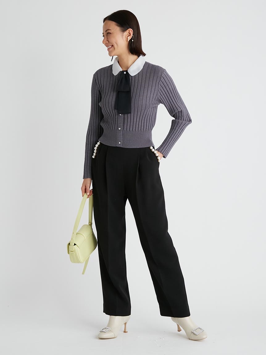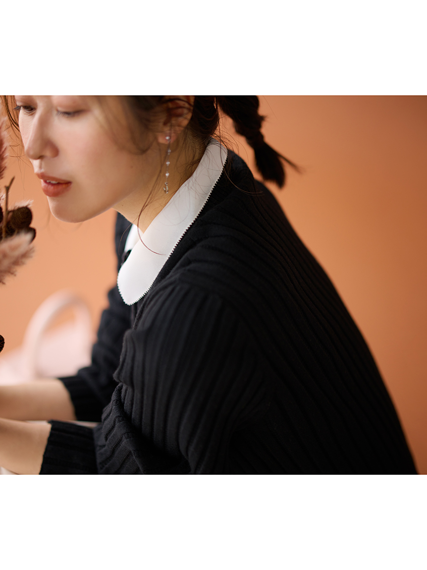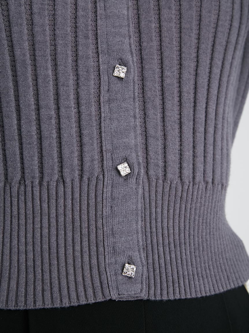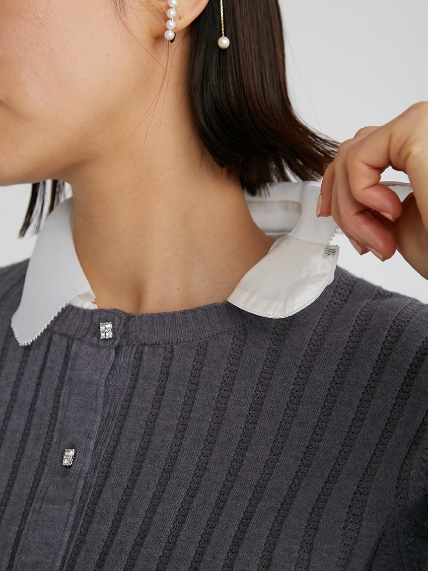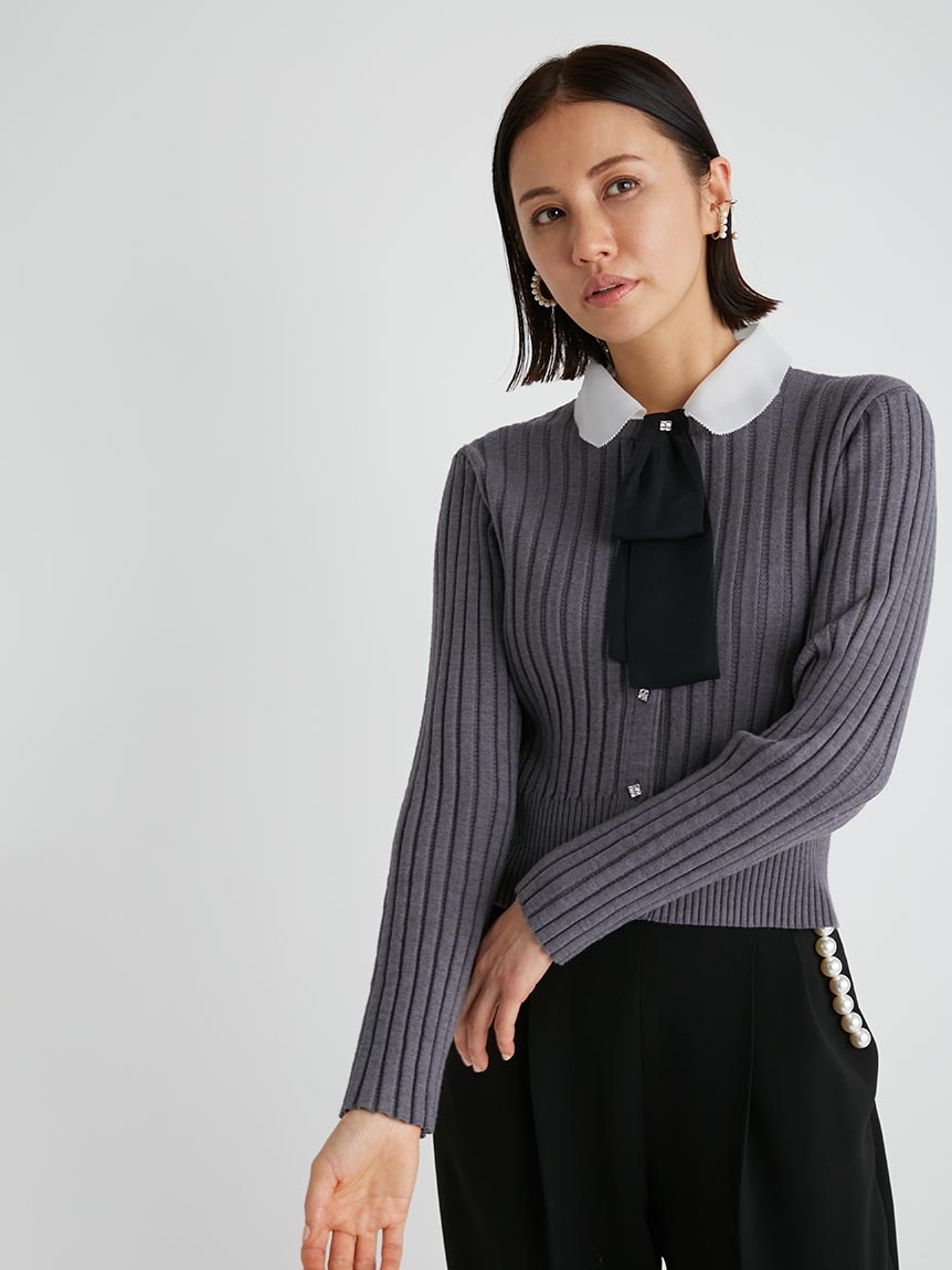 4つ石の入ったビジューボタンを使用していて取り外し可能のシフォンリボンを一番上のボタンに通していただくとリボン付きのブラウスと重ね着している様なデザインになります。