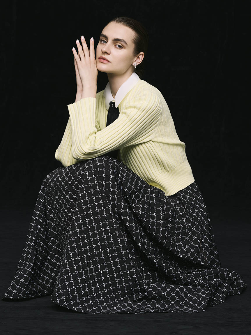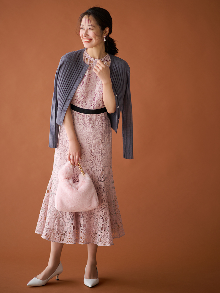 本体は凹凸のある柄編みで奥のへこんでいる部分は縦に2列アイレットを入れていて見た目の軽さを出しています。