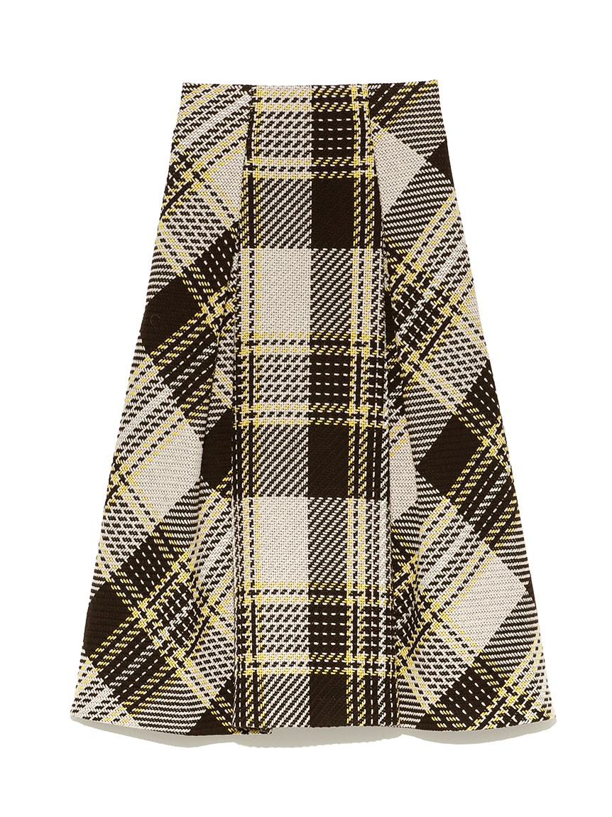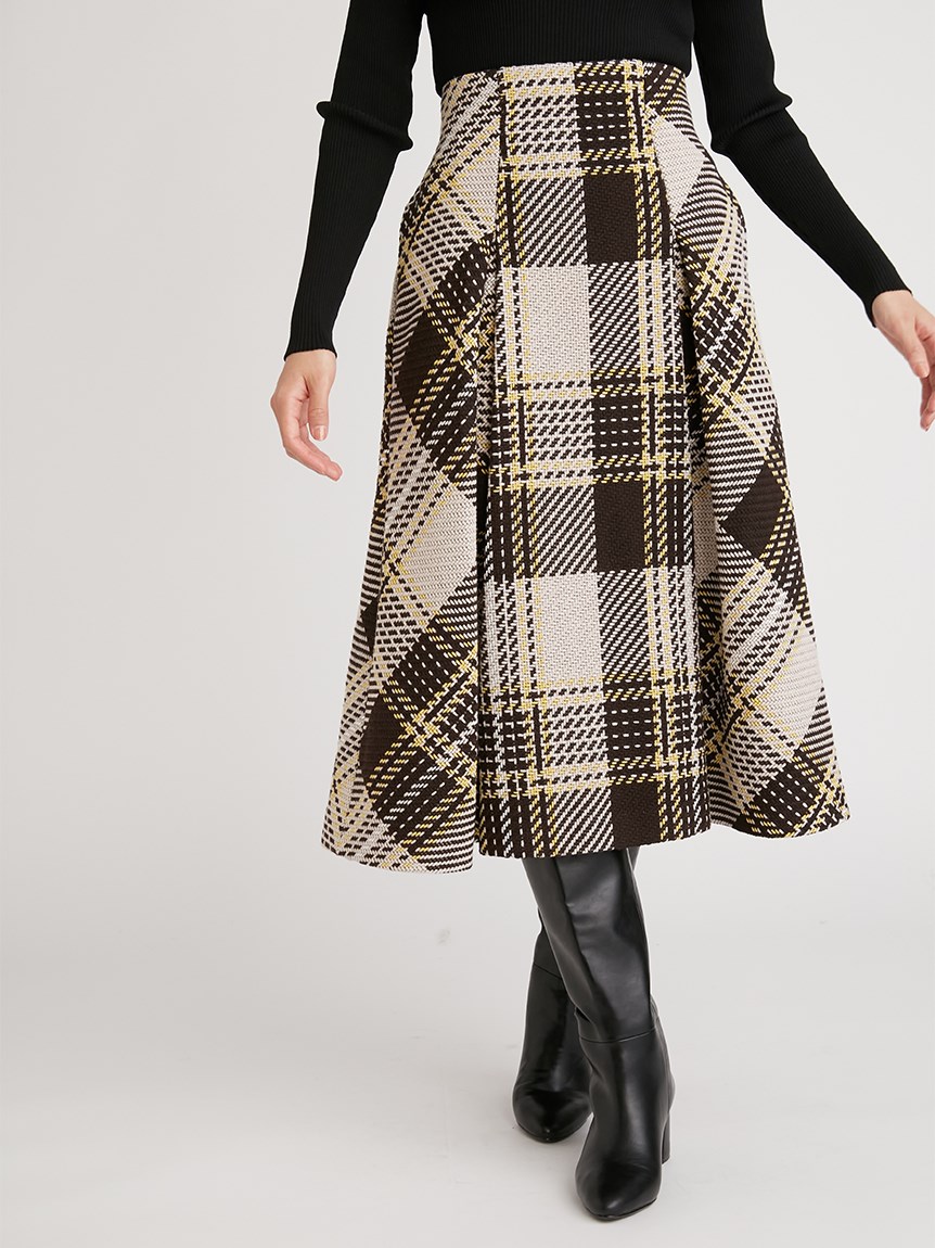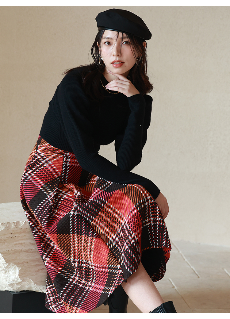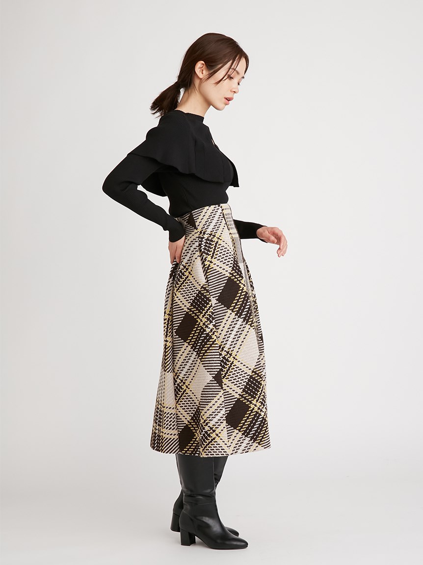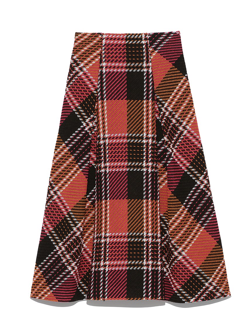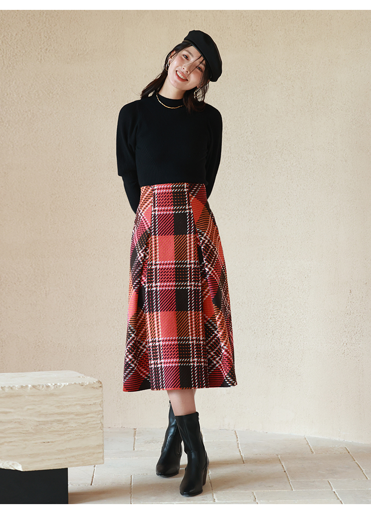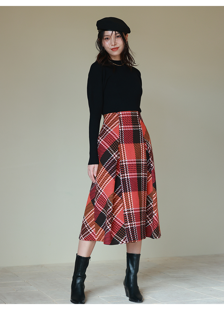 「SNIDEL」定番のロービングチェックスカート。昨シーズンより丈をやや短くし今年らしくアップデートしました。シーズンムード溢れるクラシカルなルックスがスタイリングの品格を高める1着です。両サイドにタックを効かせ女性らしい立体的なフレアシルエットをメイク。トップスをインしてもすっきりと着こなせるハイウエスト仕様で、スタイルアップ効果も期待できます。