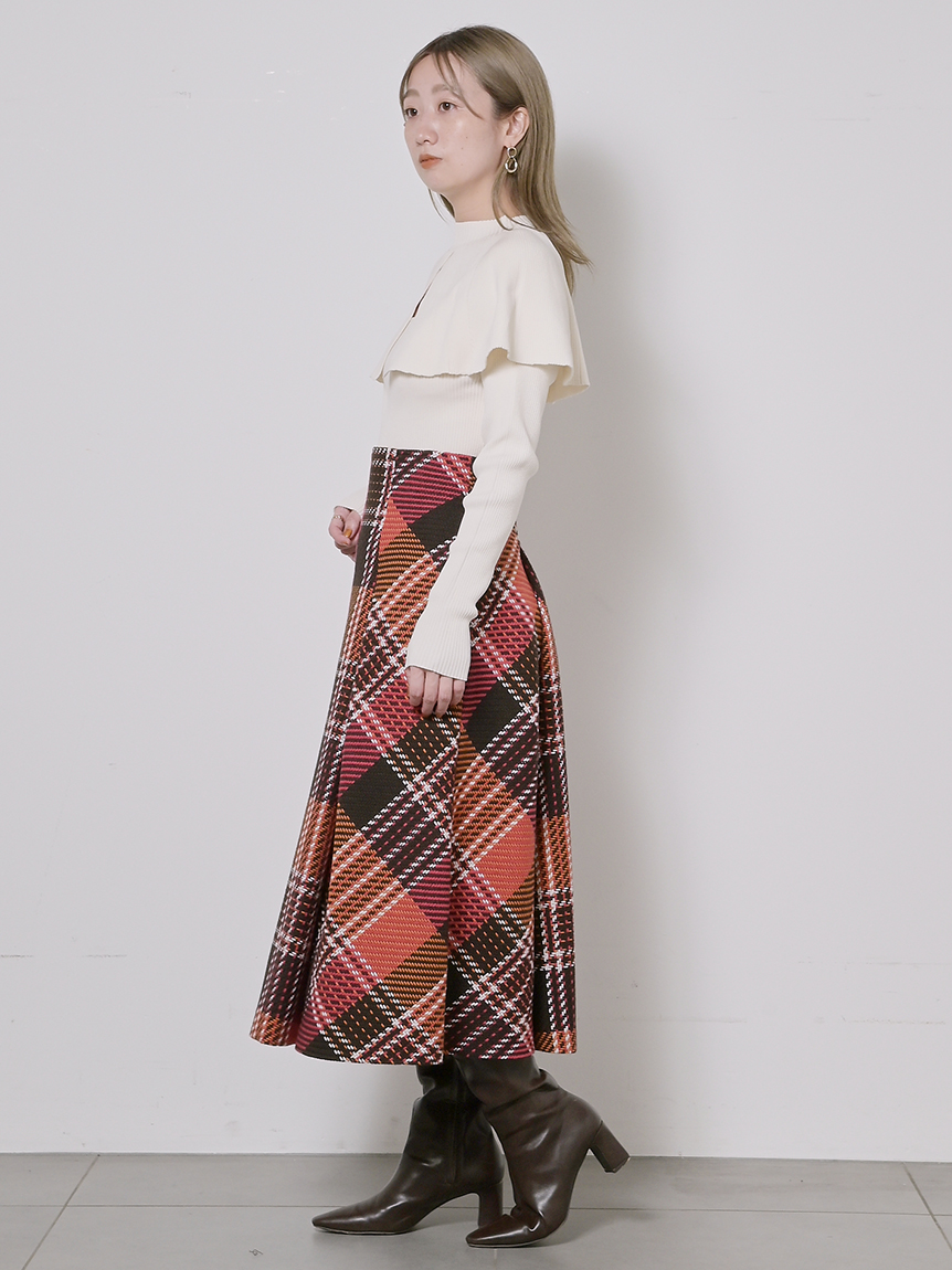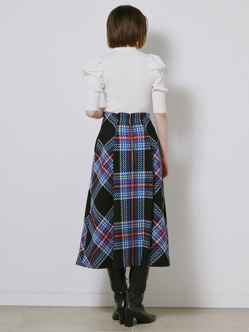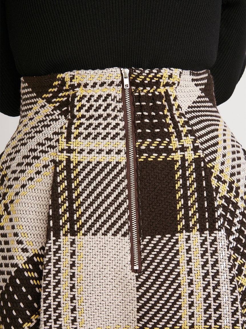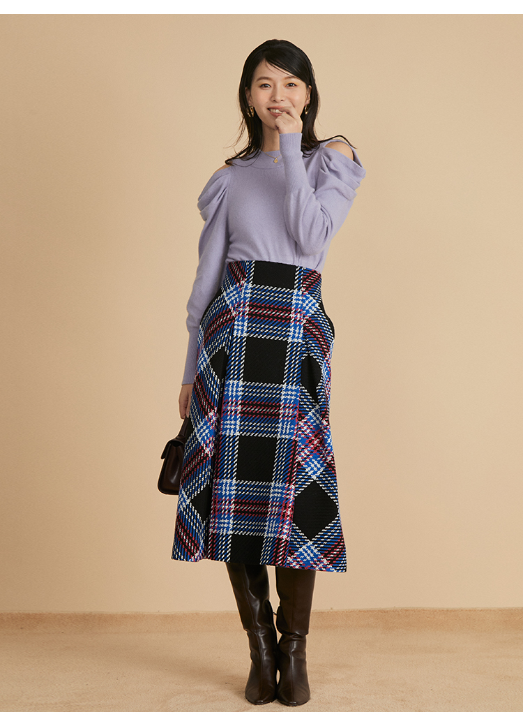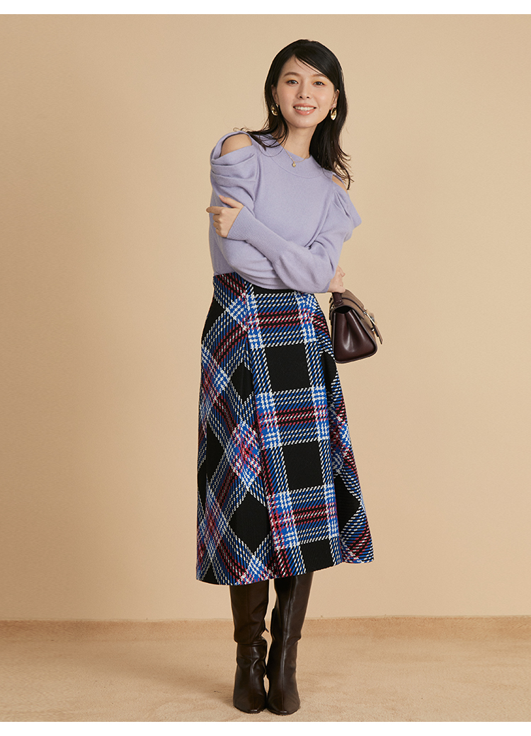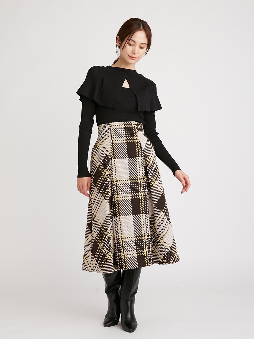 「SNIDEL」定番のロービングチェックスカート。昨シーズンより丈をやや短くし今年らしくアップデートしました。シーズンムード溢れるクラシカルなルックスがスタイリングの品格を高める1着です。両サイドにタックを効かせ女性らしい立体的なフレアシルエットをメイク。トップスをインしてもすっきりと着こなせるハイウエスト仕様で、スタイルアップ効果も期待できます。