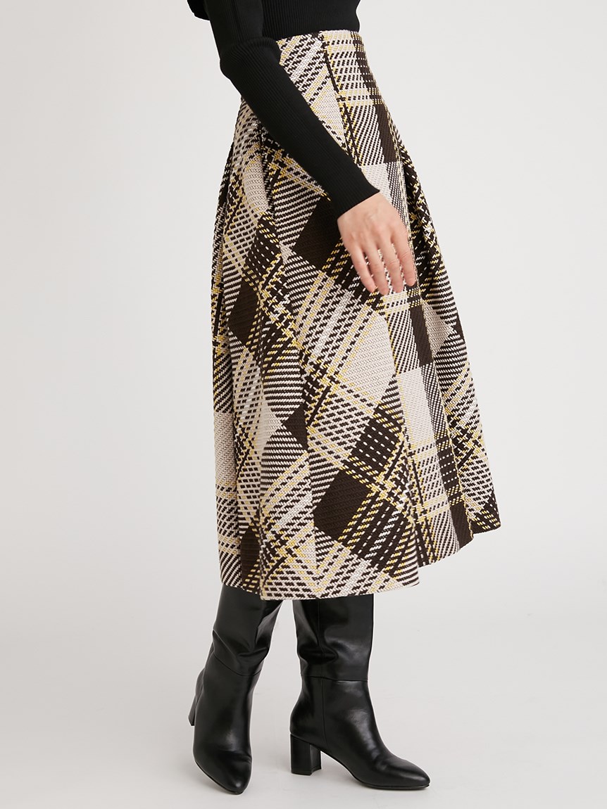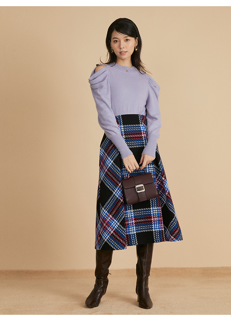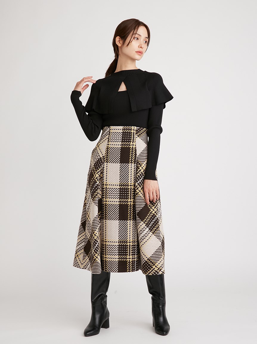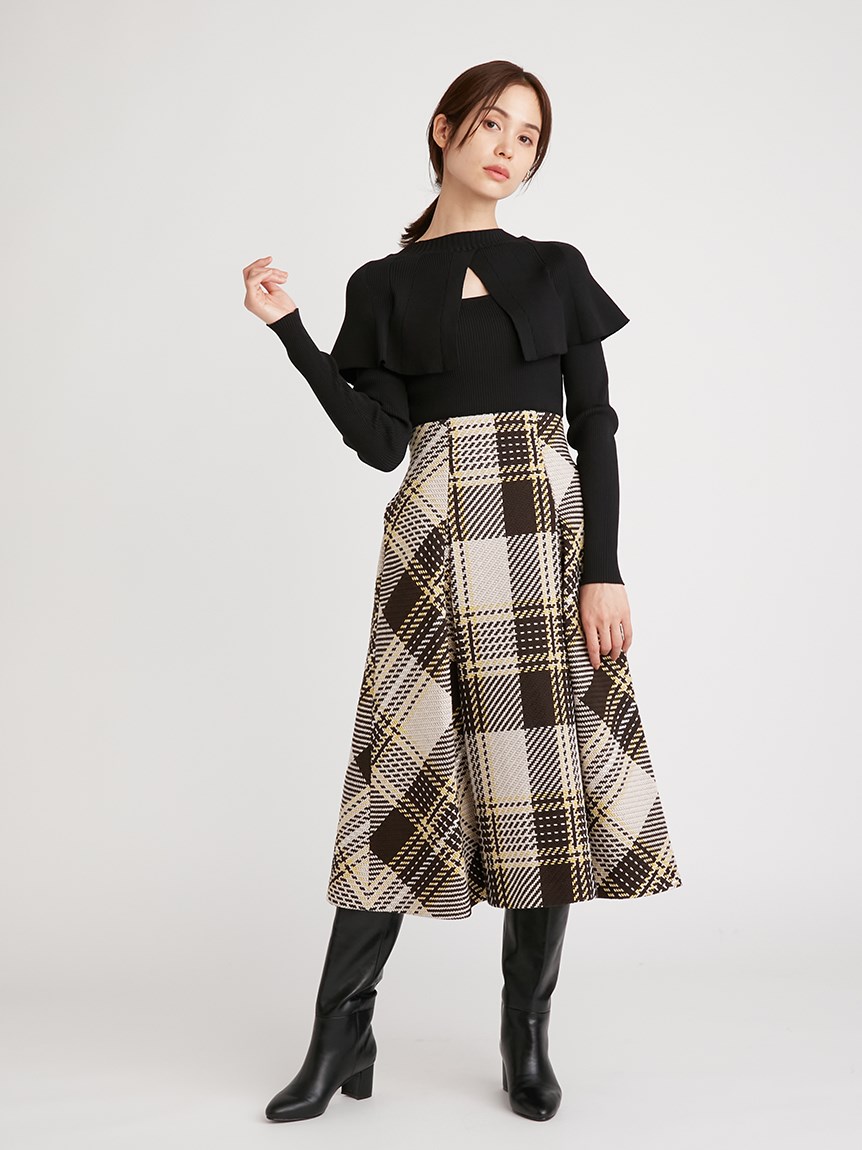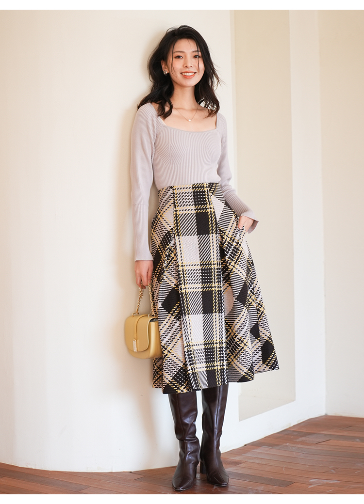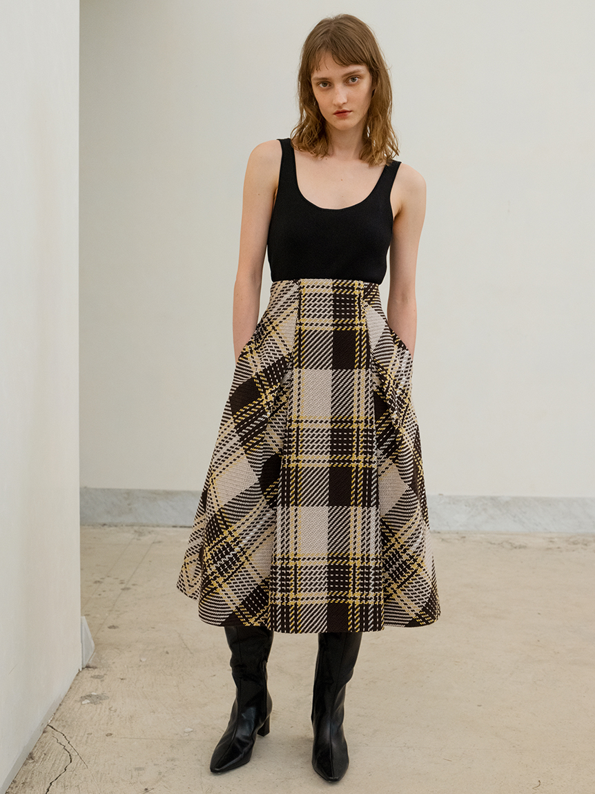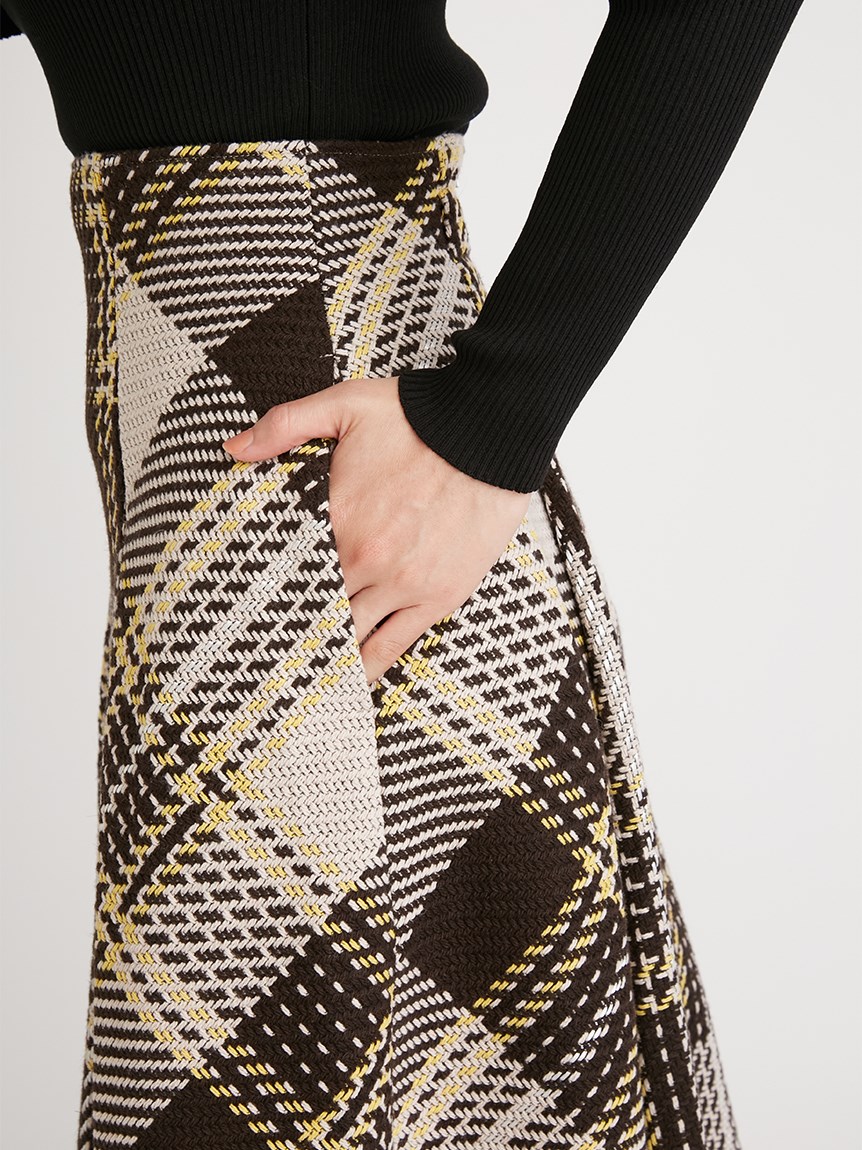 「SNIDEL」定番のロービングチェックスカート。昨シーズンより丈をやや短くし今年らしくアップデートしました。シーズンムード溢れるクラシカルなルックスがスタイリングの品格を高める1着です。両サイドにタックを効かせ女性らしい立体的なフレアシルエットをメイク。トップスをインしてもすっきりと着こなせるハイウエスト仕様で、スタイルアップ効果も期待できます。