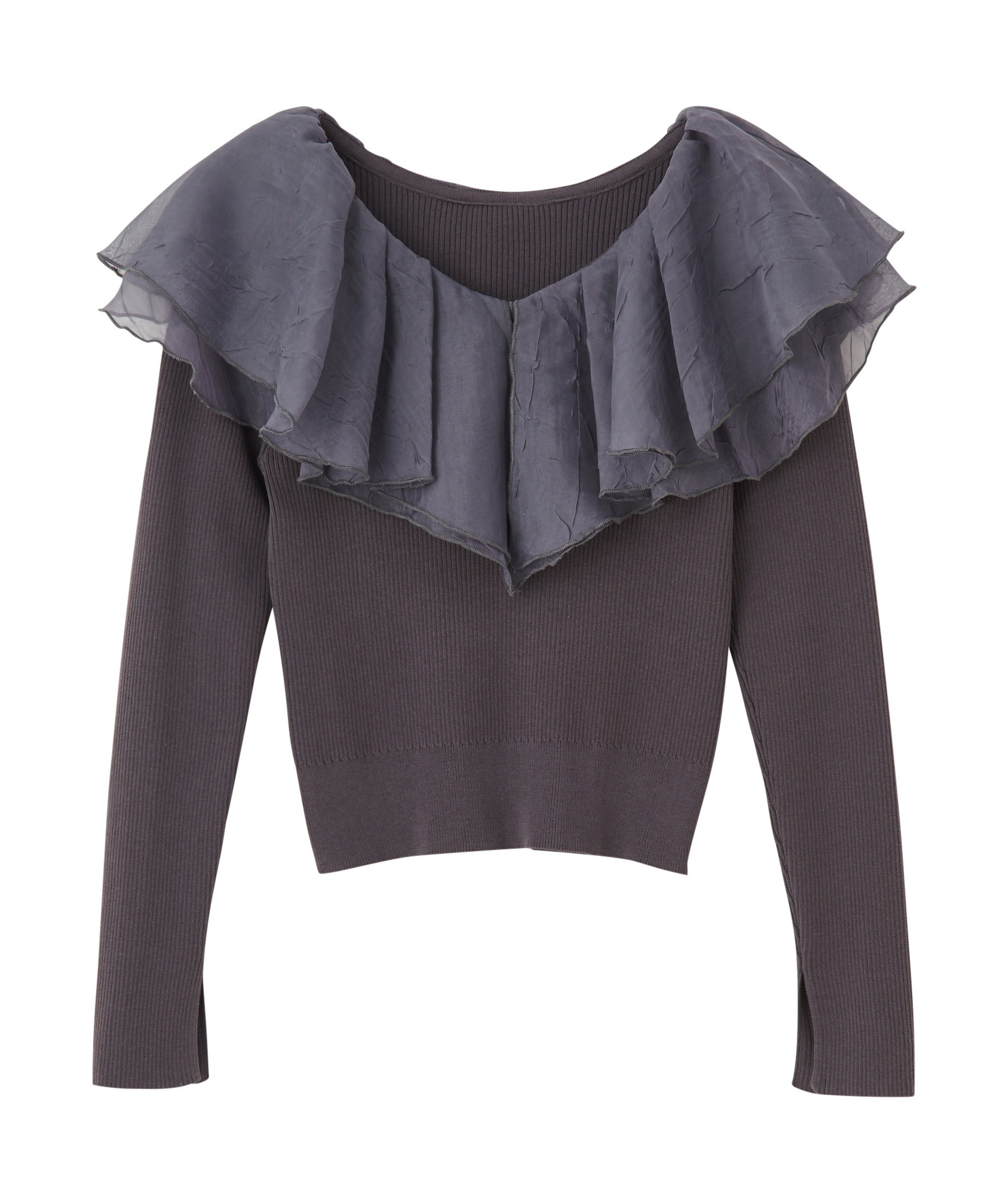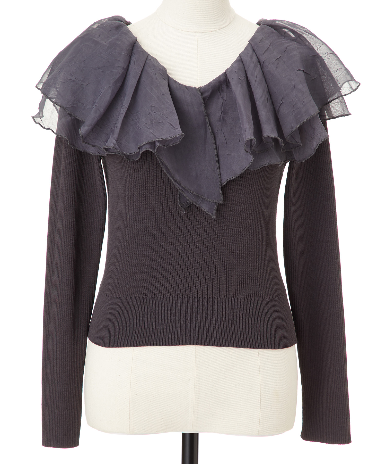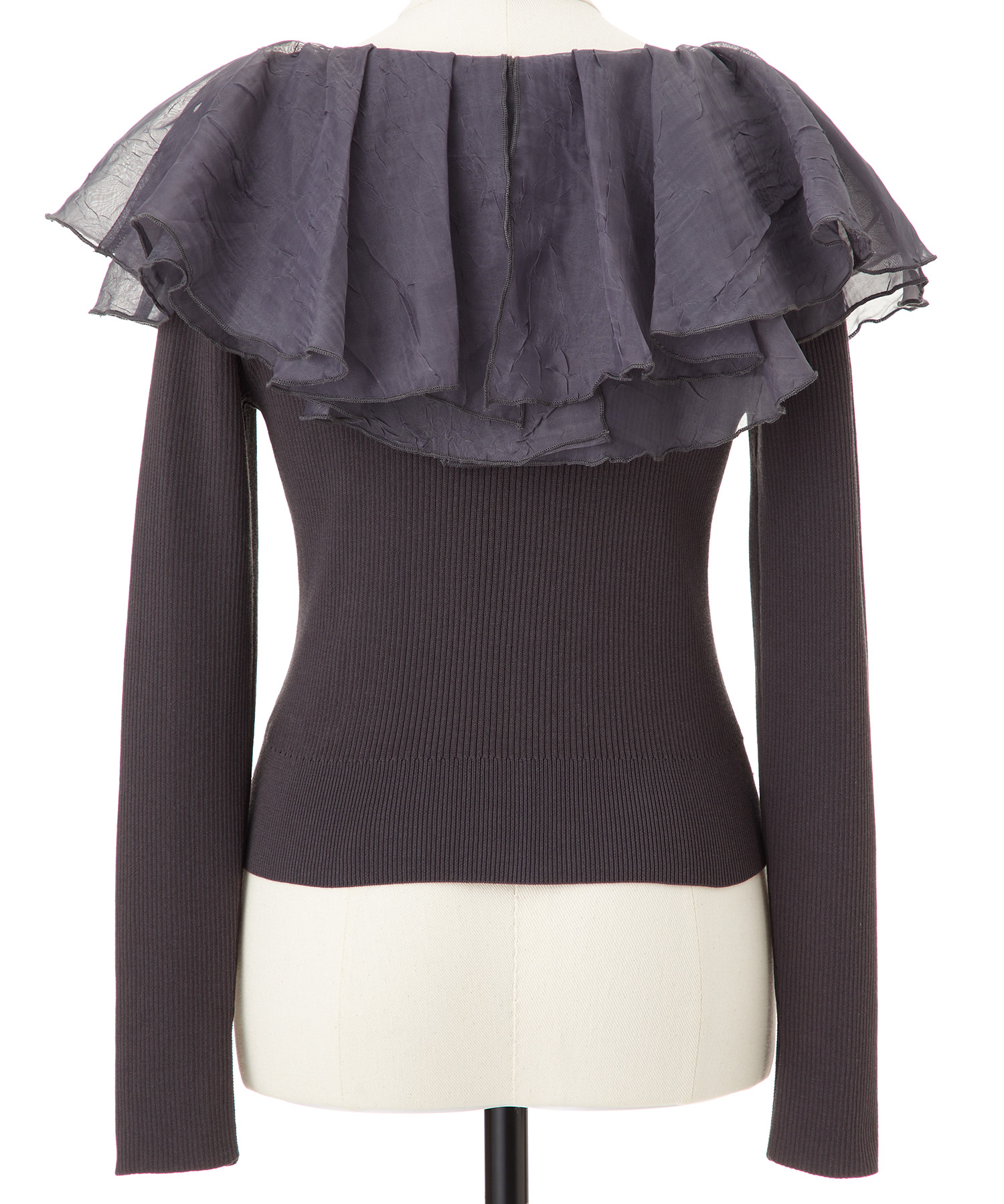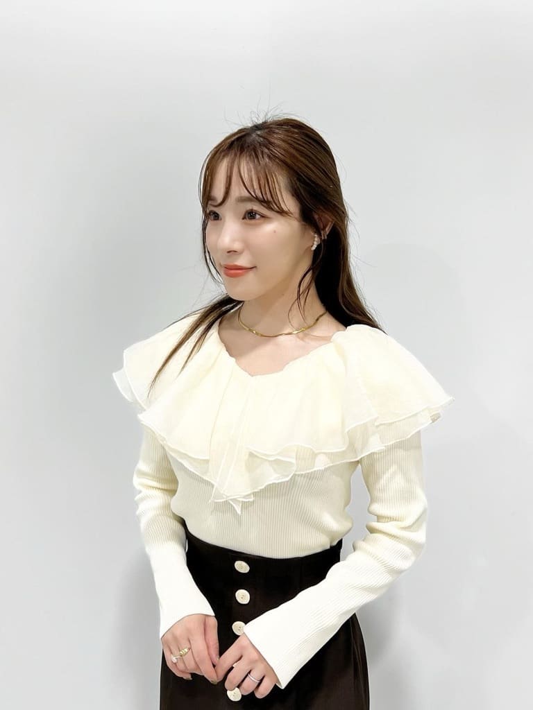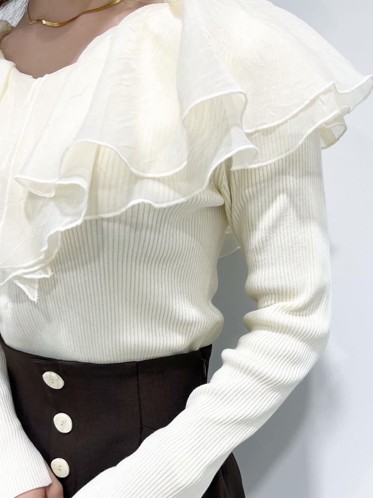 シアー感のある布帛フリルをドッキングしているブラウスライクなニットトップスです。オーガンジーのフリルを2層重ねてふんわりと動きのある衿に仕上げています。ニットは柔らかいリブ編みでフィット感がちょうど良く、ボディラインを細く見せるデザインになっています。短め丈でハイウエストボトムにタックインしてもすっきり着こなせます。 サイズ 総丈 肩幅 身幅 袖丈 48 32 35 38
